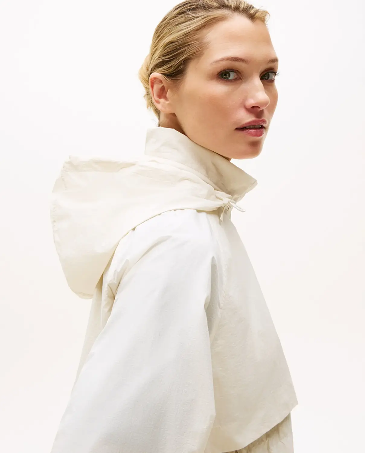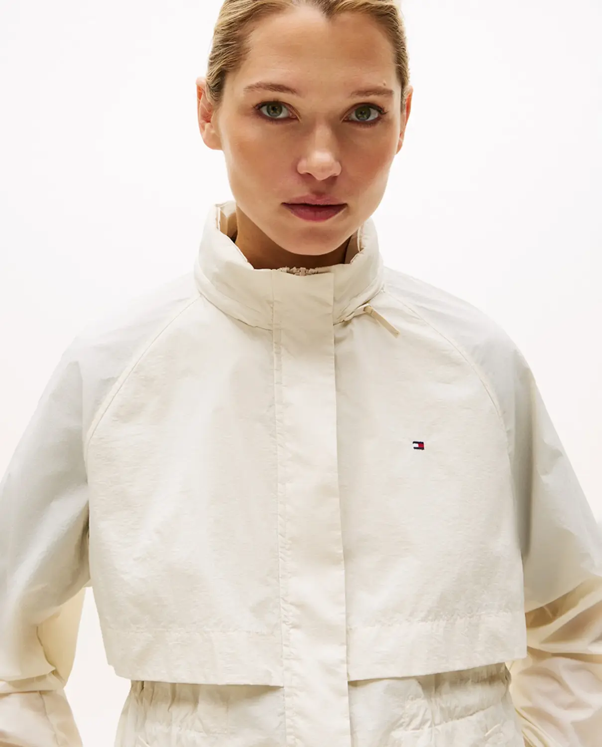 Женский дождевик с двухслойным дизайном. Узкий в талии и с высоким воротником и складным капюшоном. Застежка на молнии спереди и карманы по бокам. Вышитый флаг на груди.