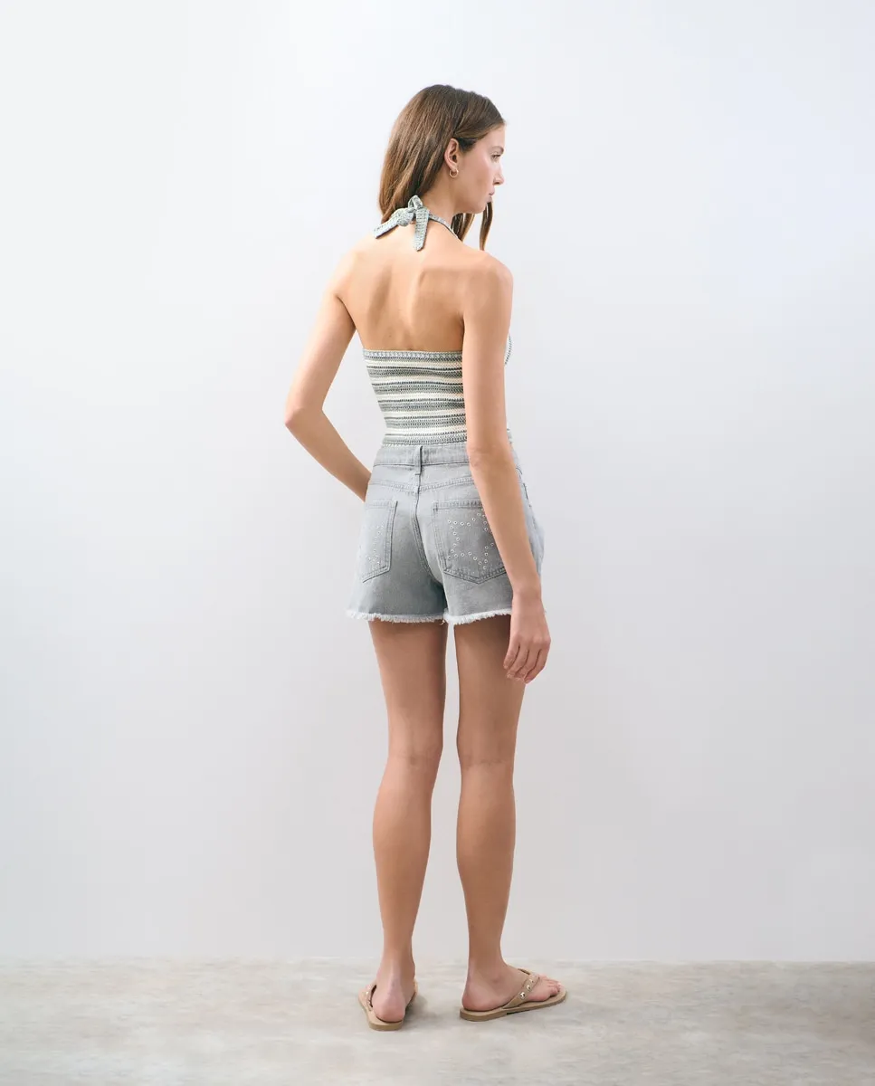 Кружевной топ с полосками и завязкой на шее.