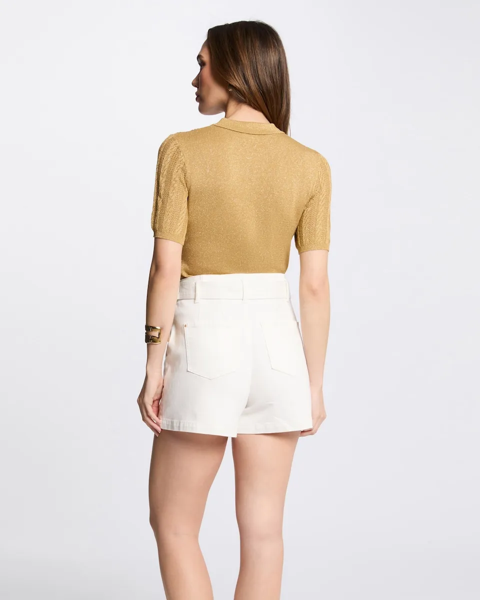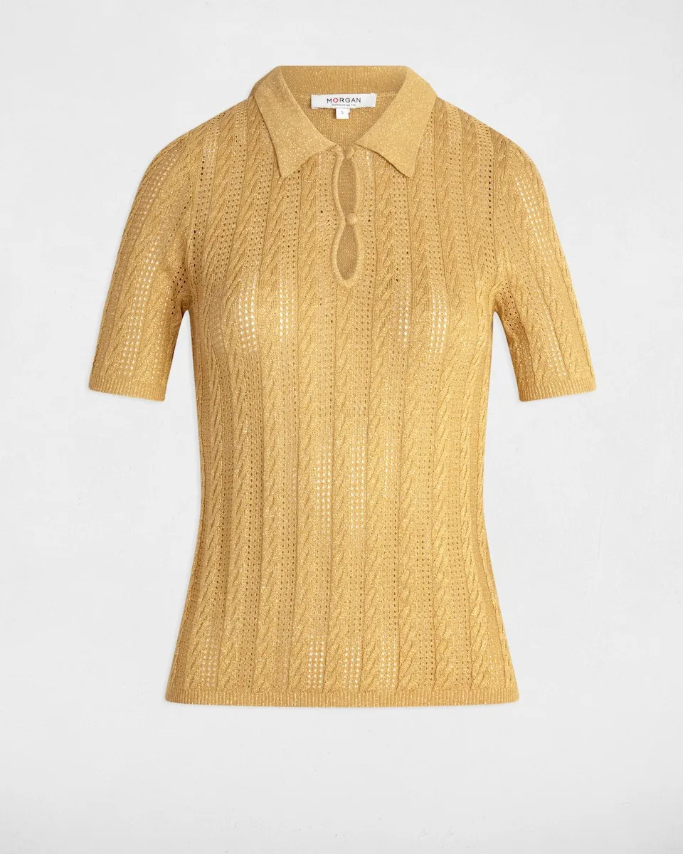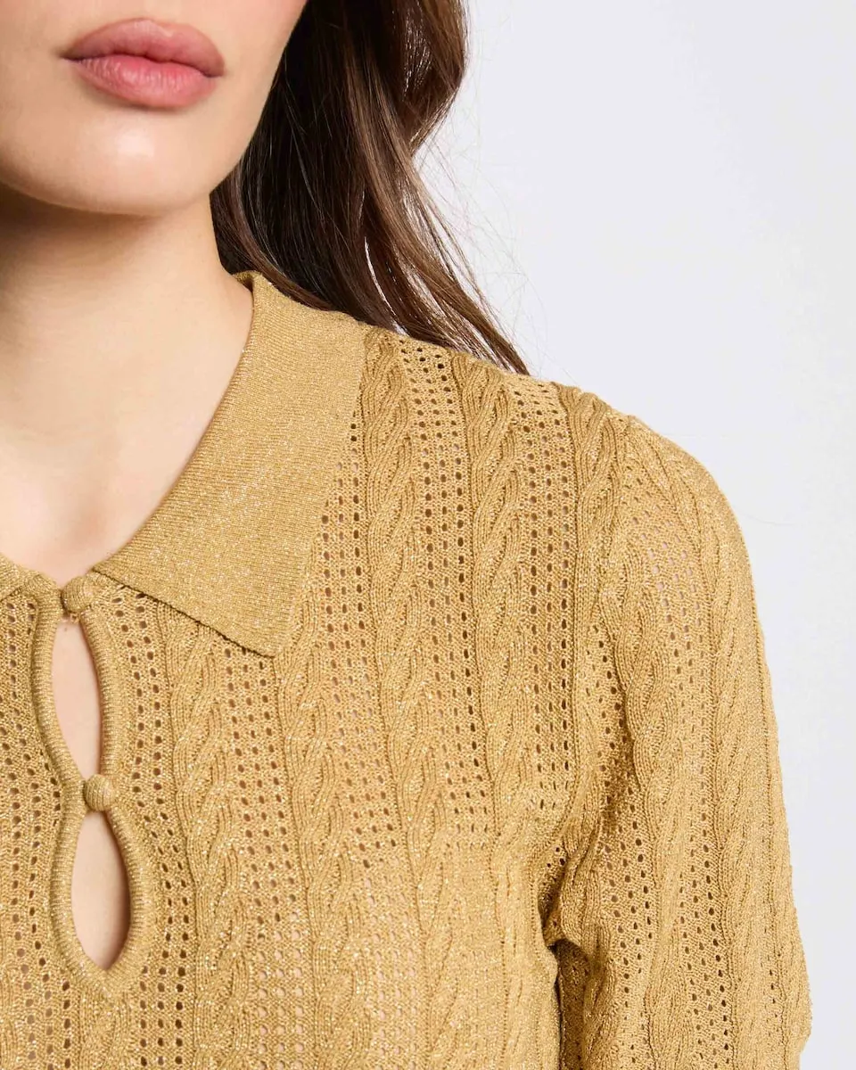Джемпер с воротником типа поло. Приталенный крой. Воротник типа поло. Короткий рукав. Тонкая вязка. Коса. Прорезные детали. Закрытие на два пуговицы на воротнике. Декорирован металлическими нитями.