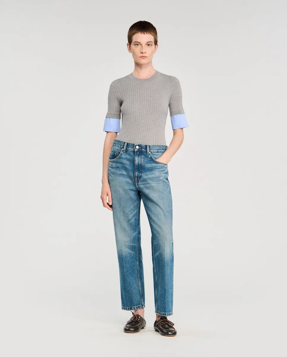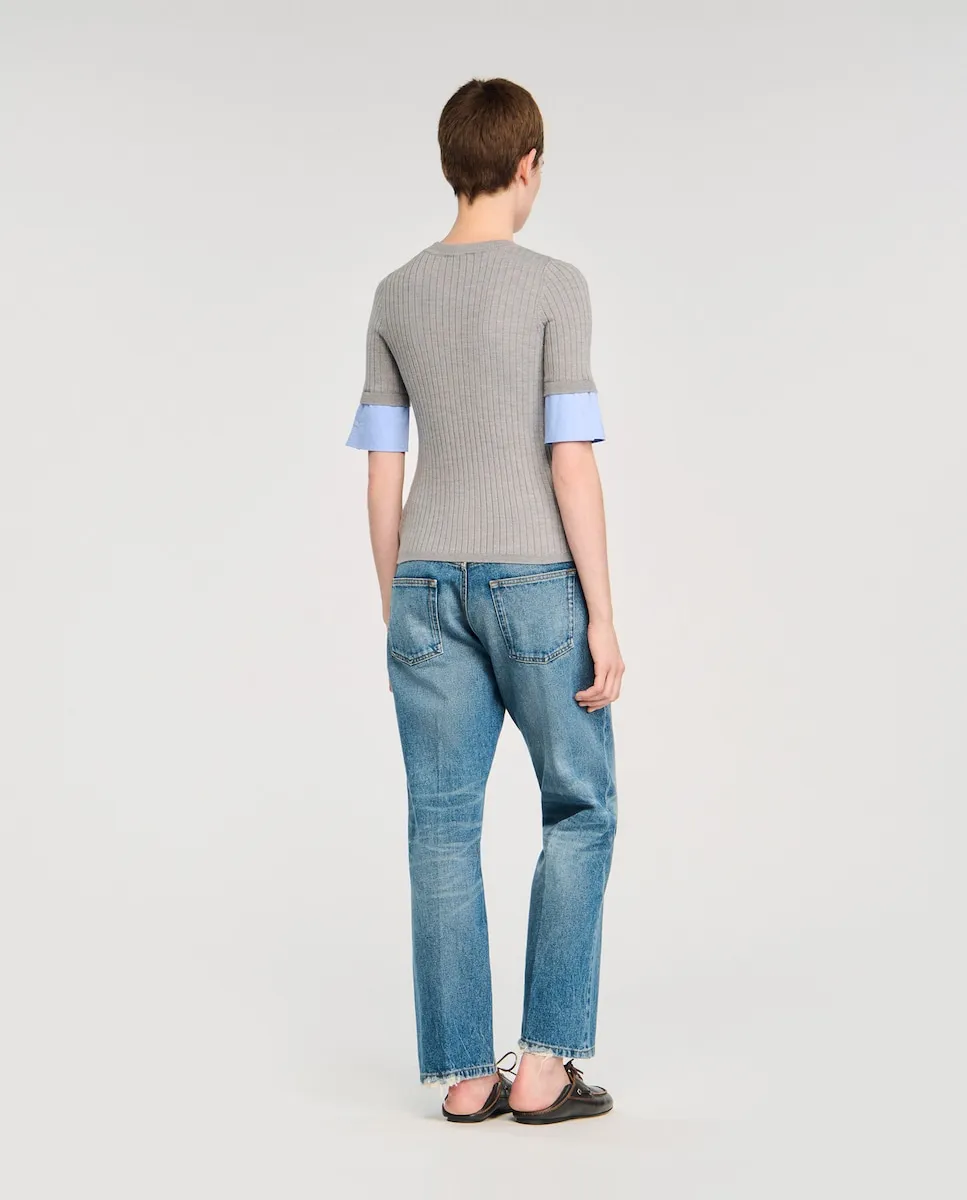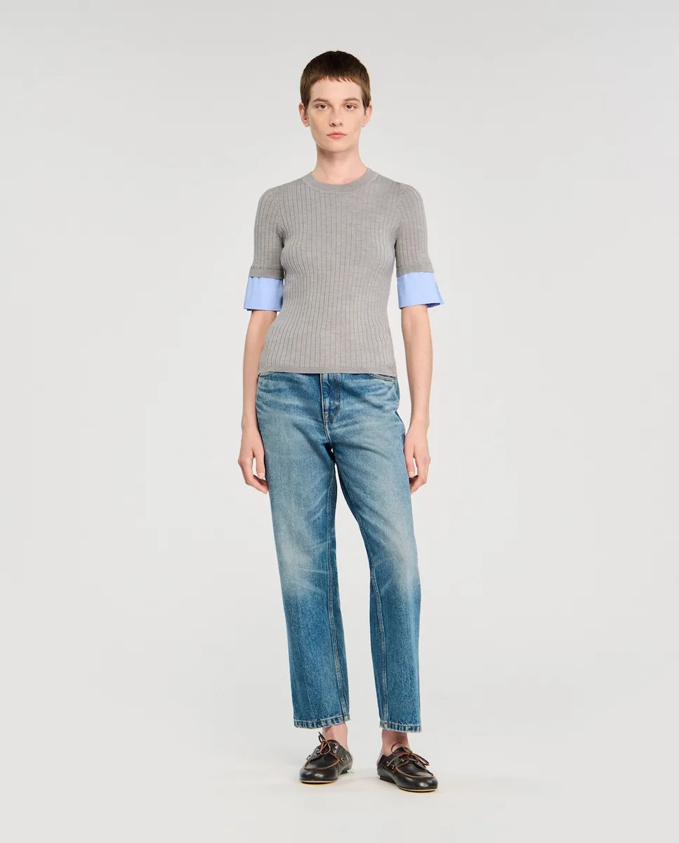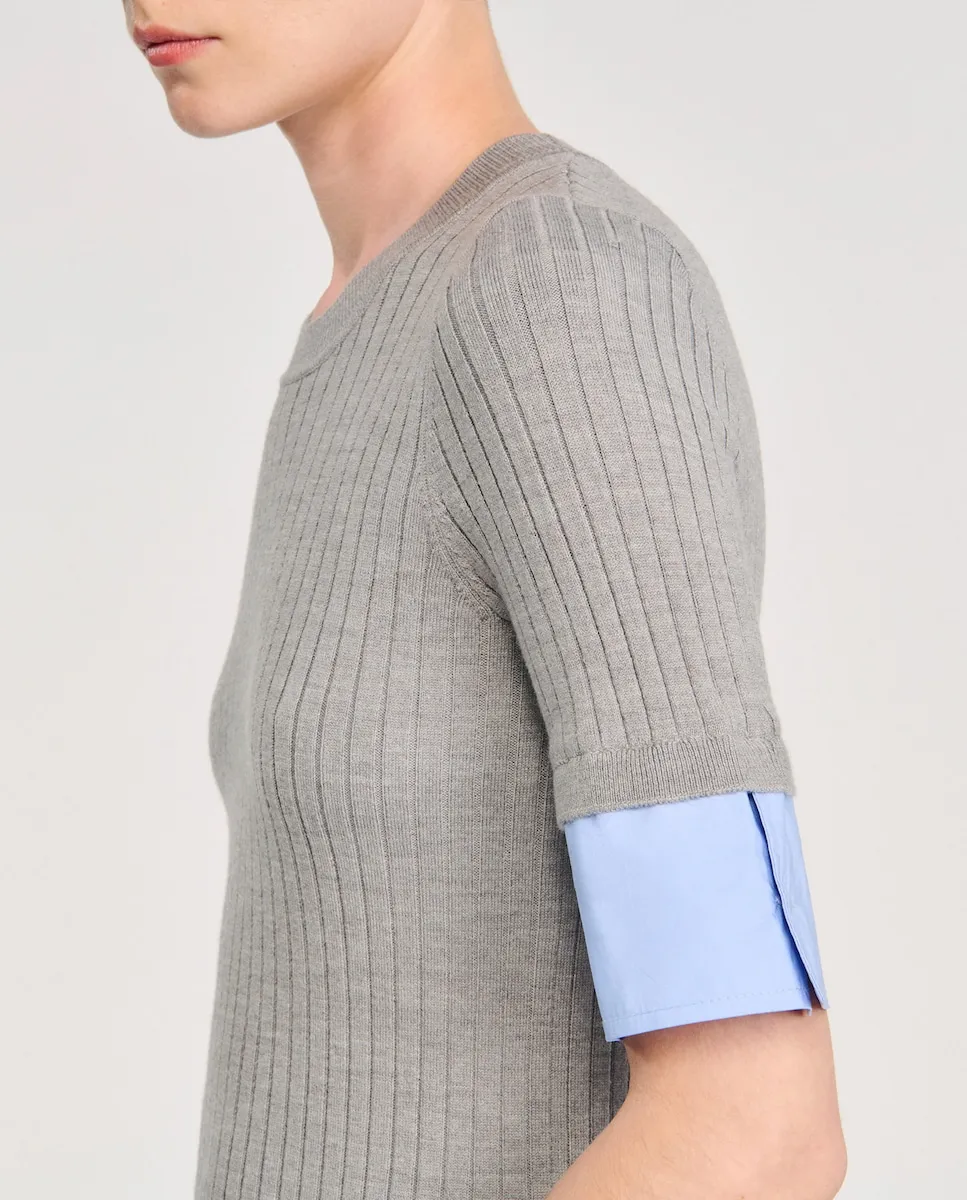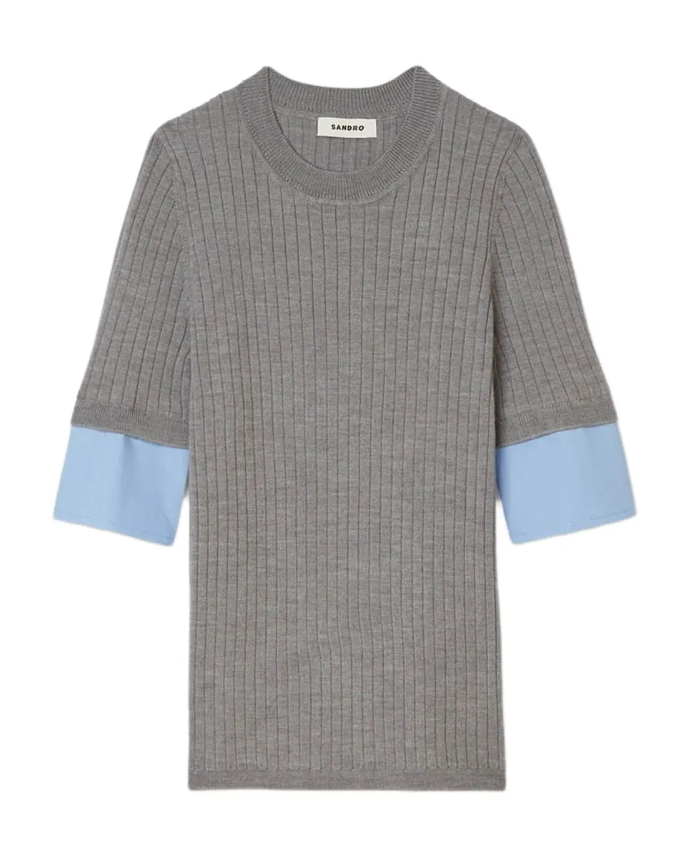 Тонкий вязаный джемпер с короткими рукавами и аппликациями из контрастной поплины. Тонкий вязаный джемпер Sandro для женщин. Круглый вырез. Короткие рукава. Аппликации из контрастной поплины.