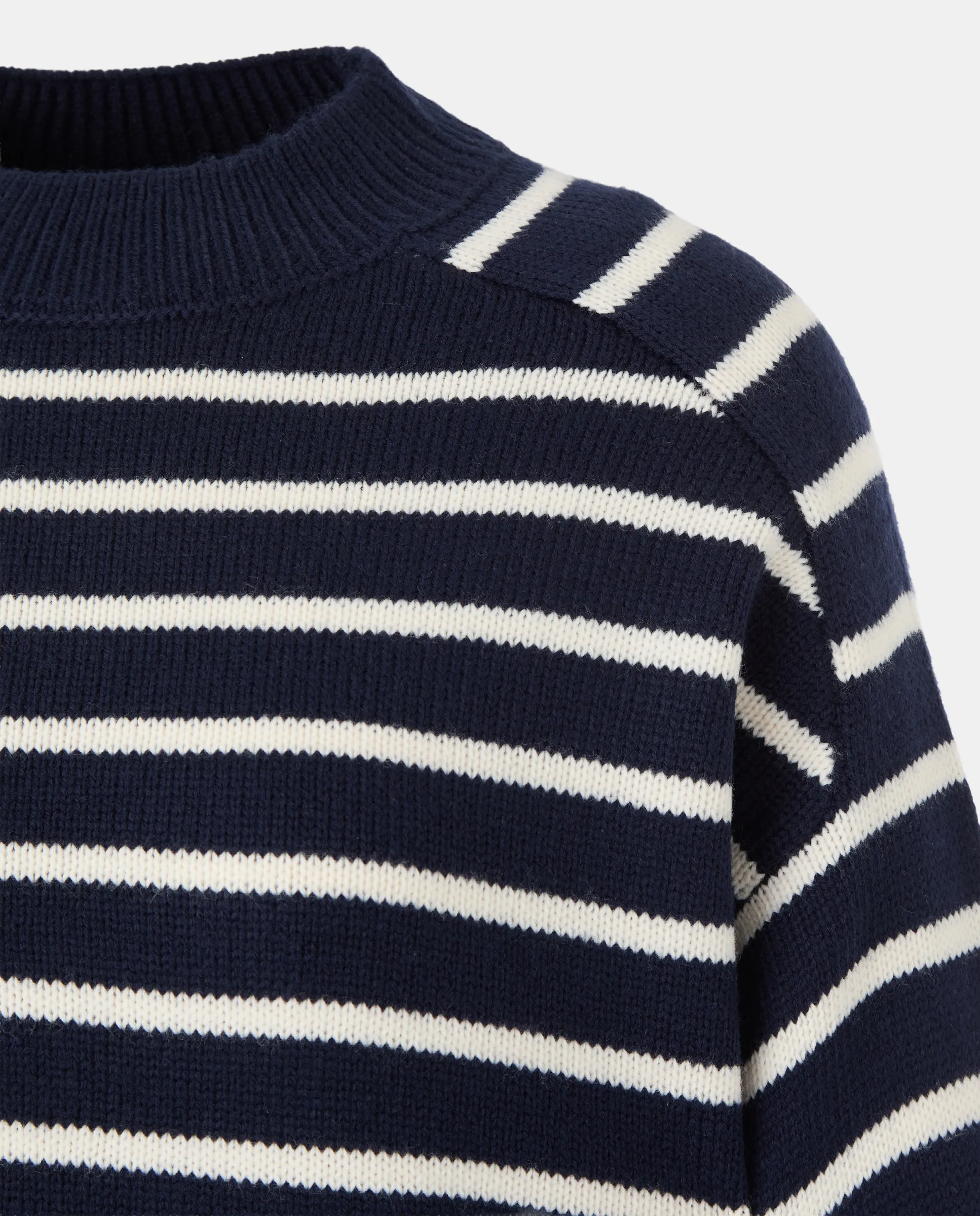 Джемпер с круглым вырезом и полосатым рисунком.