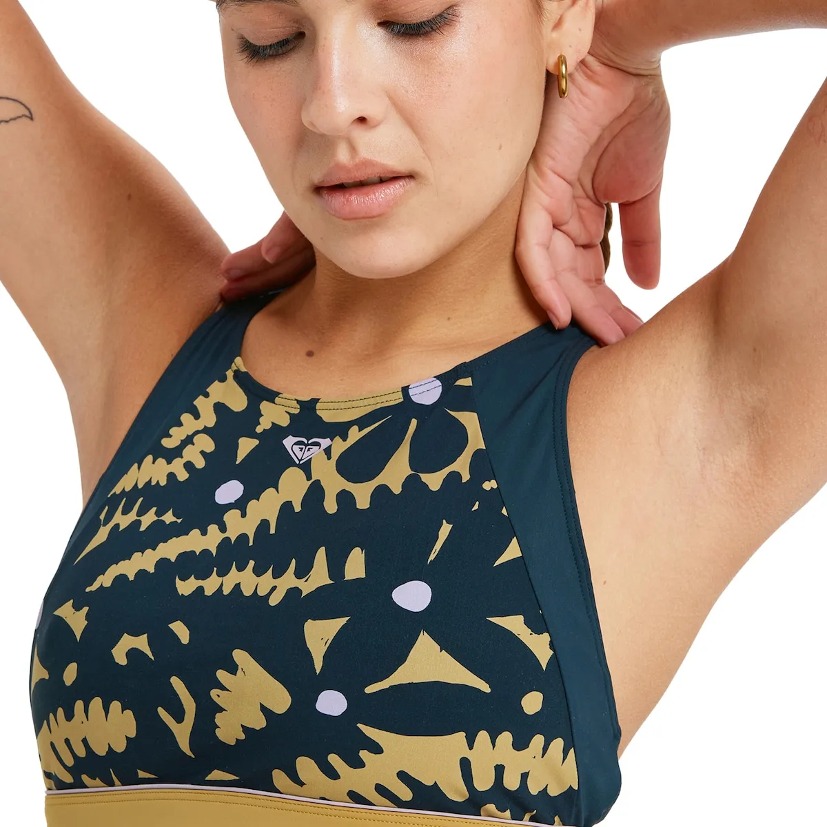 Топ бикини для женщин. Характеристики: Ткань: мягкий, переработанный, эластичный и устойчивый к хлору нейлон, Дизайн: кроп-топ, Поддержка: высокая, Удобство: съемные прокладки, Бретели: фиксированные бретели, Застежка: фиксированная, Размер чашки: лучше всего подходит для чашки A/B/C, Мягкая резинка под бюстом, Передняя часть с прочной сеткой для лучшей поддержки, Боковые панели однотонного цвета и логотип сердца Roxy на передней части.