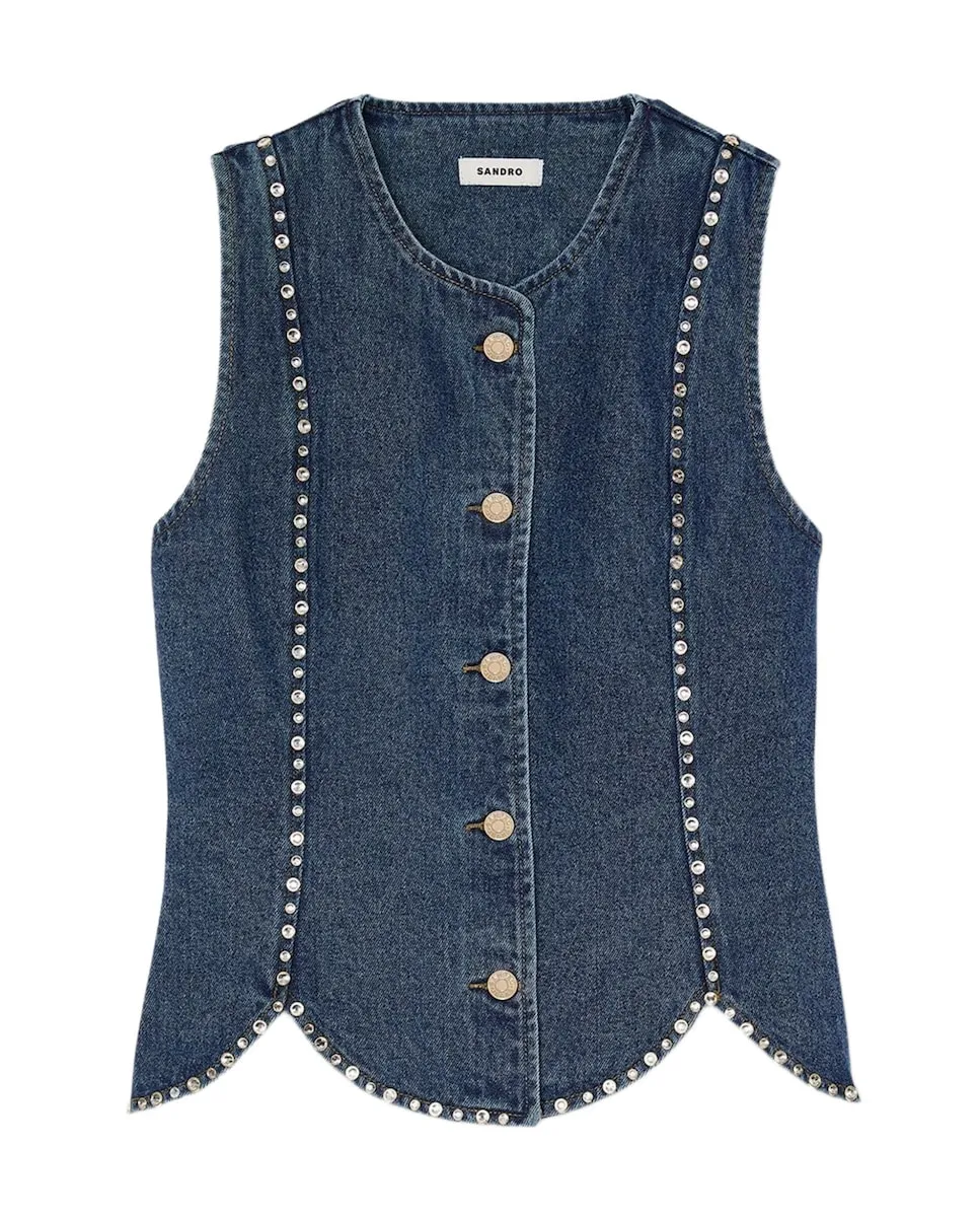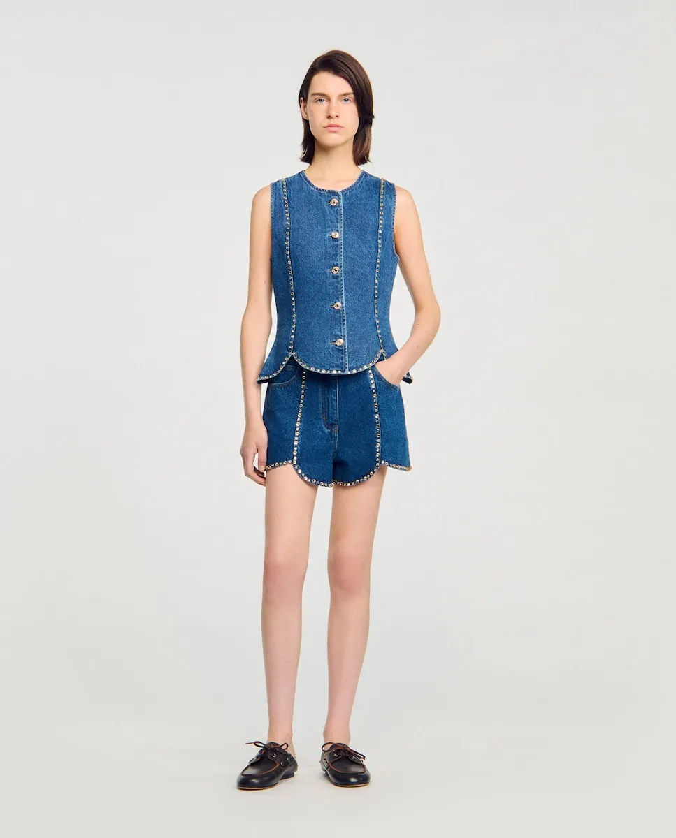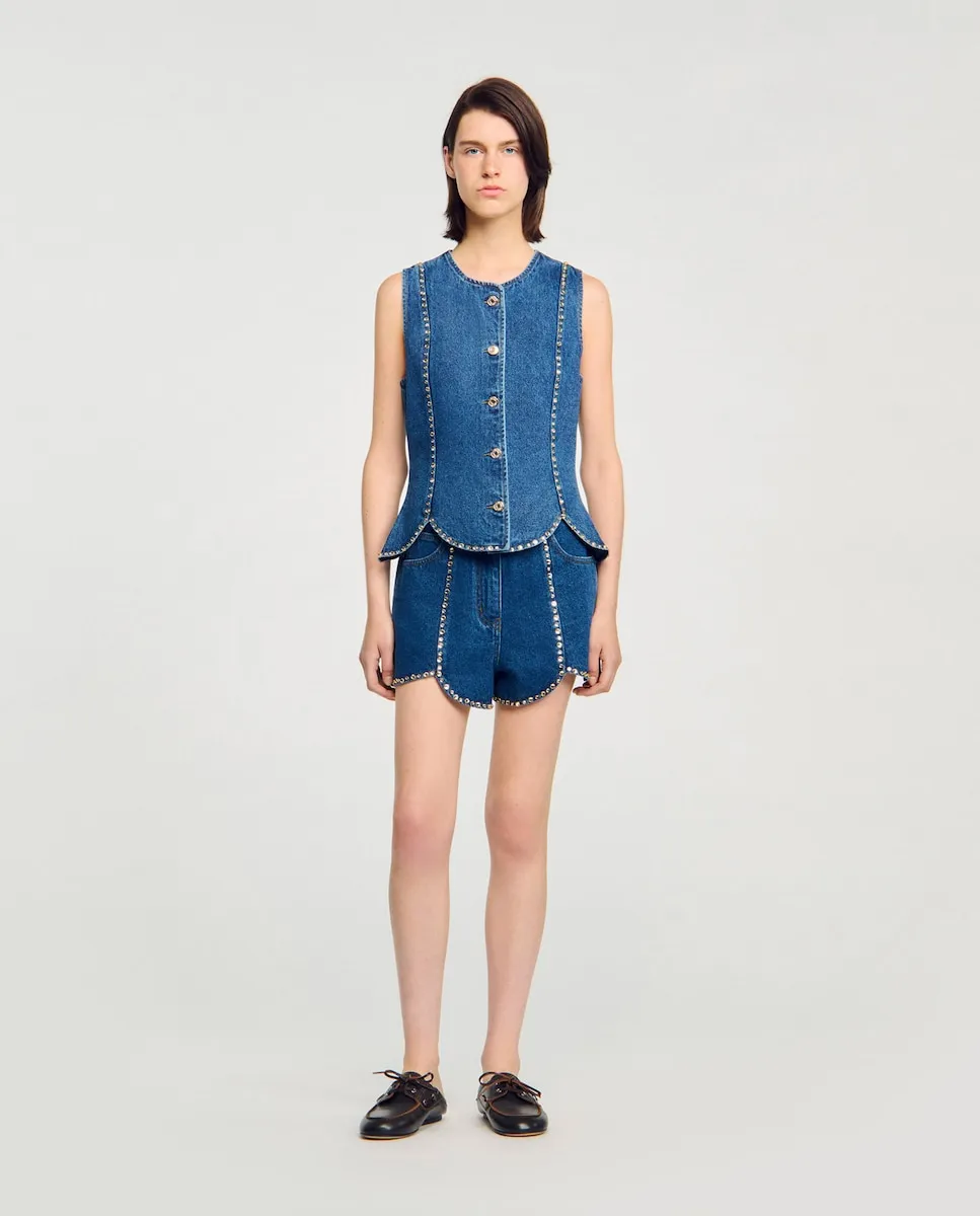 Обтягивающий джинсовый топ, украшенный стразами, с подолом в виде тюльпана и застежкой на кнопки. Джинсовый топ Sandro для женщин. Расклешенный подол в виде тюльпана. Застежка на кнопки. Обтягивающий дизайн.