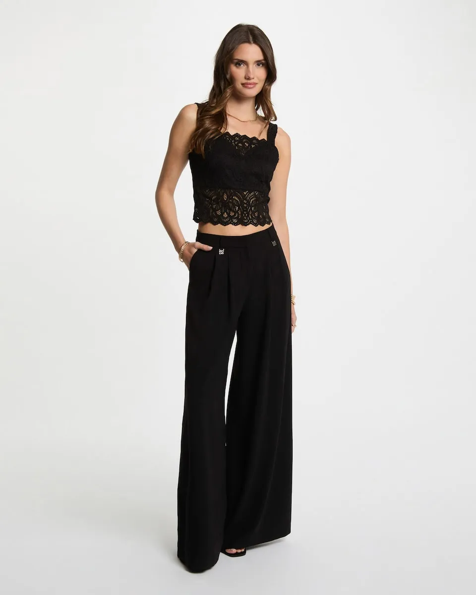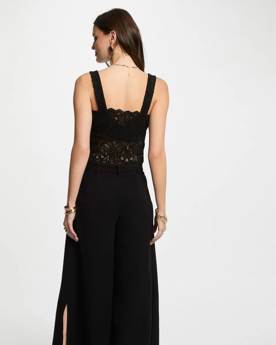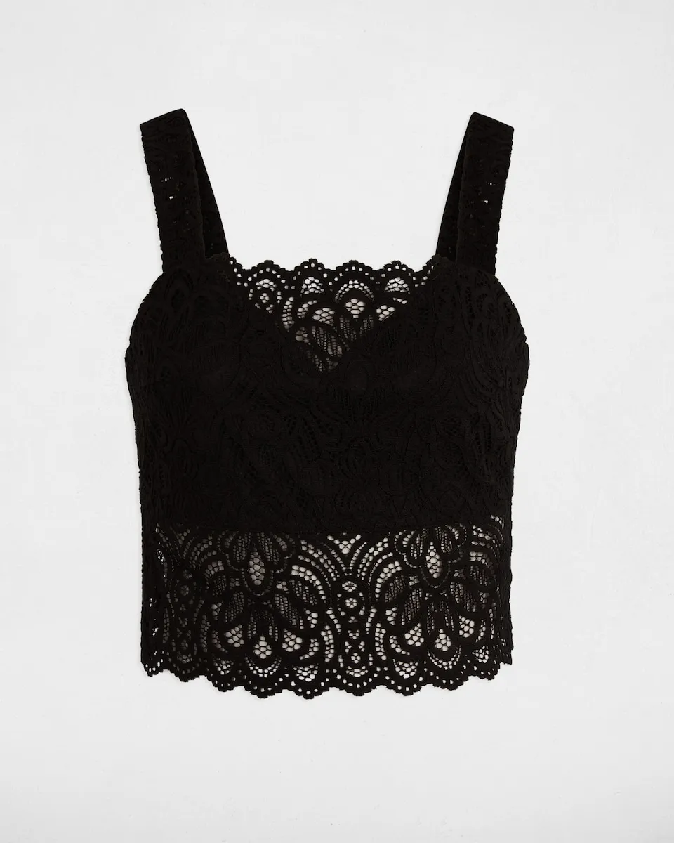 Широкие бретели. Обтягивающий крой. Квадратный вырез. Широкие бретели. Кроп-топ. Кружево с перфорацией. Зазубренный край на талии и вырезе.