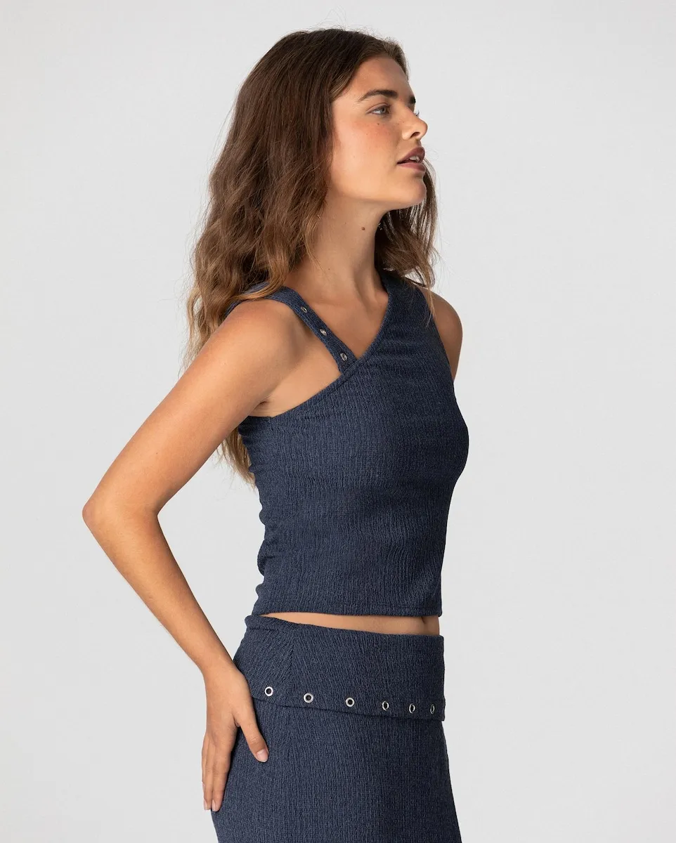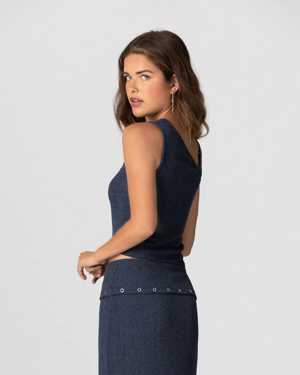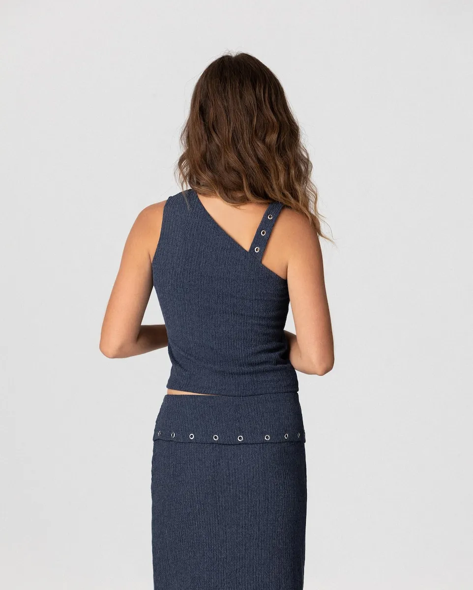 Топ без рукавов синего цвета, выполненный из эластичной ткани, которая идеально прилегает к телу, подчеркивая силуэт с комфортом. Включает элегантные золотые детали на плечах, придающие изысканный вид. Сочетайте его с юбкой миди MARTINA для создания стильного полного образа.