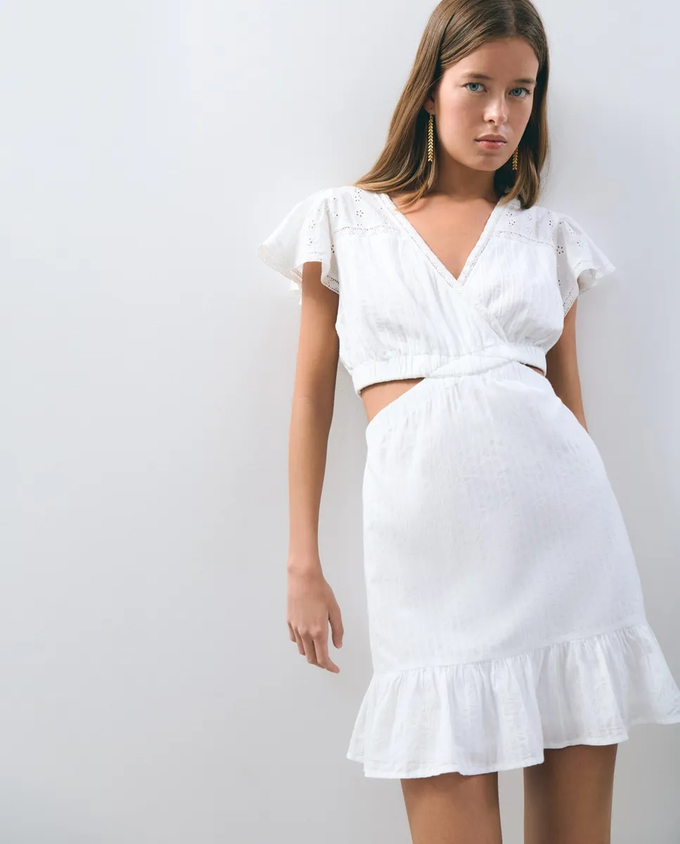 Короткое платье с короткими рукавами, вышивкой, V-образным вырезом и разрезами на талии.