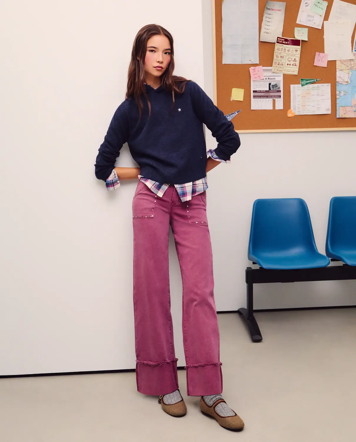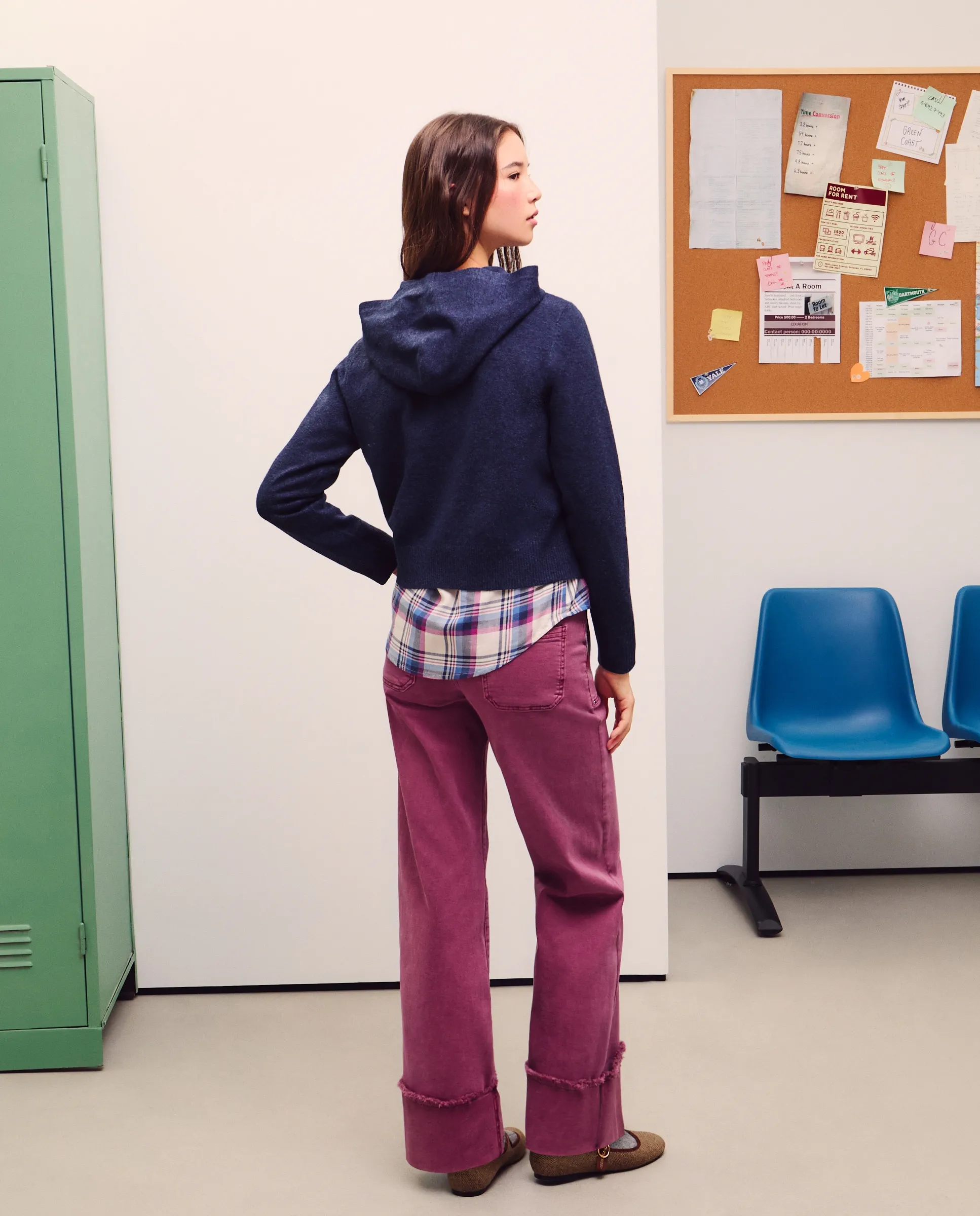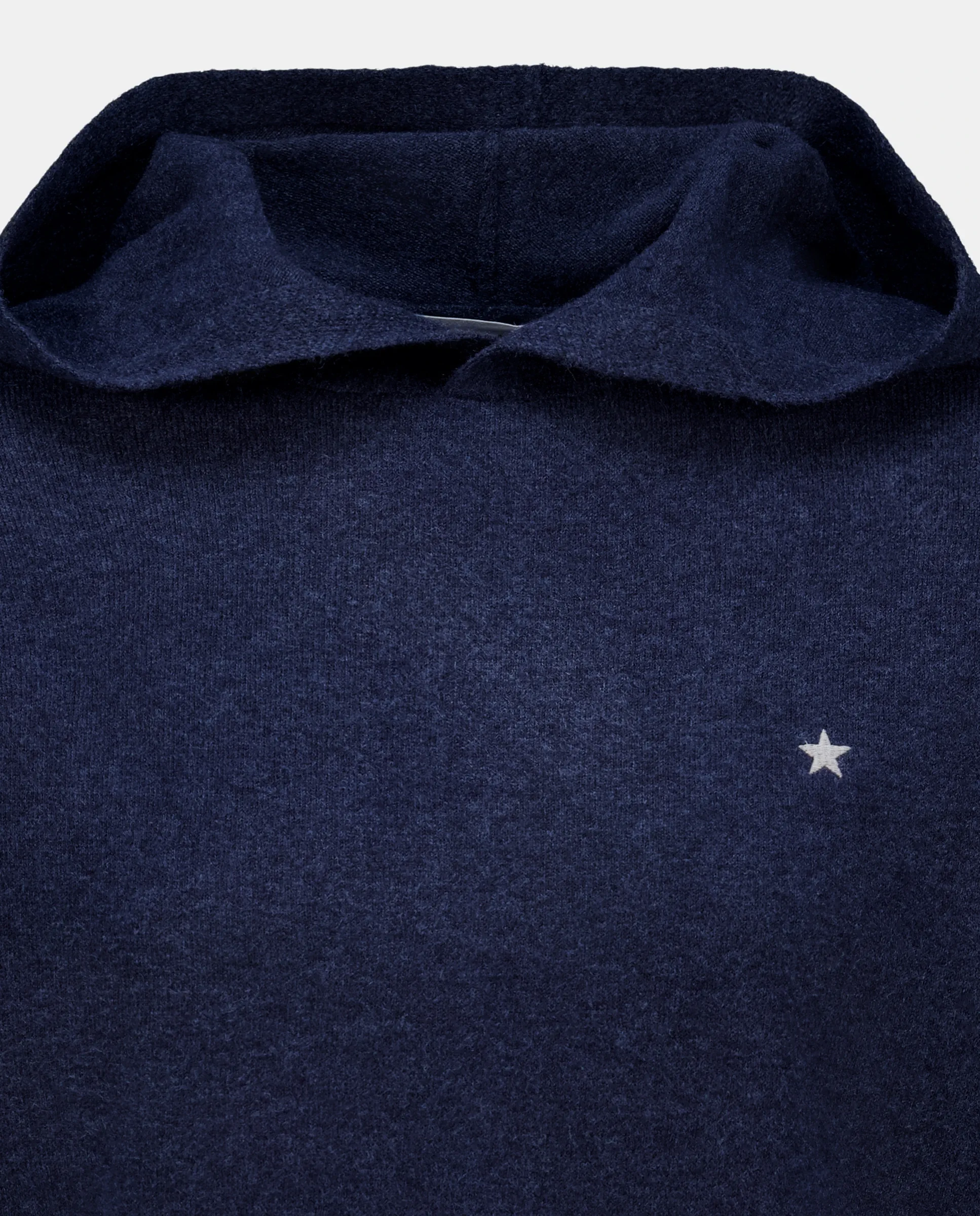Однотонный свитер с капюшоном, круглым вырезом и длинными рукавами.