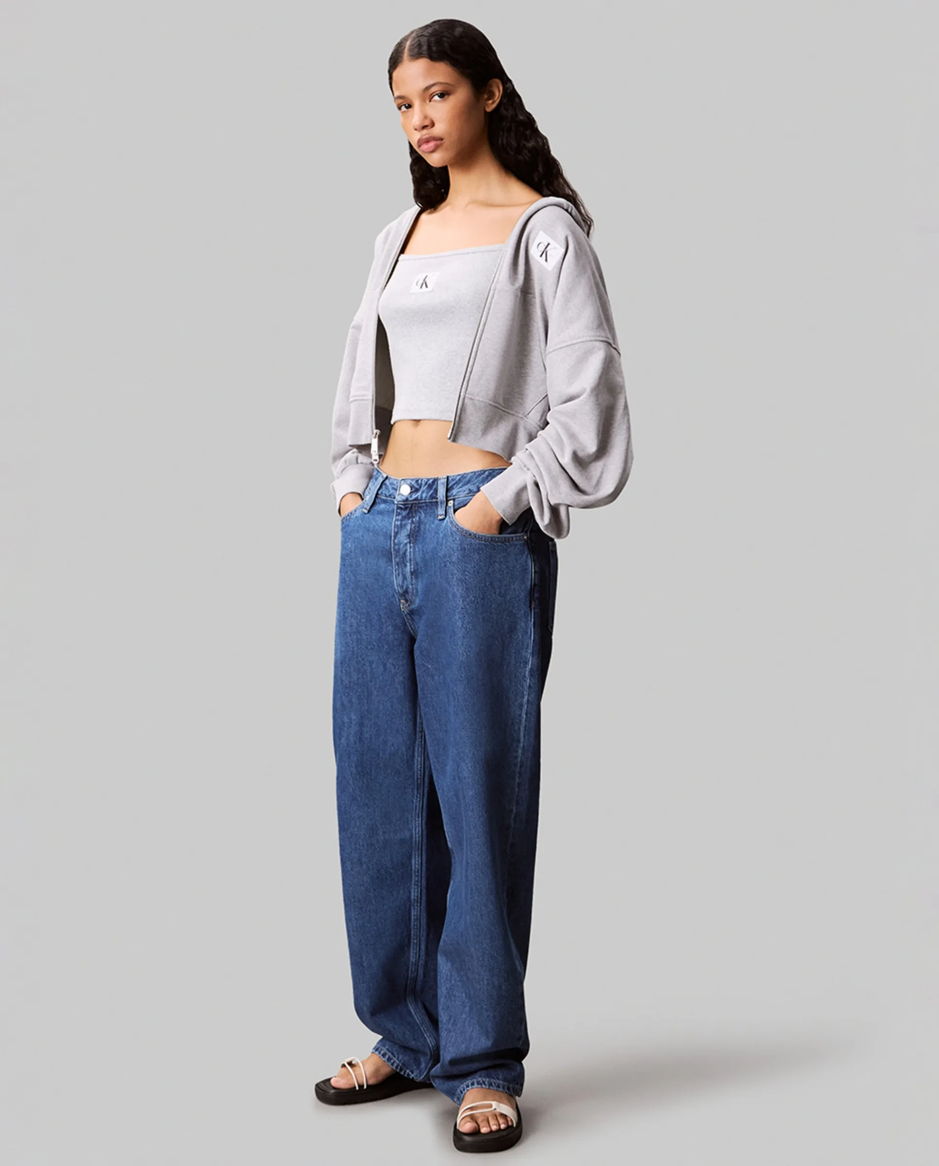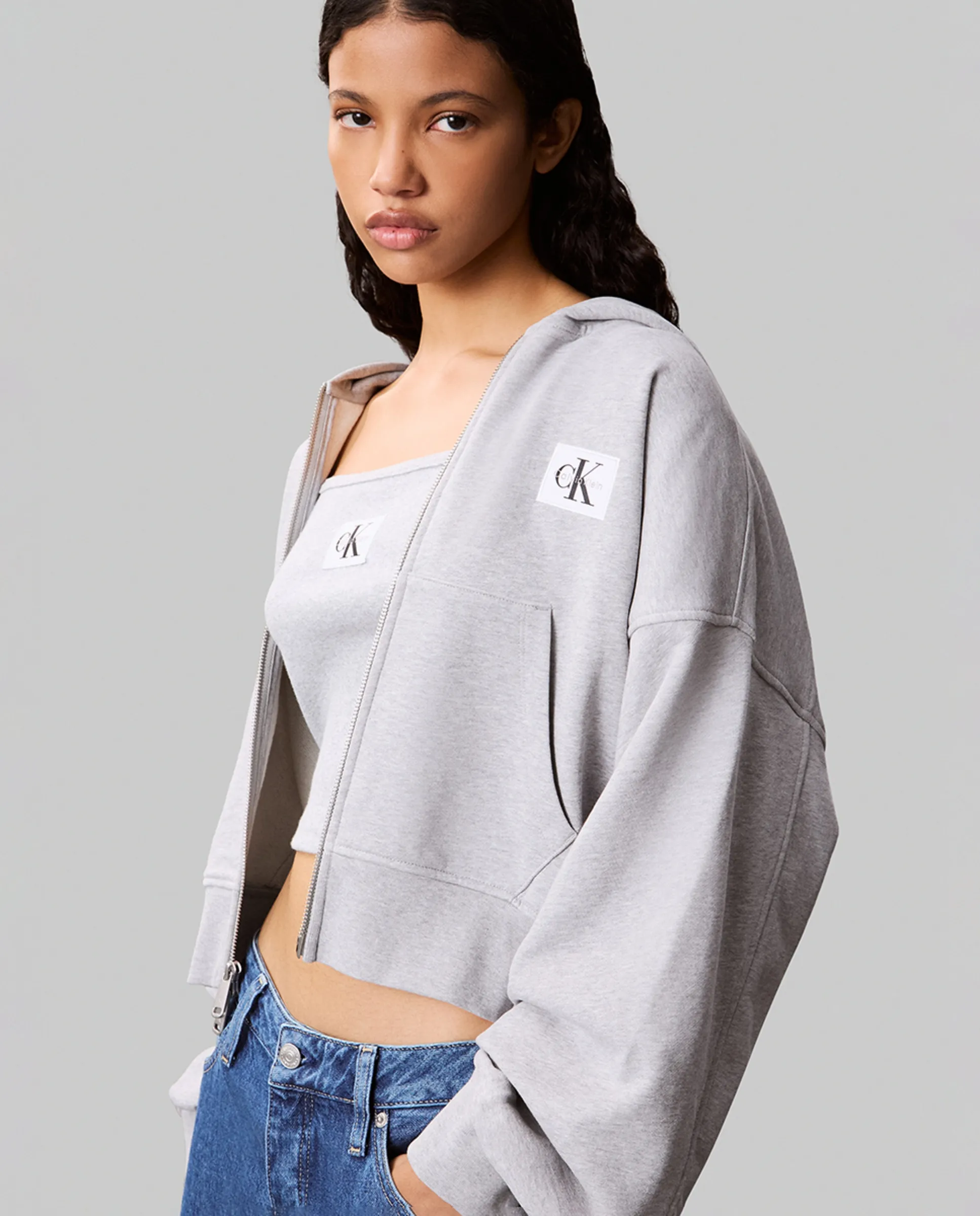 Женская толстовка, сделанная из 100% хлопка, с капюшоном, молнией и нашитой этикеткой CK на груди.