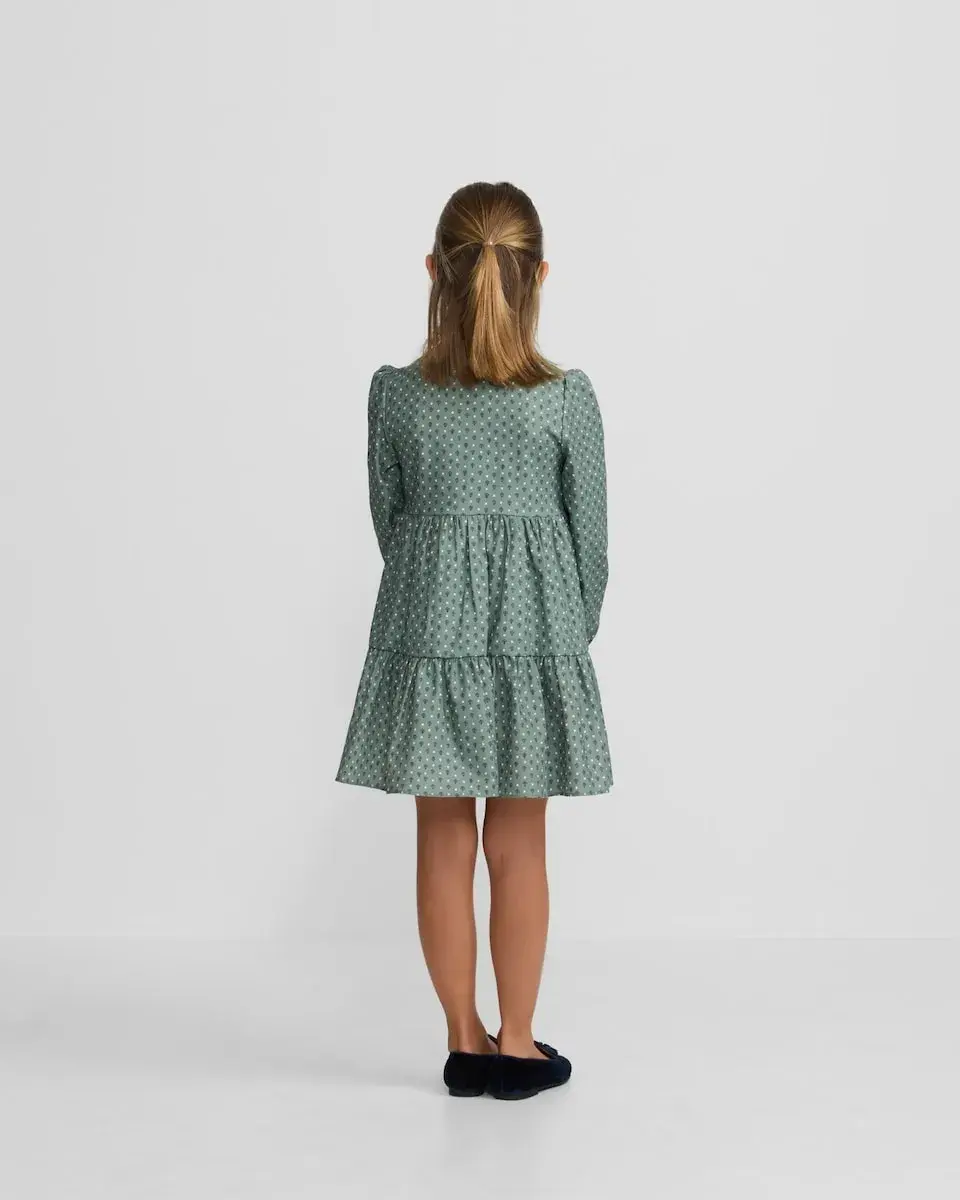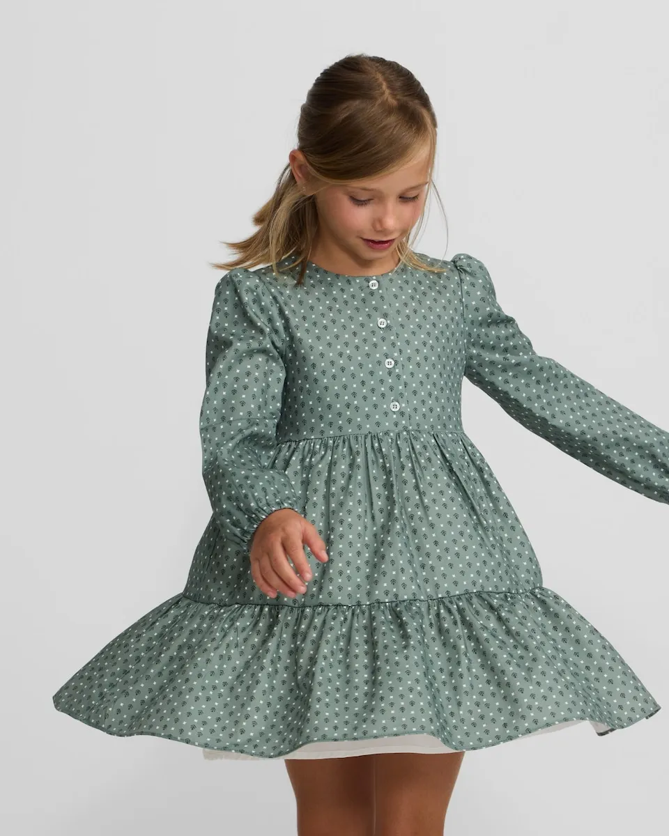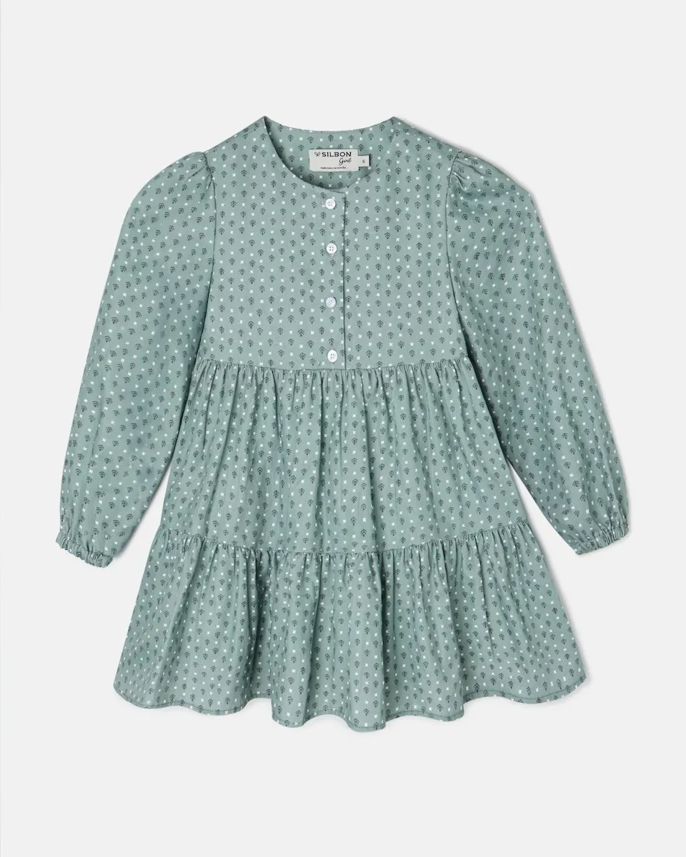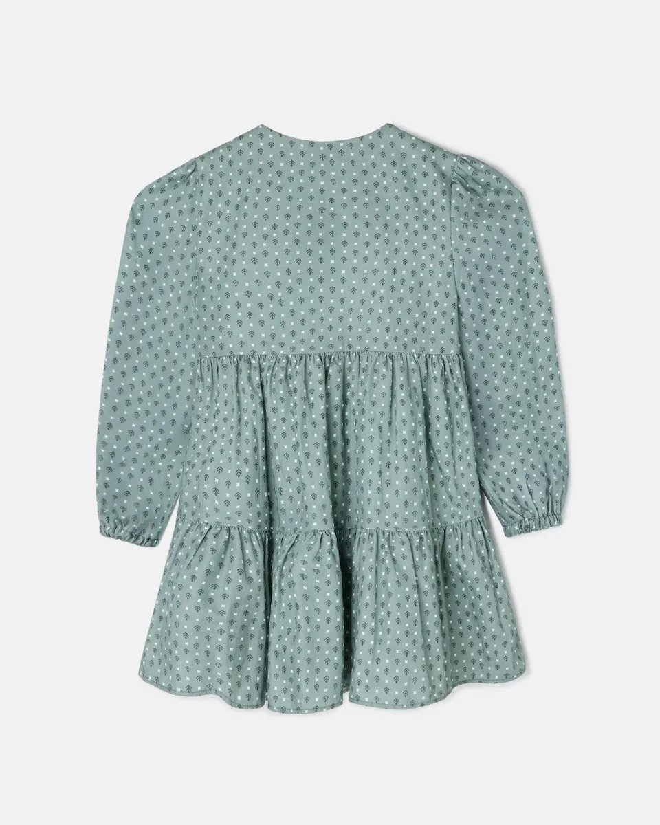Мини-платье для девочки из панелей с большим размахом и движением, изготовленное на 100% из хлопка. Представляет собой ткань с принтом цветочных мотивов в зеленых тонах. Имеет круглый вырез, застежку спереди на кнопках с персонализированными пуговицами и длинные волнистые рукава с эластичными манжетами. Внутренняя часть белого цвета в контрасте. Изготовлено в Испании.