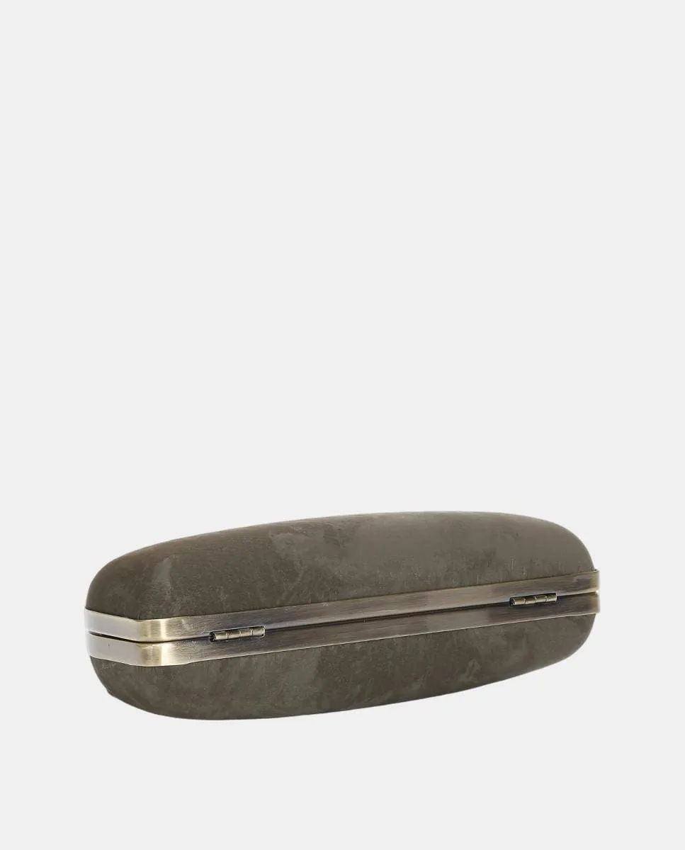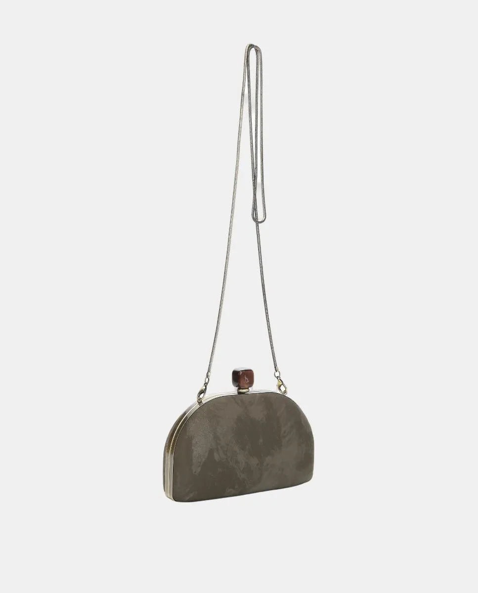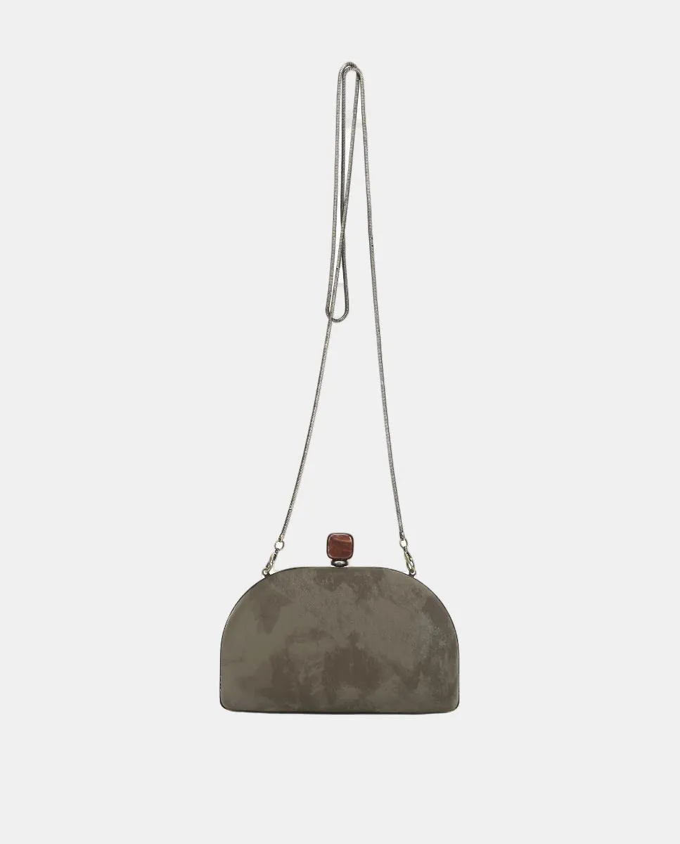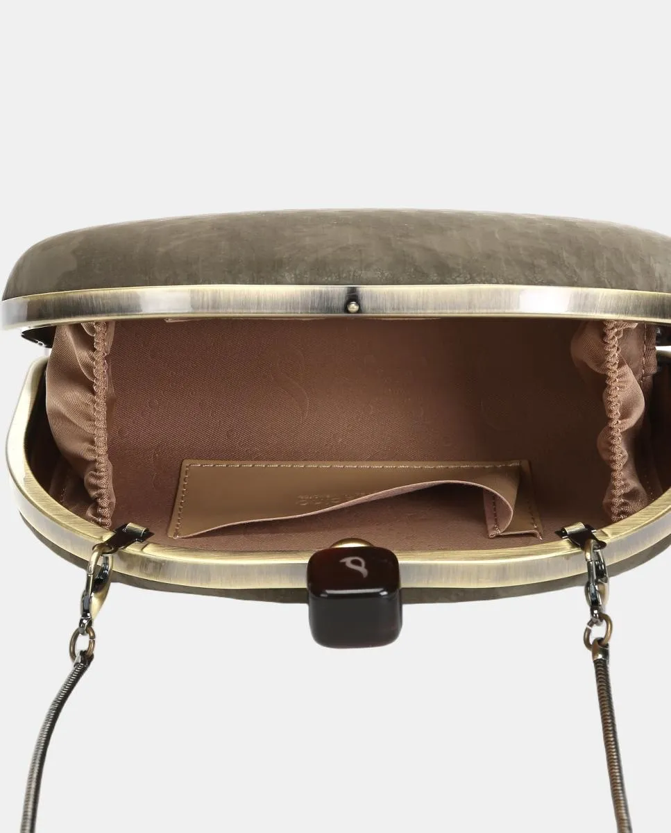 Вечерний клатч из бархата полукруглой формы, идеальный для особых случаев. Его подкладка включает в себя небольшой организационный отсек, а замок с зажимом гарантирует безопасность. Кроме того, он оснащён цепочным ремешком для удобства.