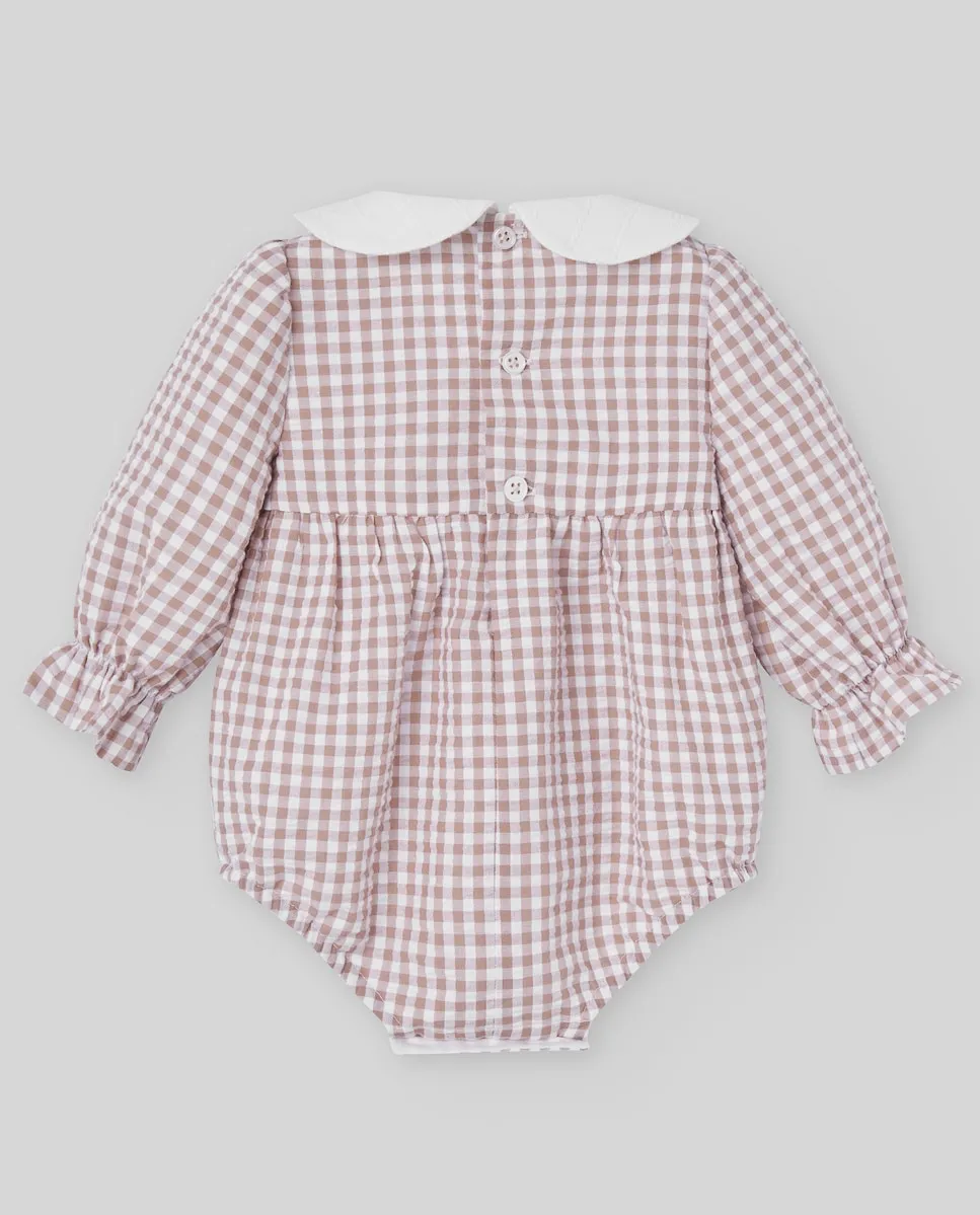 Короткий комбинезон с длинными рукавами из ткани в клетку. Воротник для малыша и сборки. Застежка сзади и на между ногами с застежками.