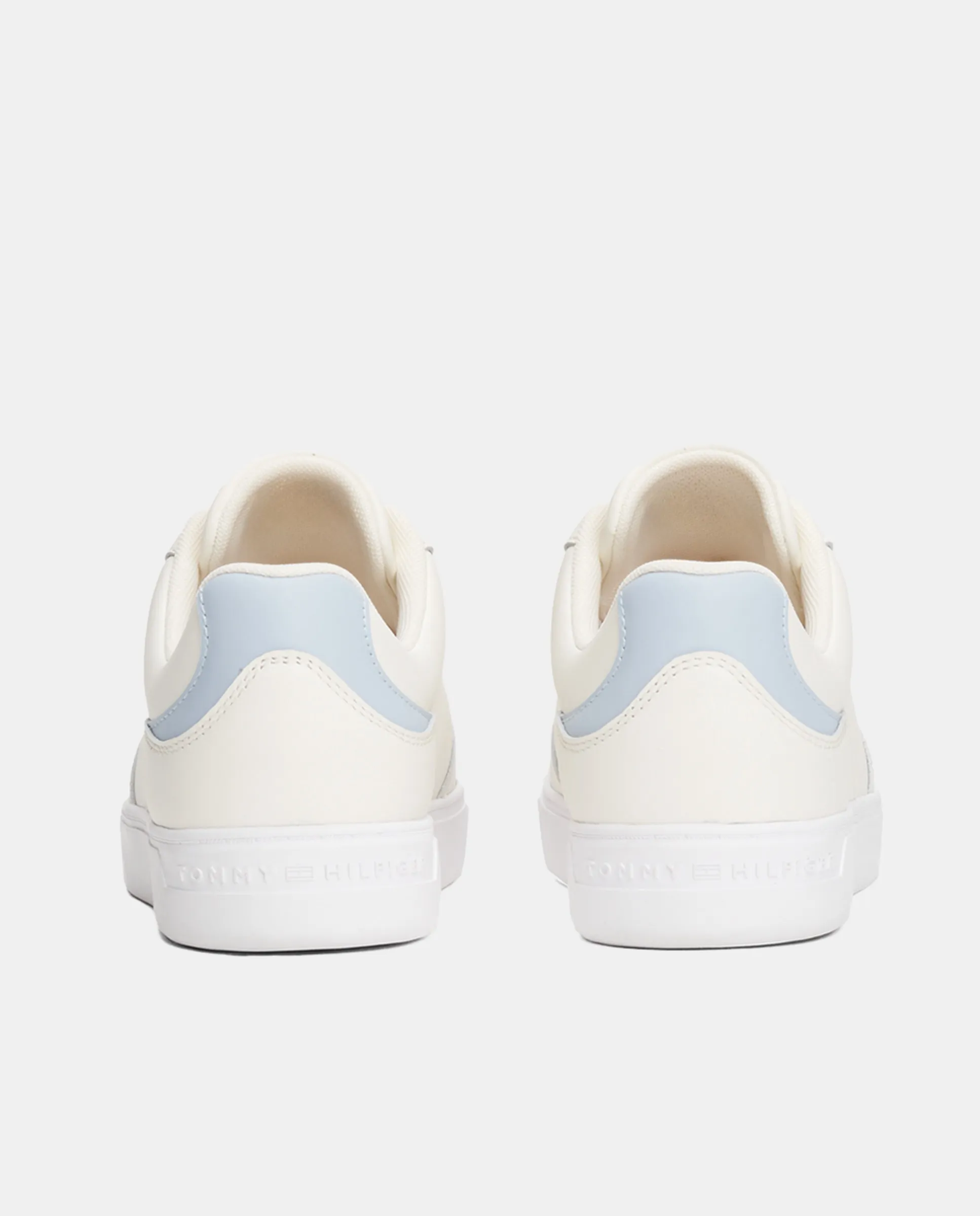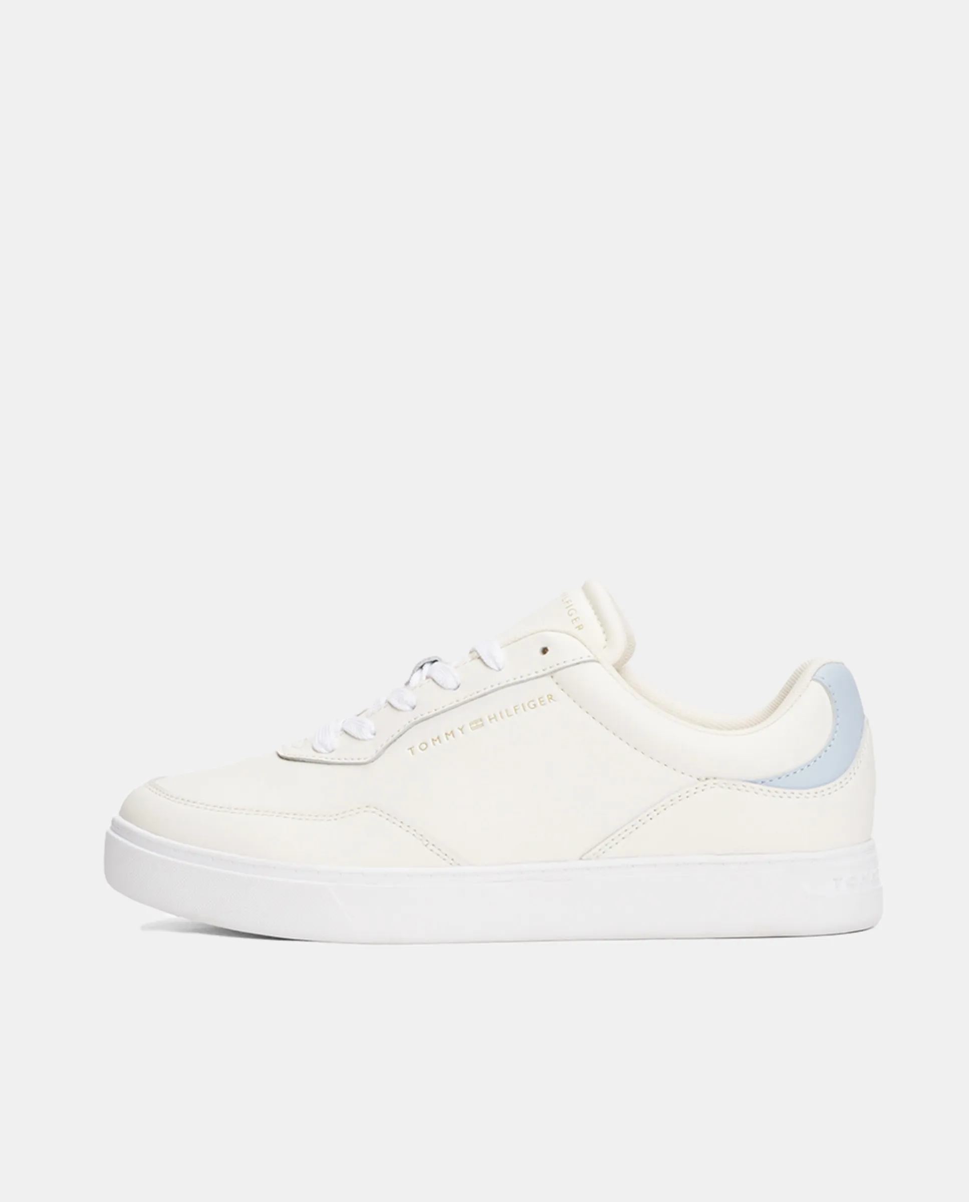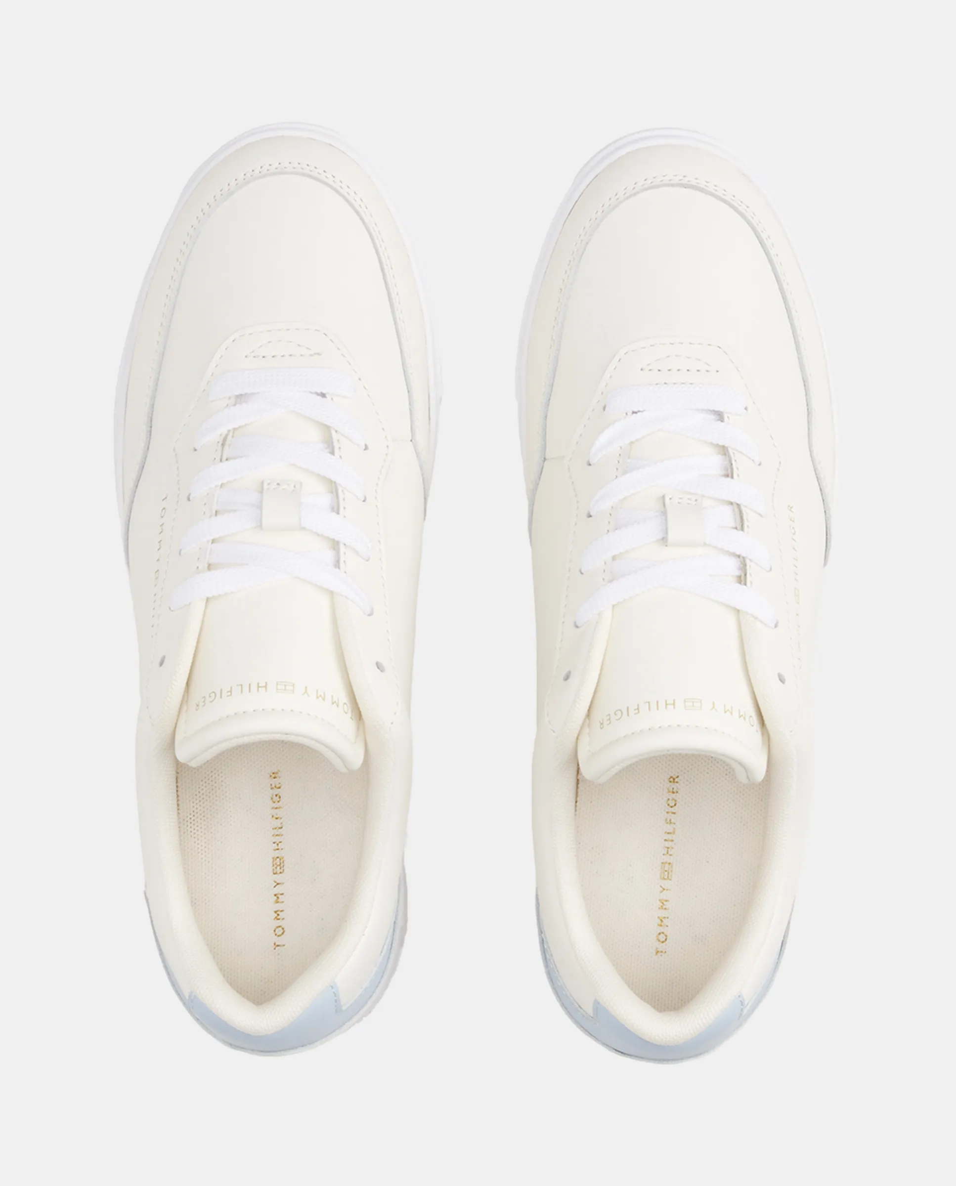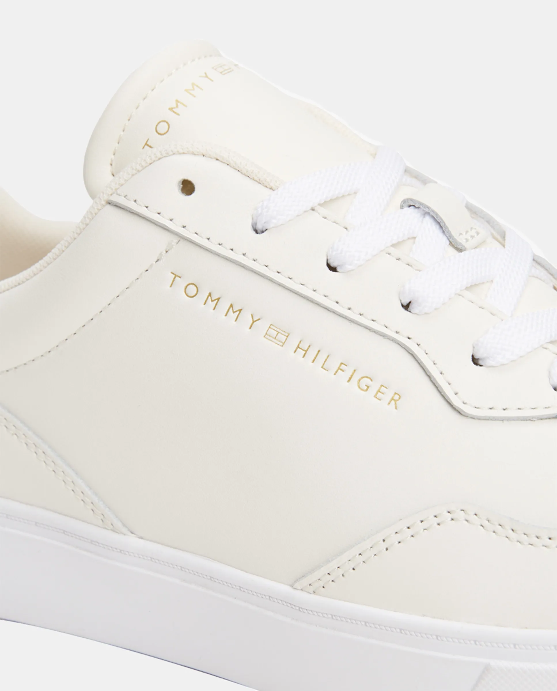 Бежевые кроссовки с защитным носком Tommy Hilfiger. Изготовлены из кожи. Золотой типографический логотип на боку.