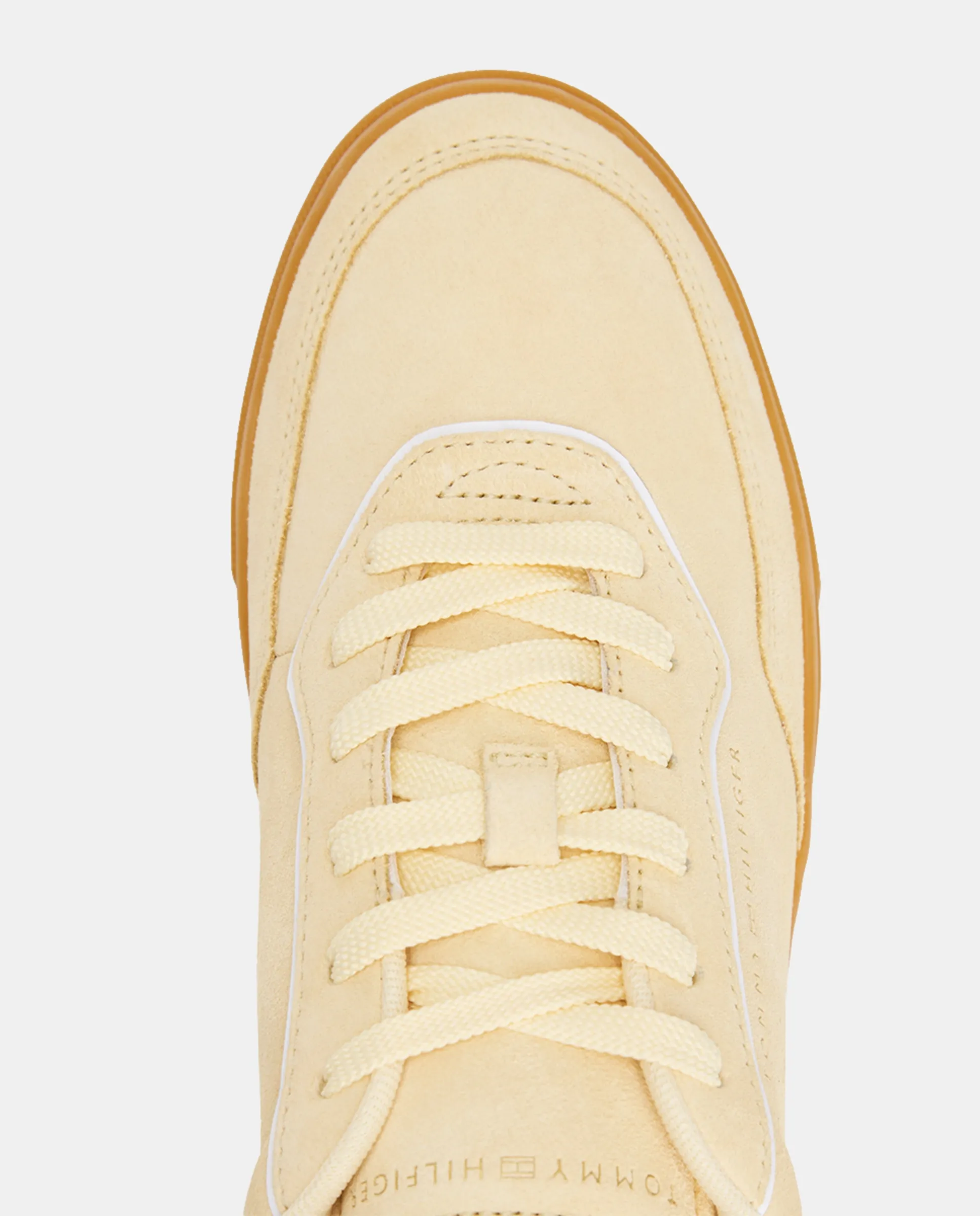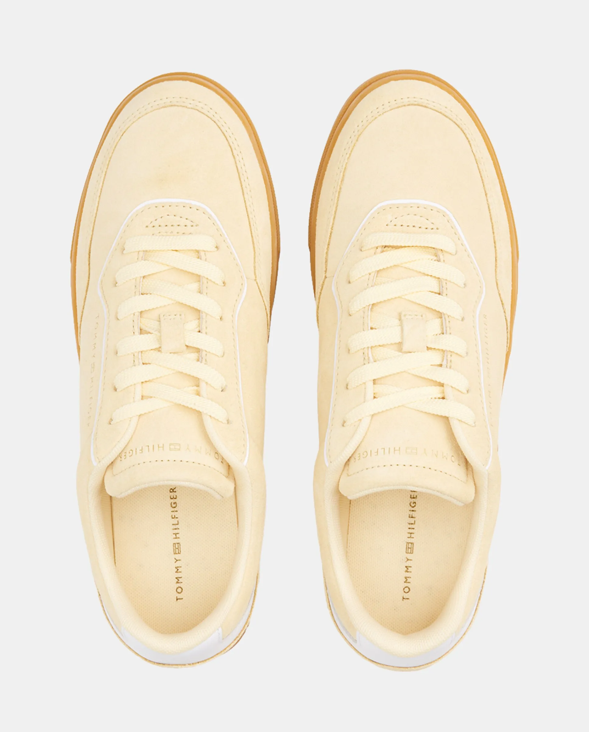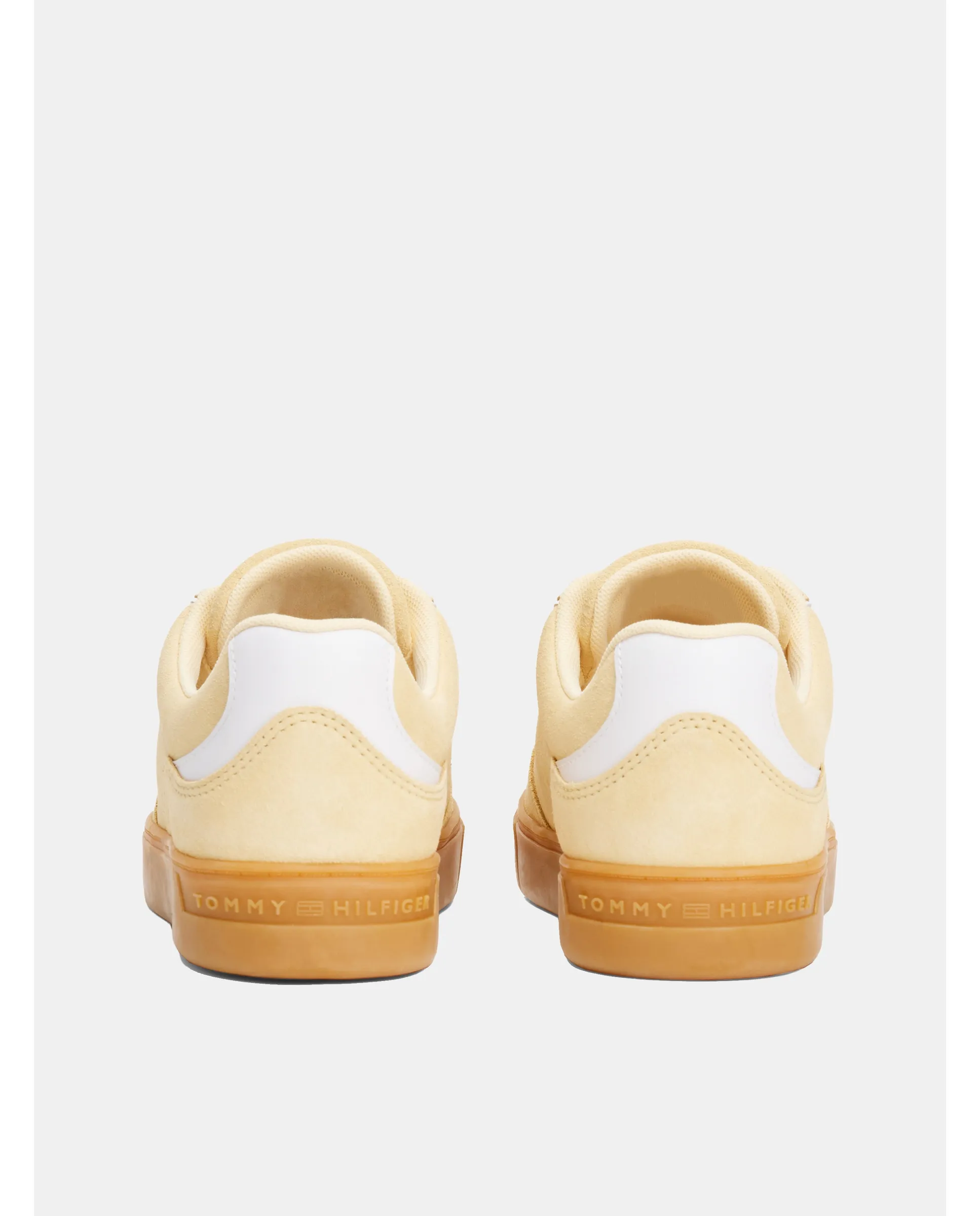 Кроссовки с защитным носком Tommy Hilfiger желтого цвета. Изготовлены из замшевой кожи. Золотой типографский логотип сбоку и контрастная карамельная подошва.