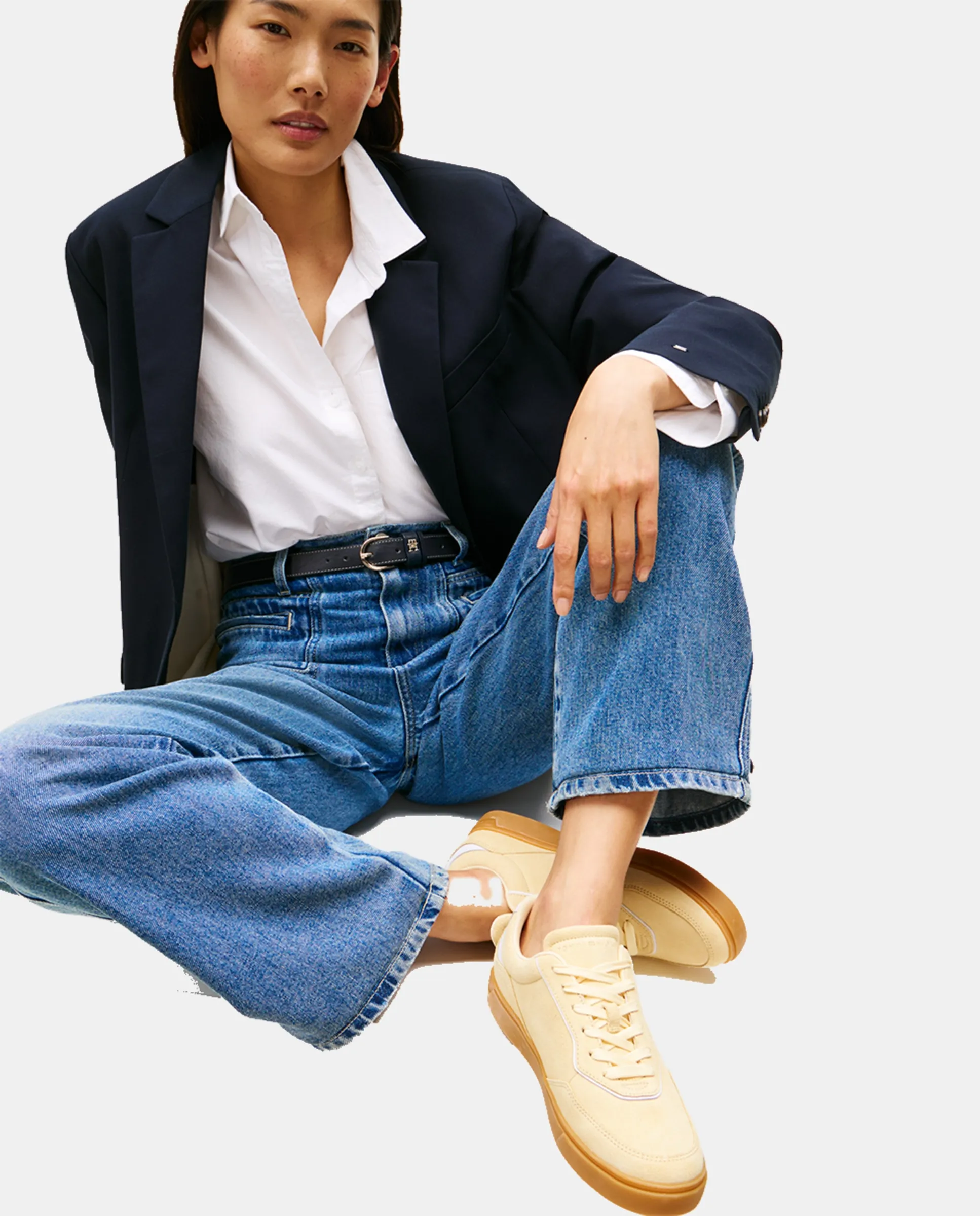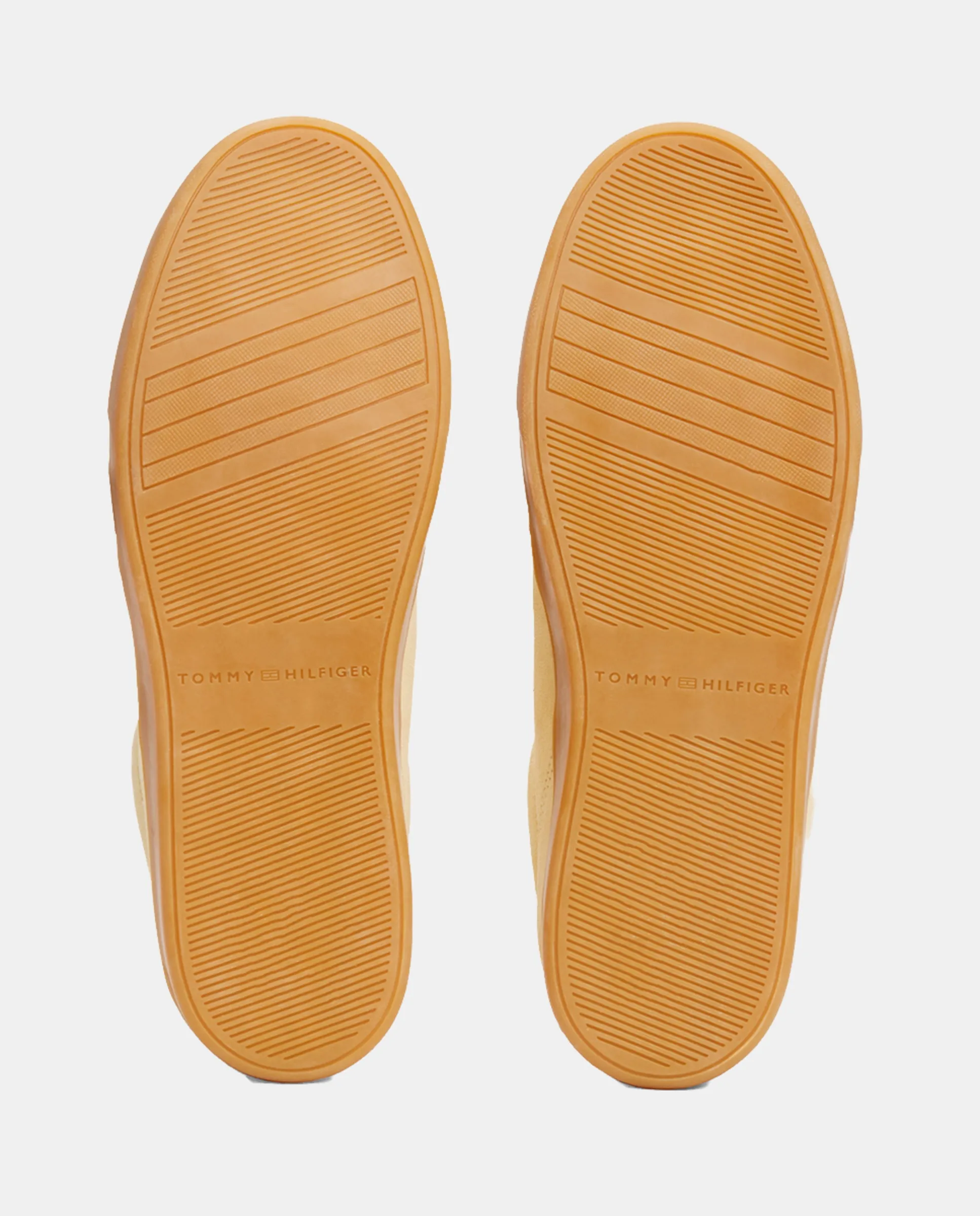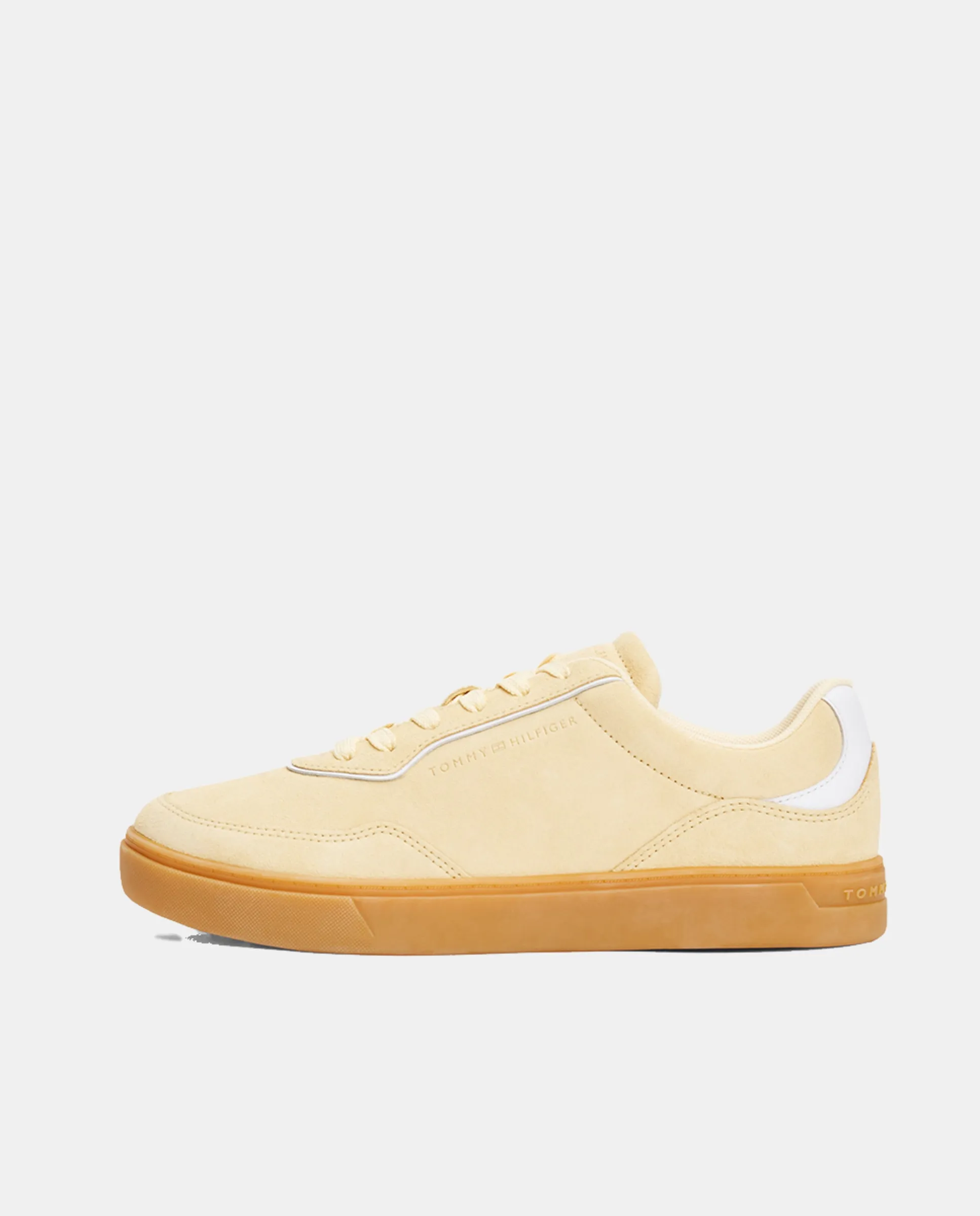 Кроссовки с защитным носком Tommy Hilfiger желтого цвета. Изготовлены из замшевой кожи. Золотой типографский логотип сбоку и контрастная карамельная подошва.