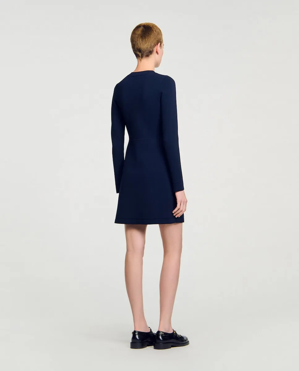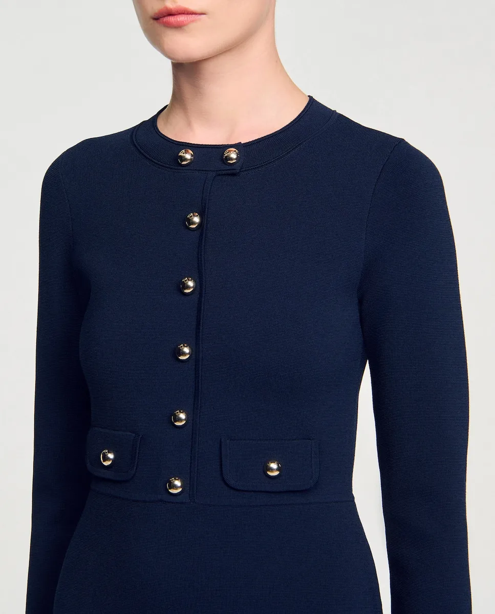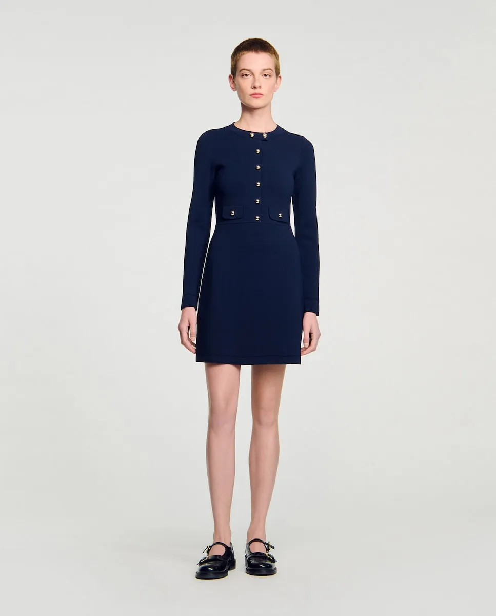 Короткое вязаное платье на пуговицах Sandro, темно-синий