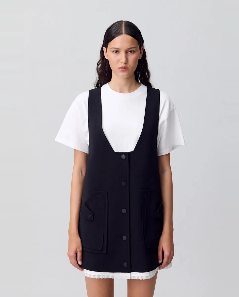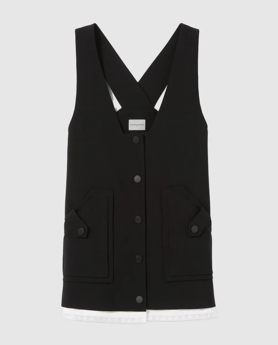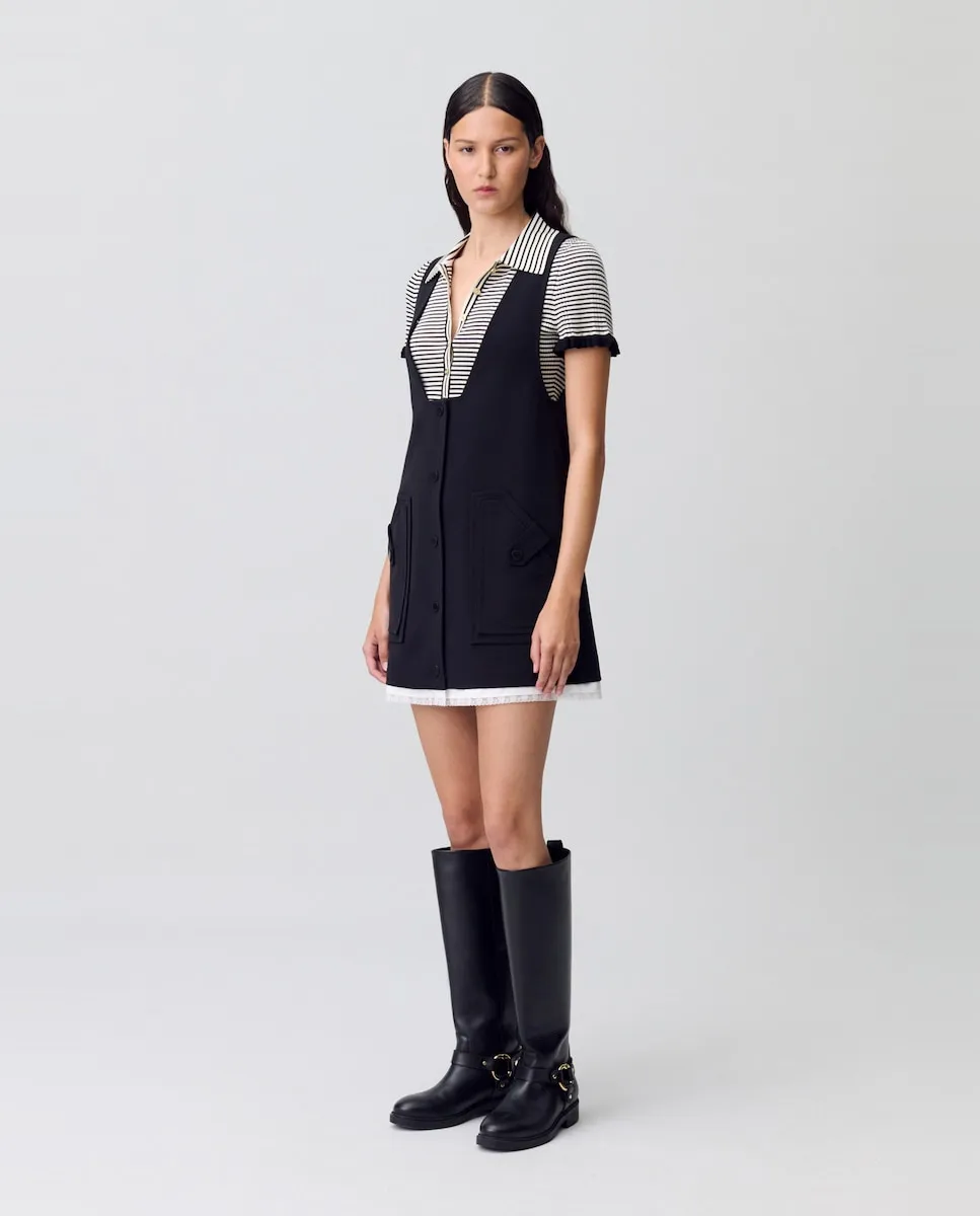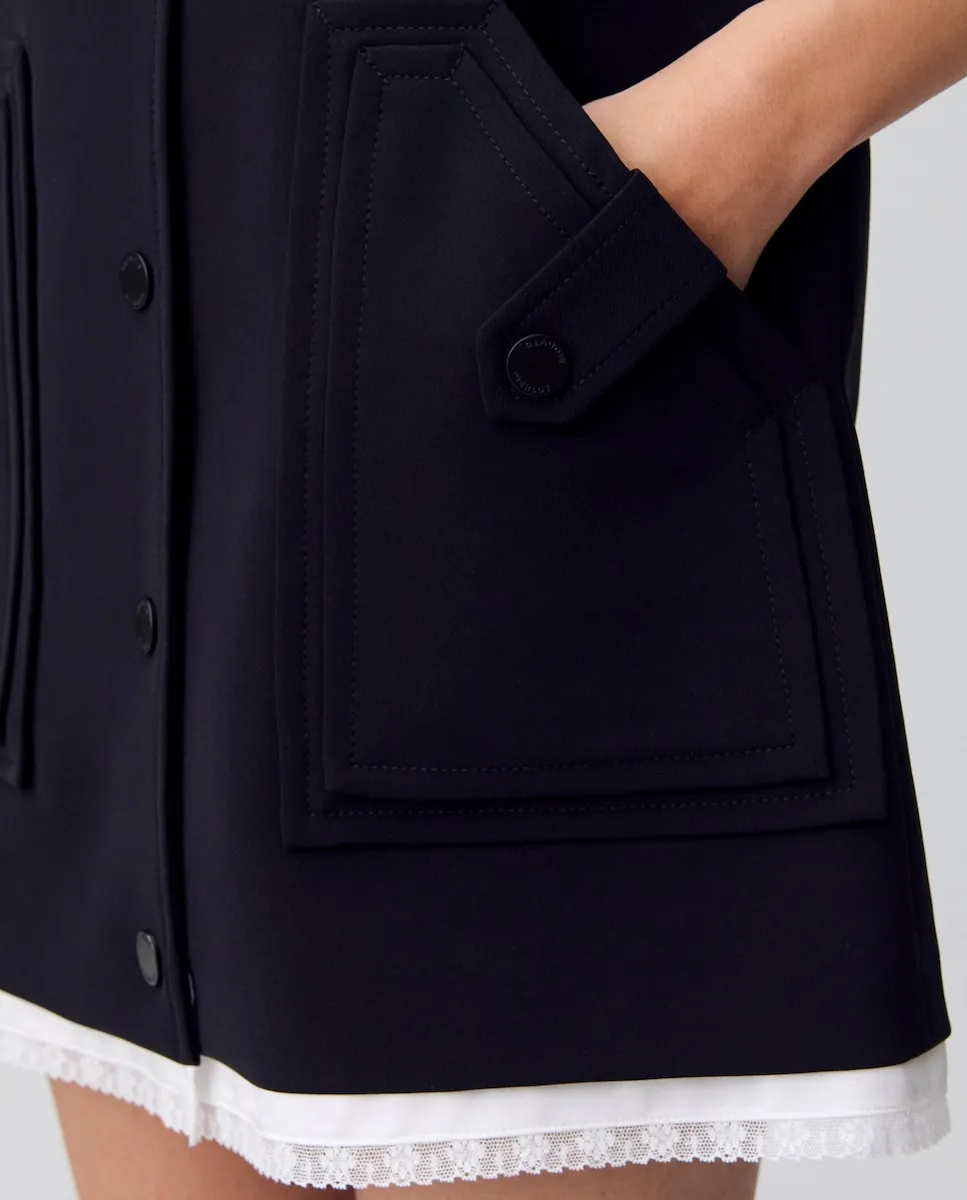 Воплощение английской деревни, наше исследование переосмысляет дух коттеджа через современную интерпретацию. Гардероб контрастов, одновременно структурированный и текучий, с иногда оверсайз-кусками, иногда острыми, и пальто из кожи, шерсти или искусственного меха. Силуэты, которые сочетают традиционную элегантность с бескомпромиссной современностью. Короткое платье типа часов с глубоким V-образным вырезом и контрастирующим сатиновым материалом в нижней части. Короткое платье типа часов. Широкие бретели. Глубокий V-образный вырез. Прямой крой. Патент с 5 кнопками на передней стороне в тон. 2 двойных кармана с клапаном и застежкой по обеим сторонам. Кружево в нижней части платья.