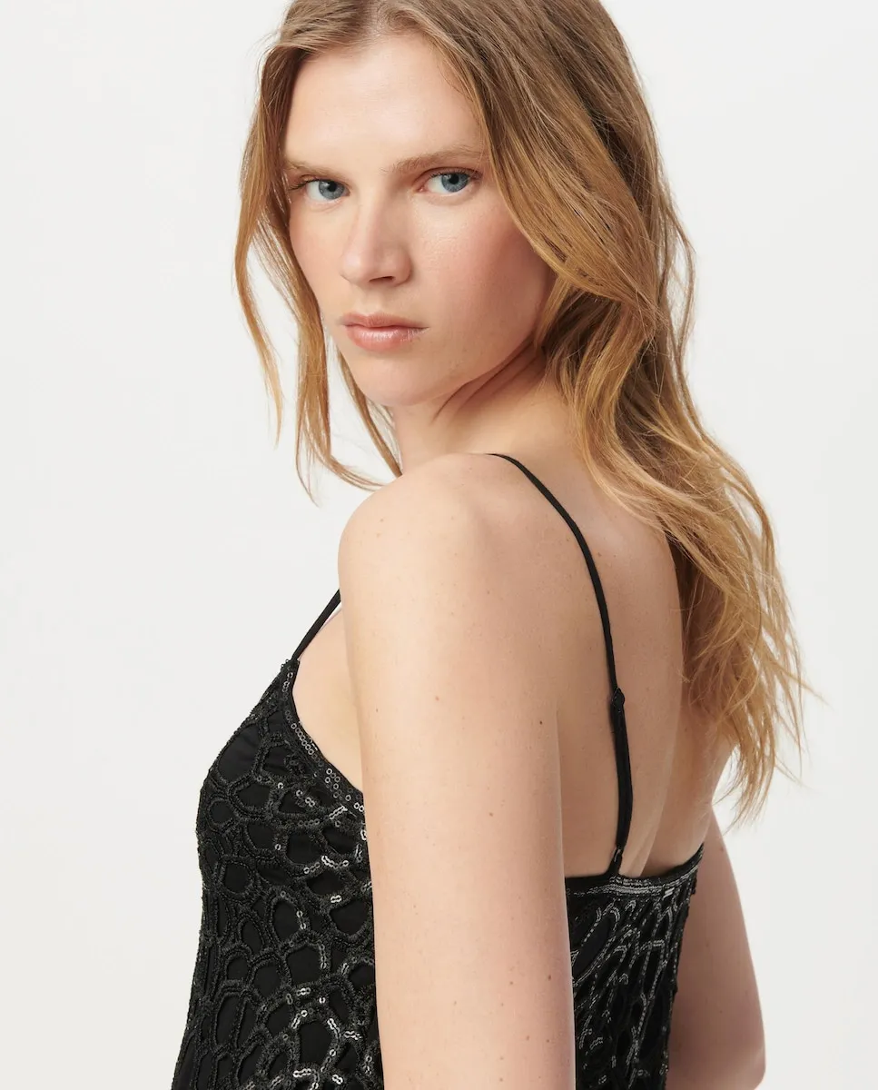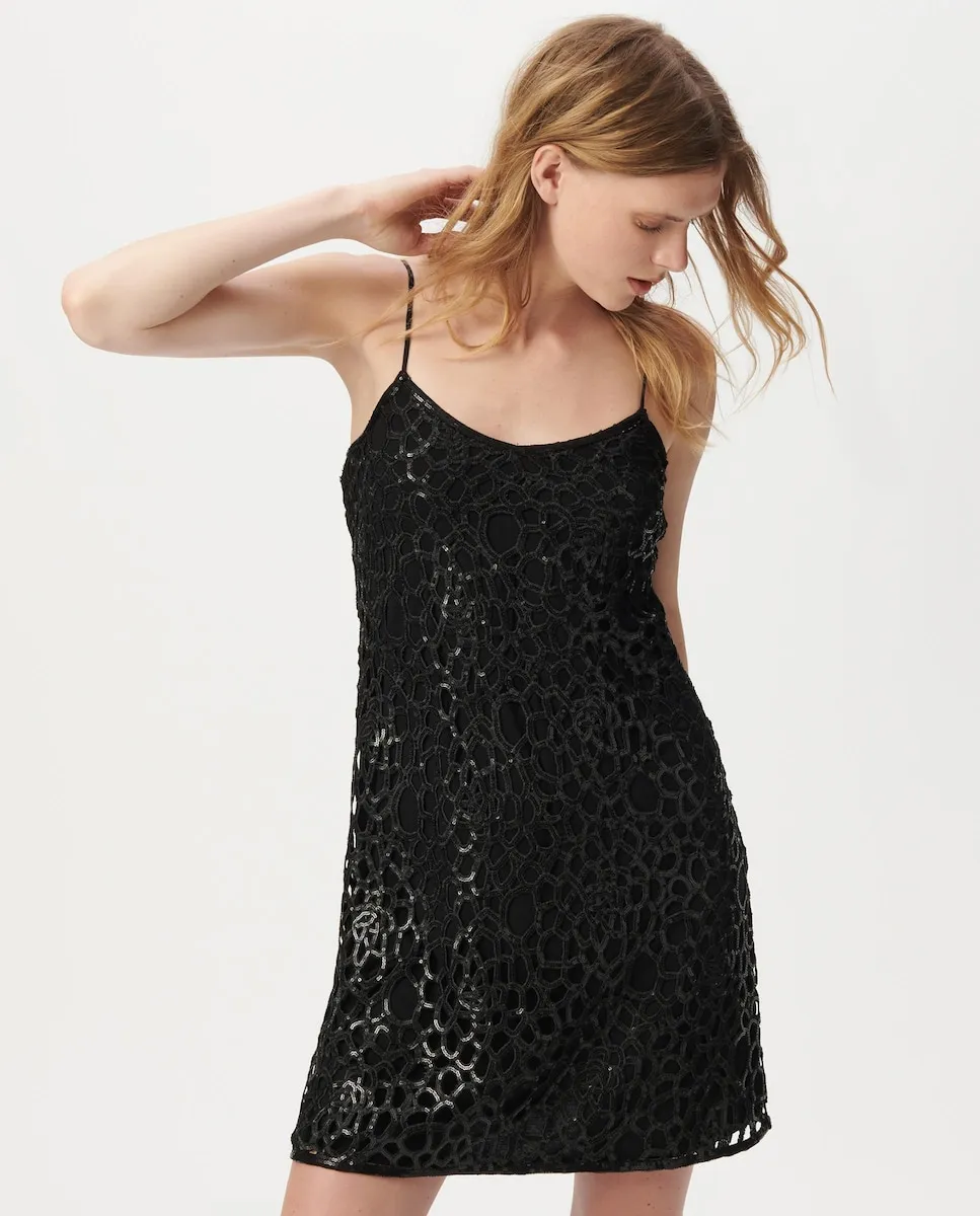 Черное платье для женщин из полиэстера, с V-образным вырезом, тонкими регулируемыми бретелями, кружевом с вышивкой из страз в тон, гладкой подкладкой, свободного кроя, до колена. Длина платья: 92 см для размера 36.