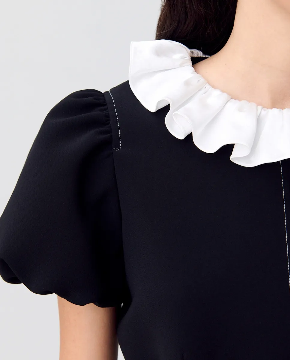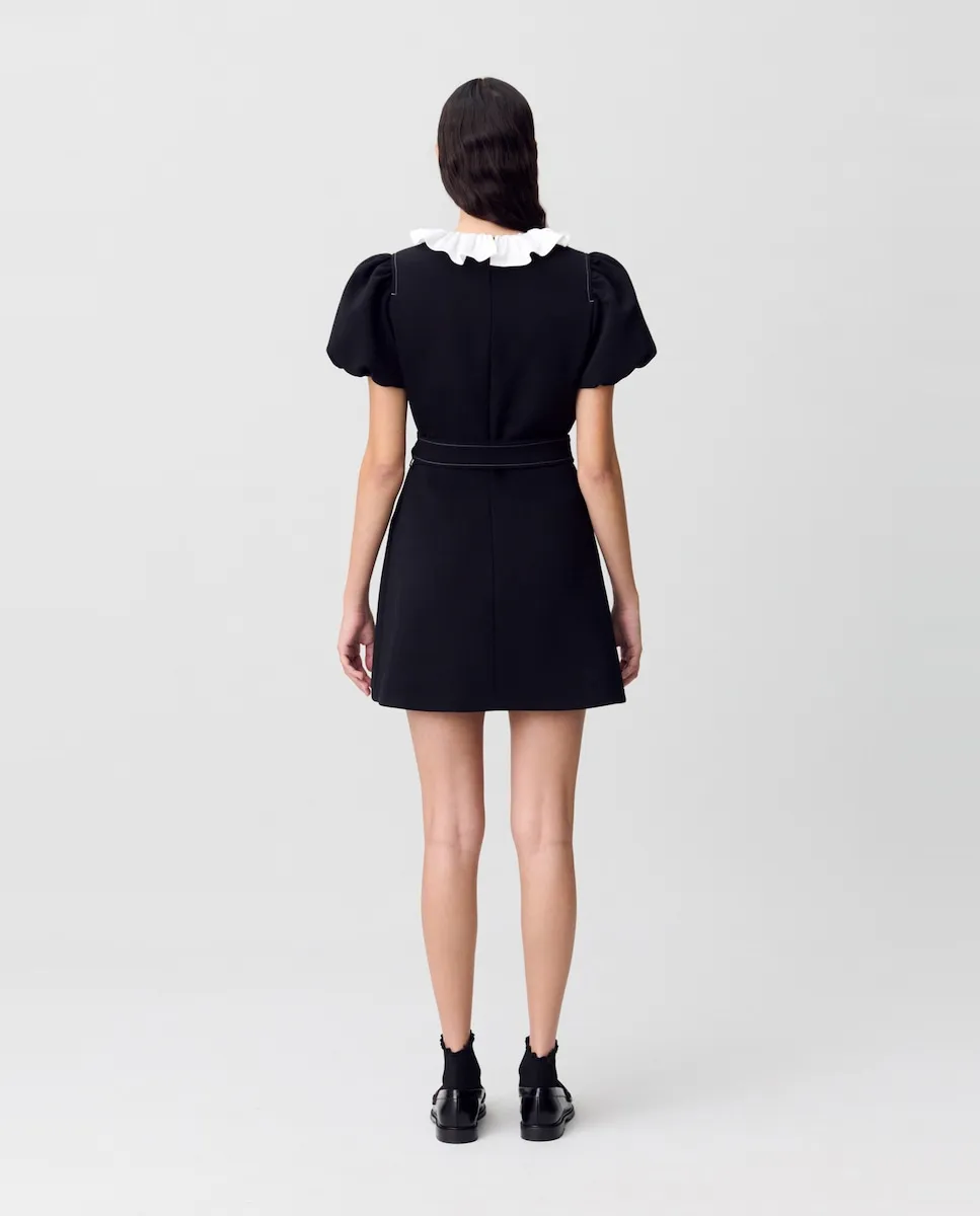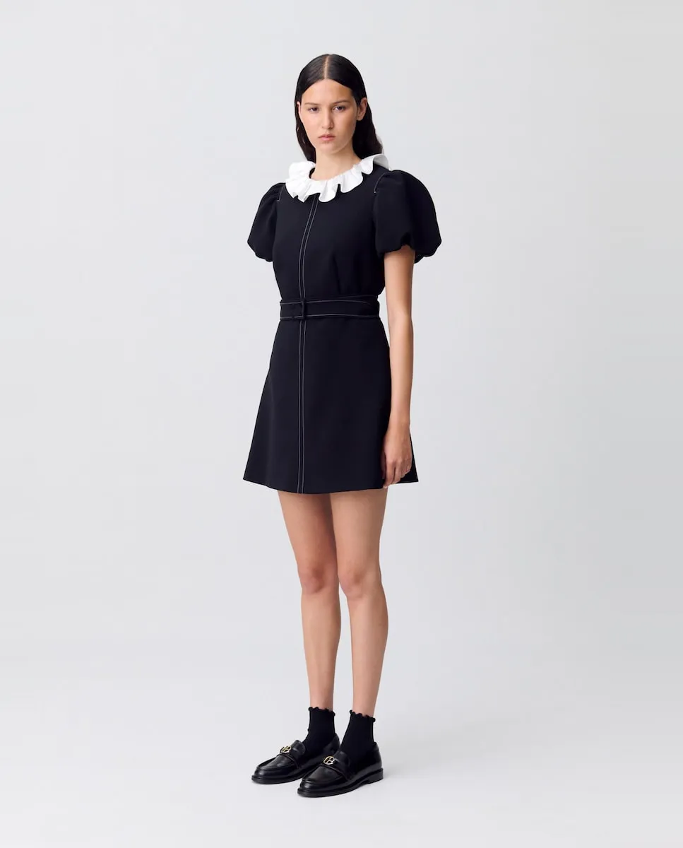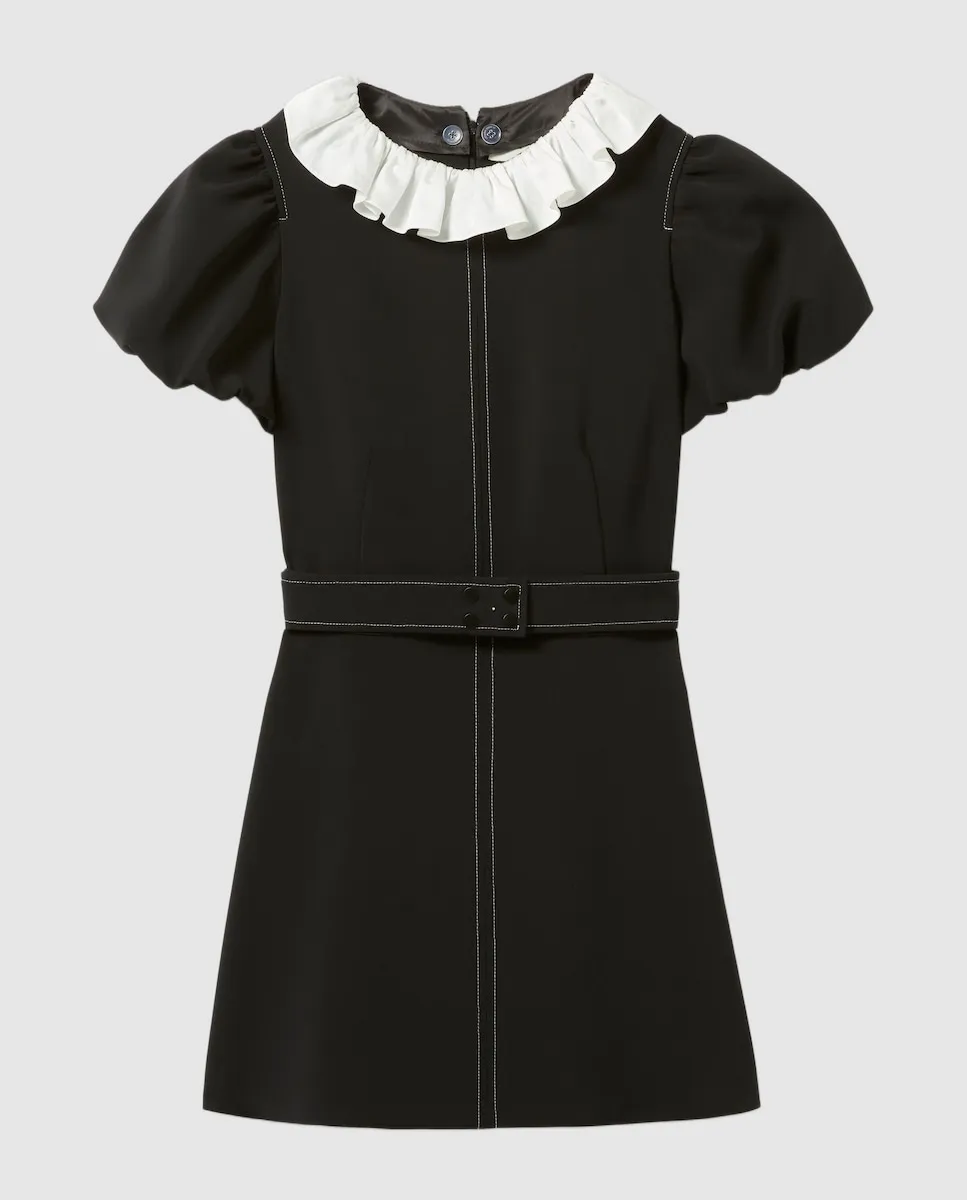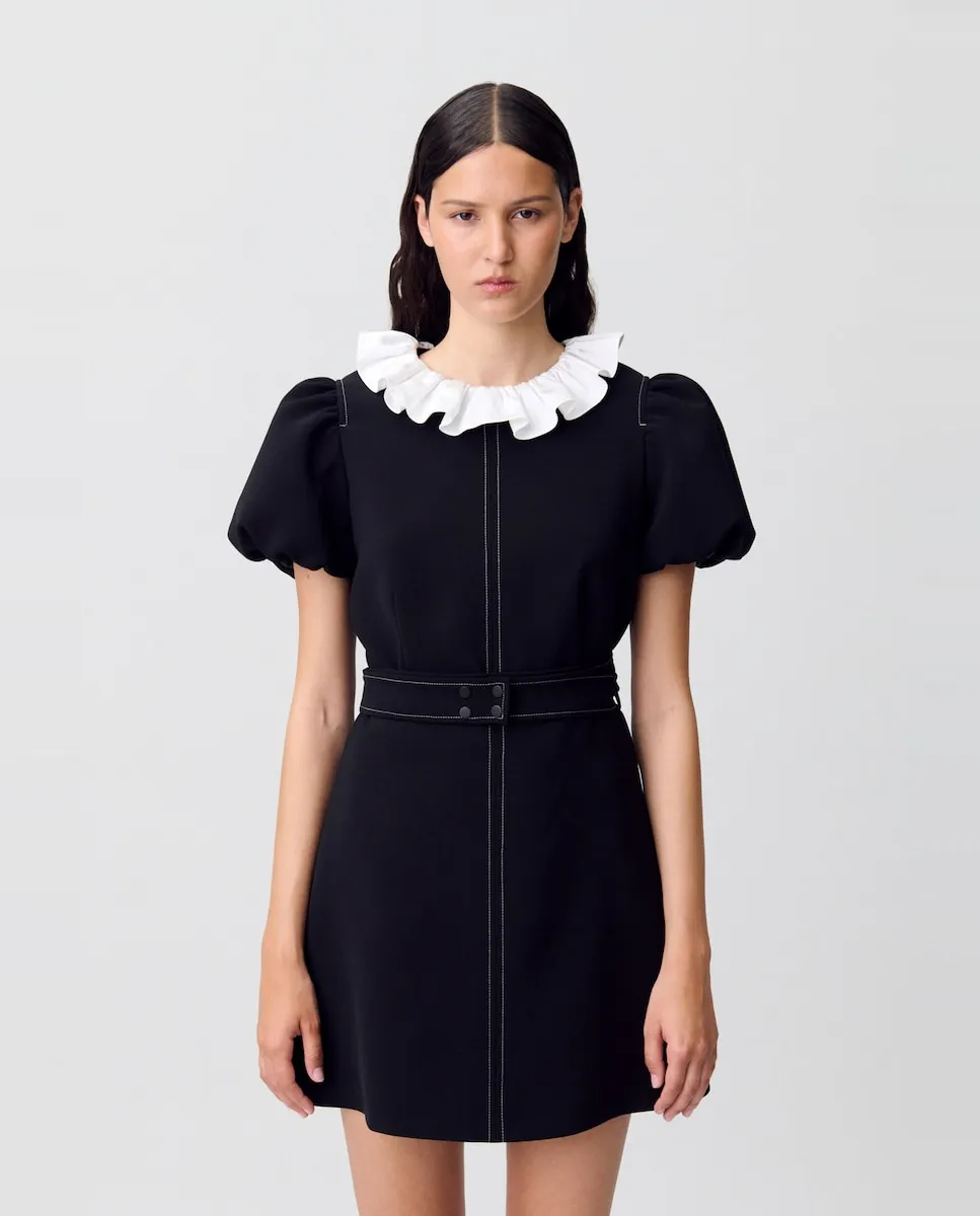 Воплощение английской сельской местности, наше исследование вновь интерпретировало дух коттеджа через современное прочтение. Гардероб контрастов, одновременно структурированный и текучий, с иногда оверсайз-кусками, иногда острыми, и пальто из кожи, шерсти или искусственного меха. Силуэты, которые сочетают традиционную элегантность с бескомпромиссной современностью. Короткое платье с короткими и объемными рукавами с сборками. Короткое платье с объемными рукавами. Сборки на платье. Съемный викторианский воротник. Тканевый пояс с кнопочным замком в тон. 2 петли для пояса. Контрастные швы на поясе и по центру платья. Застежка на крючок и невидимая молния.