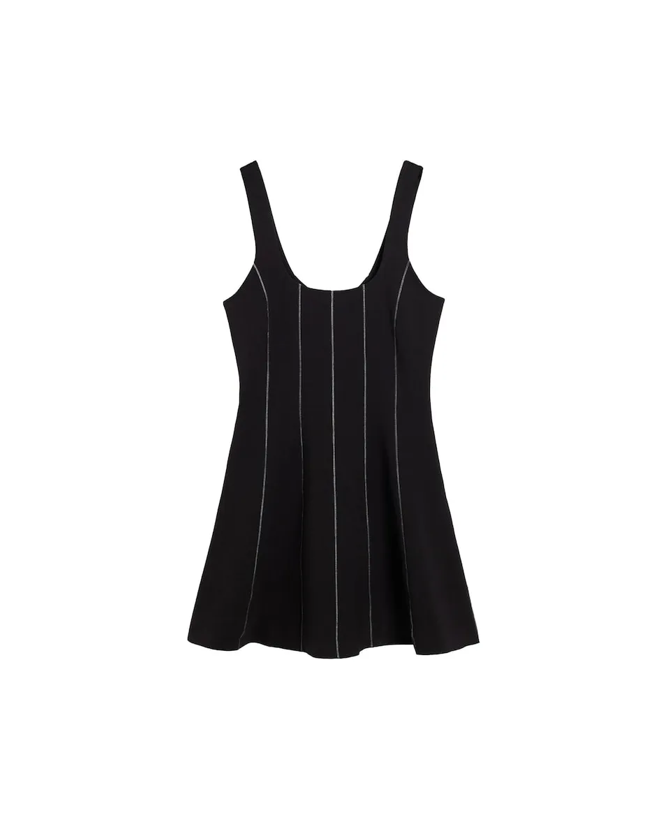 Узкое короткое платье с вертикальными панелями, квадратным вырезом и тонкими бретелями однотонного цвета. Цвет: однотонный. Крій: Slim. С бретелями. Длина: короткая. Застежка: на молнии.