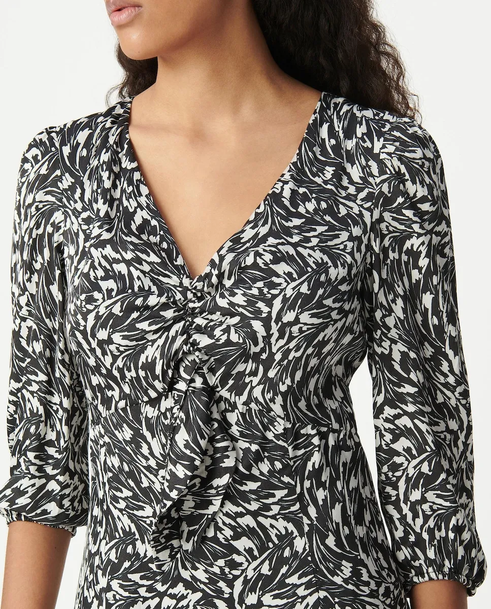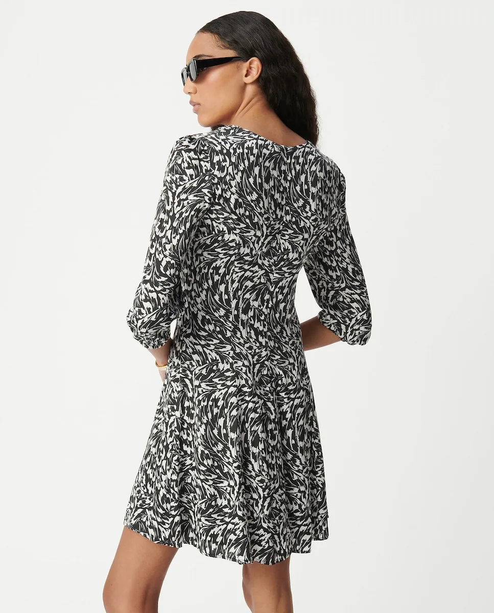Черное сатиновое платье из вискозы для женщин С V-образным вырезом, 3/4 эластичными рукавами Эксклюзивный минималистичный цветочный принт IKKS Вырез с бантом Вырезы на талии, сборки на плечах Задний скрытый замок Сдержанный и струящийся, короткий крой Длина платья: 90 см для размера 36 IKKS actforbetter: материал, содержащий 100 % вискозы LENZING ECOVERO, получаемой из лесов, управляемых устойчивым образом.