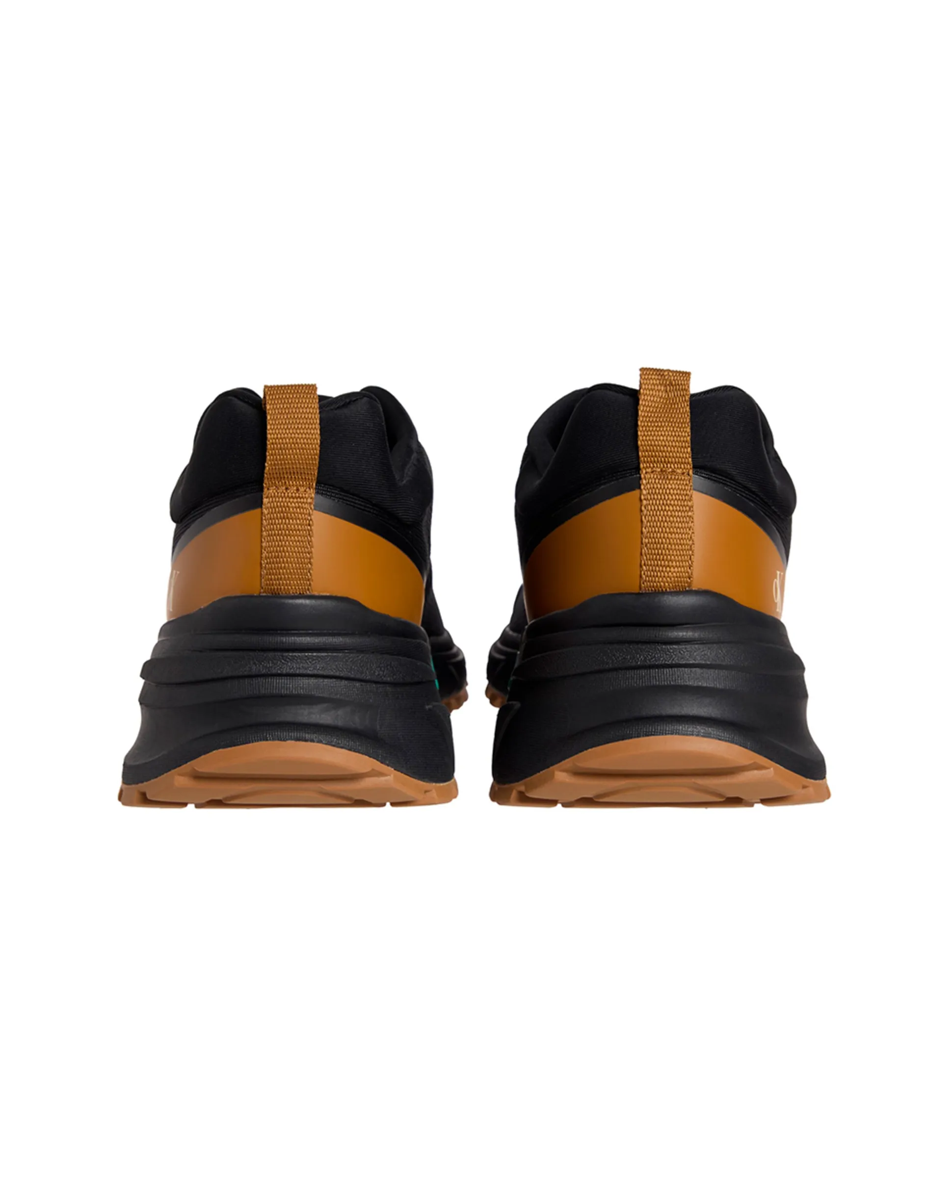 Мужские кроссовки черного цвета с карамельными деталями. Шнуровка, логотип на задней боковине и рифленая резиновая подошва.
