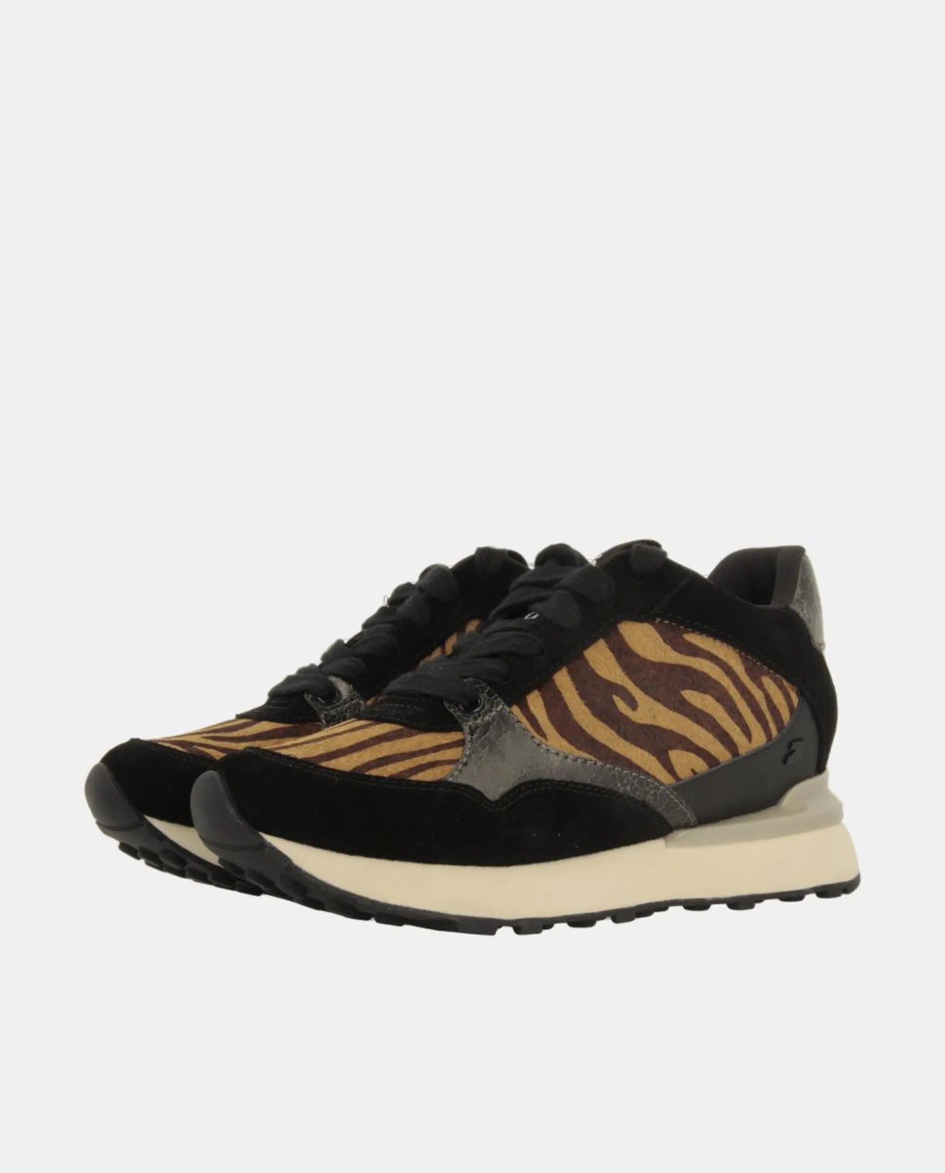 Замшевые кроссовки с внутренним каблуком. Сочетают в себе принт зебры под мех и потрескавшиеся детали. Обладают амортизирующей стелькой и стабилизатором на пятке. Высота внутреннего каблука: 3 см. Верх из кожи и полиуретана. Подкладка и стелька из дышащего полиэстера.