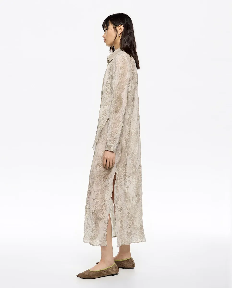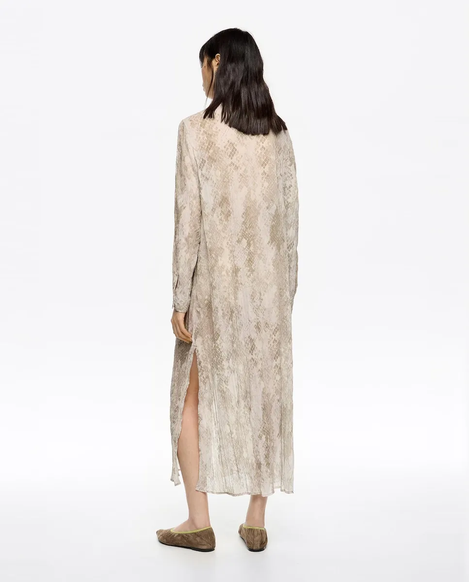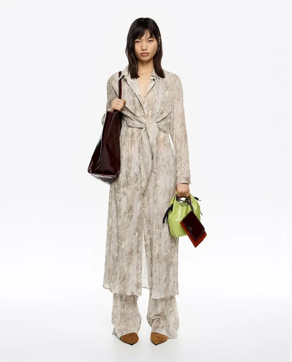 Длинное плиссированное платье для женщин, изготовленное на 100% из полиэстера марки BIMBA Y LOLA. Оно представлено в коричневом цвете с деталями цвета топа и принтом под кожу животного. Это платье прямого кроя средней длины с пуговицами спереди, воротником-рубашкой и длинными рукавами с манжетами и пуговицей. Оно выделяется своими макси-завязками на переднем вырезе, придающими ему особый и элегантный вид. Подходит для сезона Осень-Зима. Для ухода рекомендуется не использовать сушилку, не использовать отбеливатель и стирать при максимальной температуре 30º.
