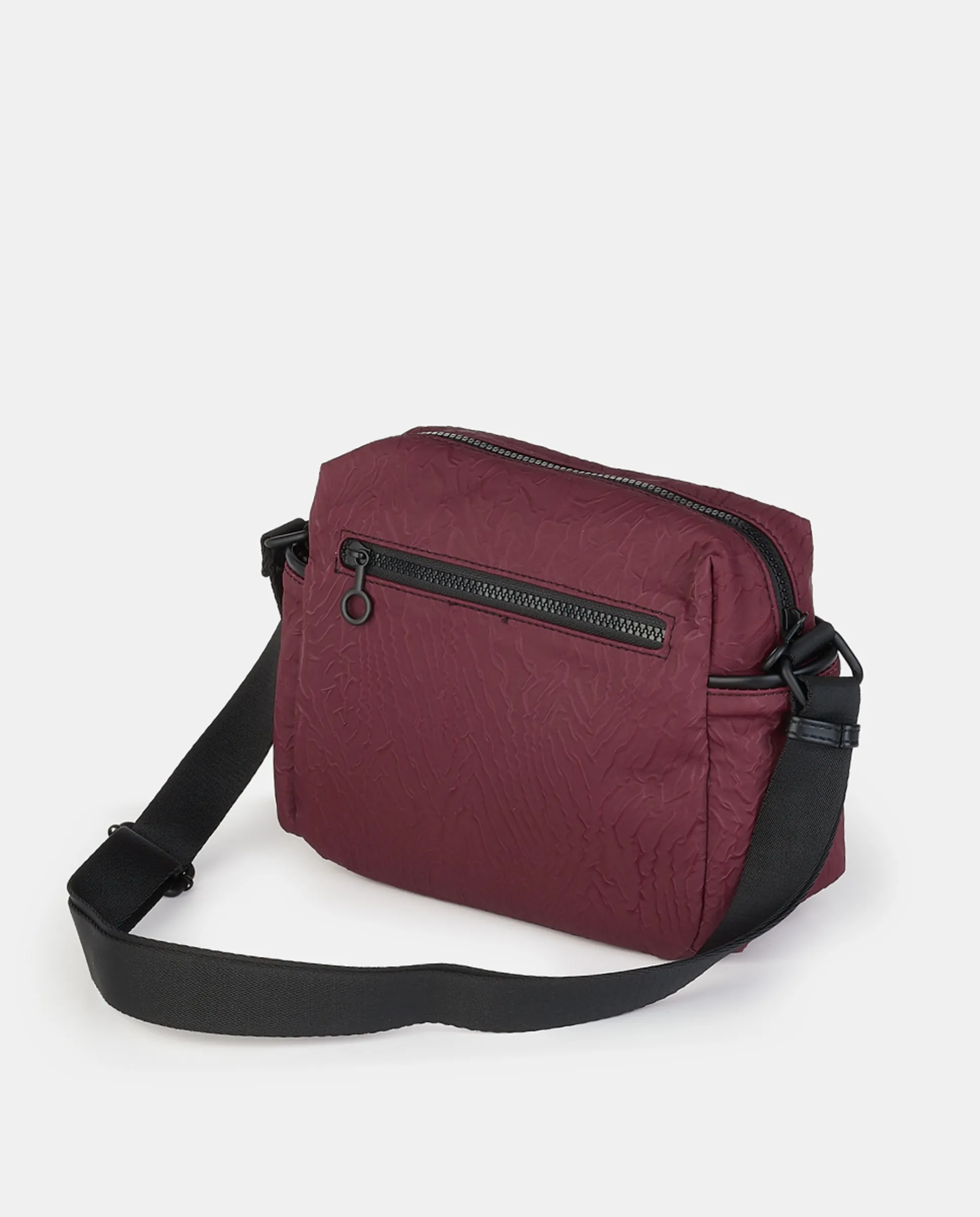 Кроссбоди цвета бордо с застежкой-молнией, внешним и задним карманами на молнии и длинным ремешком для ношения через плечо.