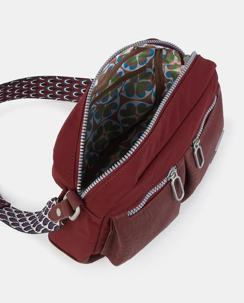 Сумка через плечо цвета бордо с молнией, два внешних кармана с молнией, задний и внутренний карманы с молнией. Регулируемый длинный ремень.