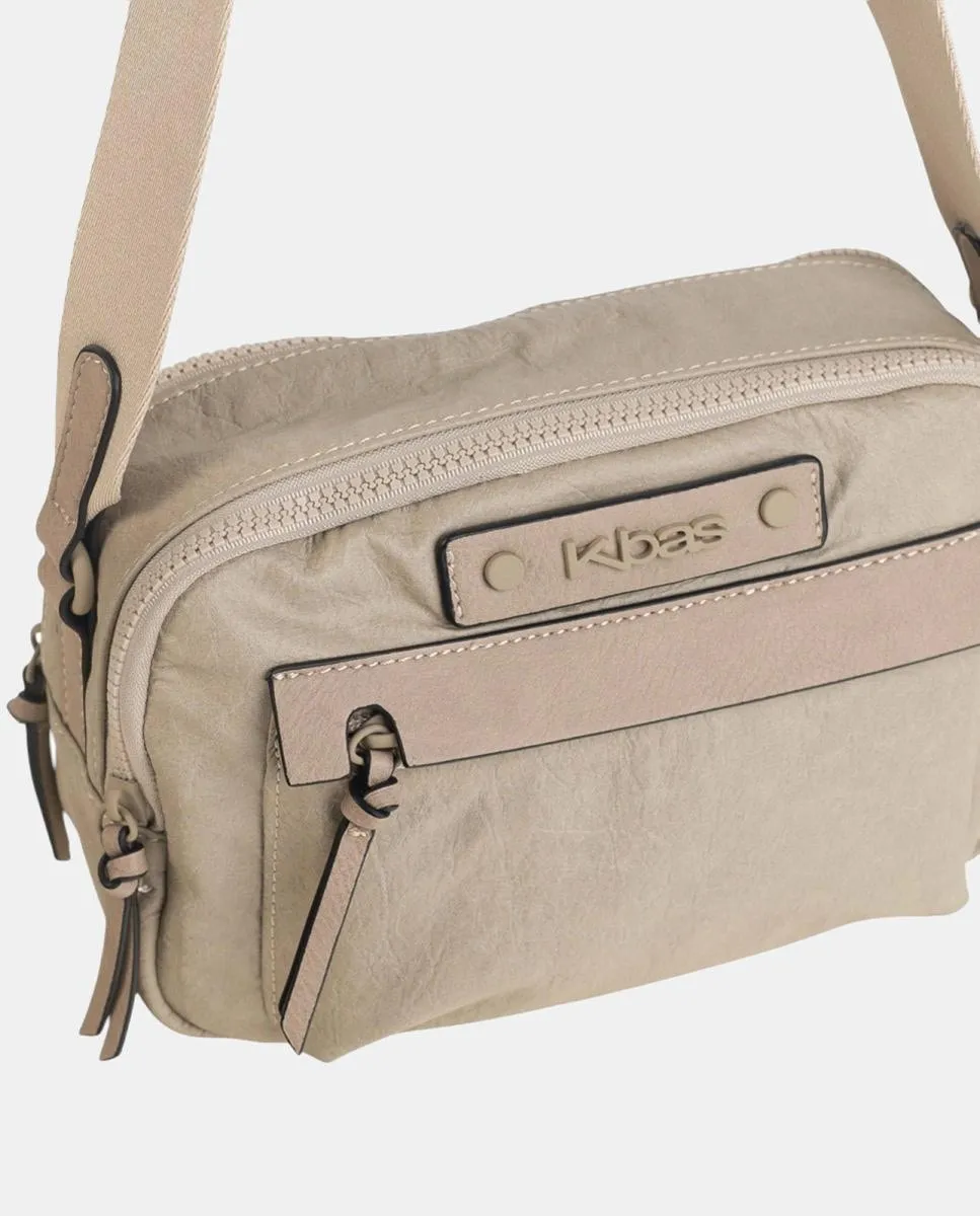 Сумка типа камера в каменном цвете из ПУ с эффектом помятости для создания ощущения мягкости и удобства, с тонкими швами, подчеркивающими ее структурированный силуэт. Ее дизайн включает в себя практичный передний карман на молнии, идеально подходящий для быстрого доступа к необходимым вещам. Также есть верхняя молния и задний карман на молнии. Имеется регулируемая плечевая ручка, обеспечивающая универсальность и комфорт. Все металлические элементы и логотип отделаны в тон сумки, чтобы придать современный вид.