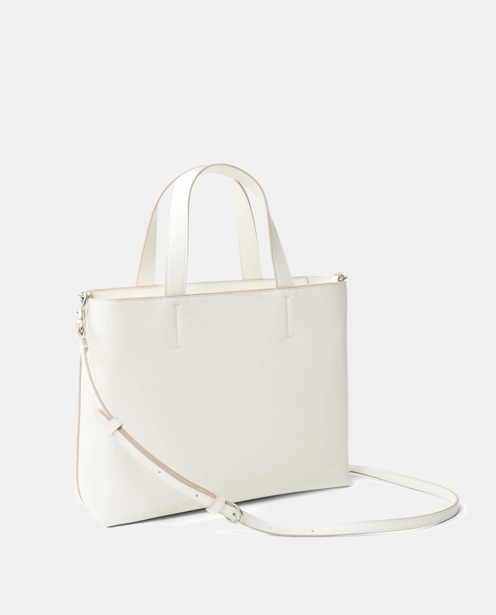 Небольшая женская сумка-тоут белого цвета. Застежка на молнии. Два ручки: одна для ношения в руке и одна регулируемая длинная.