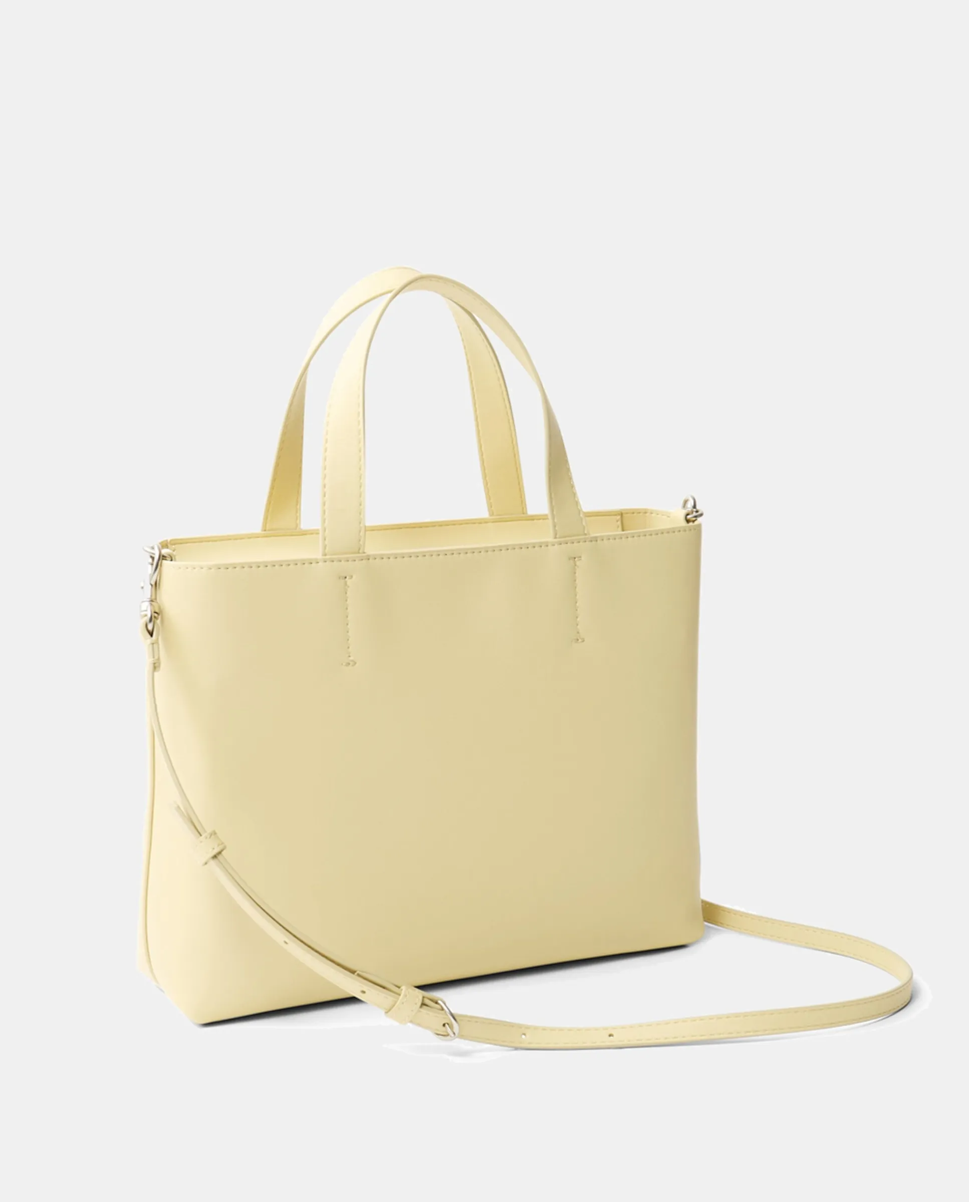 Маленькая женская сумка-тоут желтого цвета. Застежка на молнии. Два ручки, одна для руки и одна длинная регулируемая.