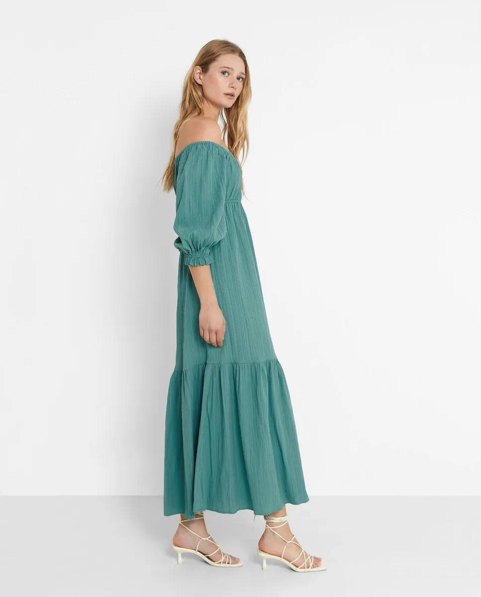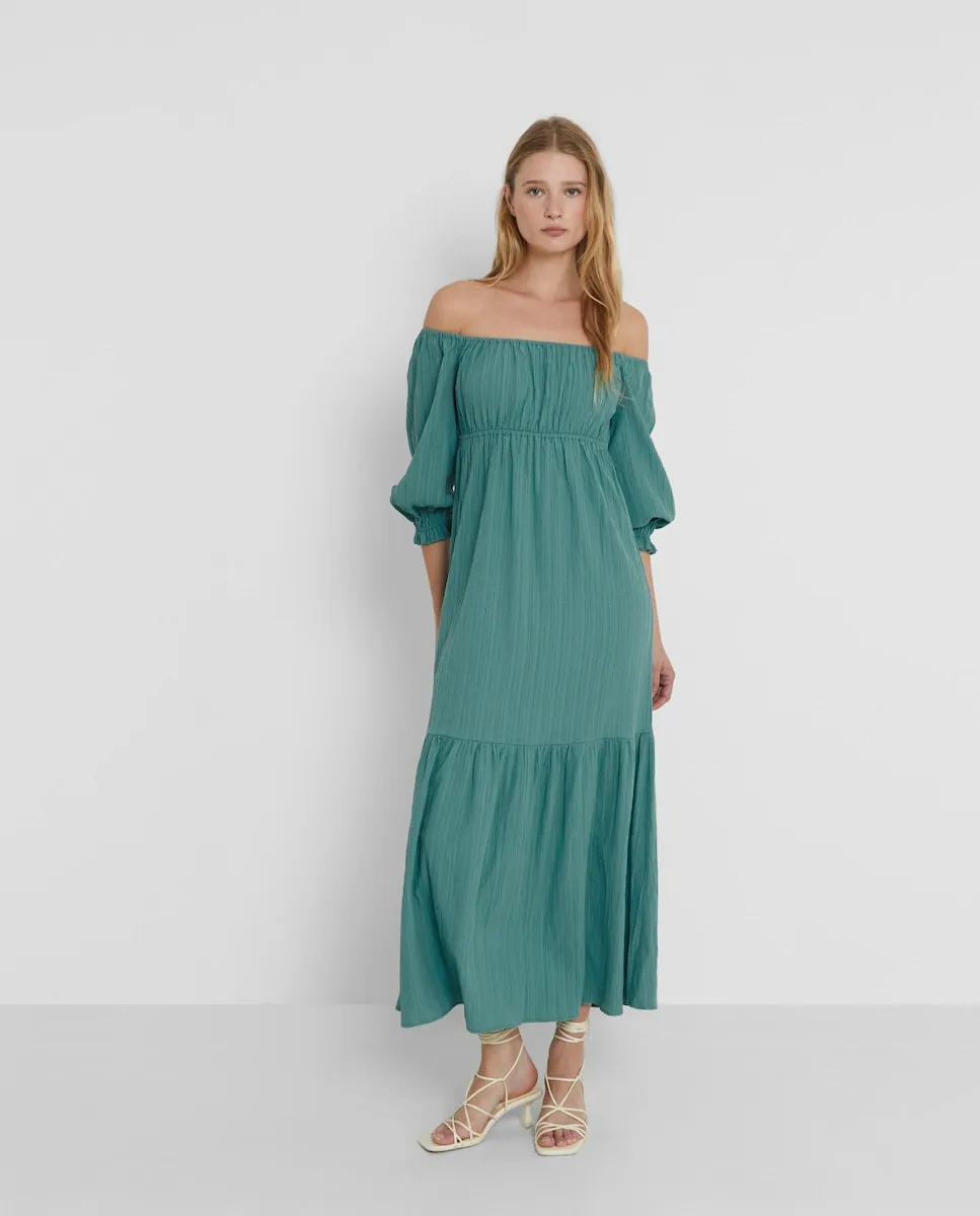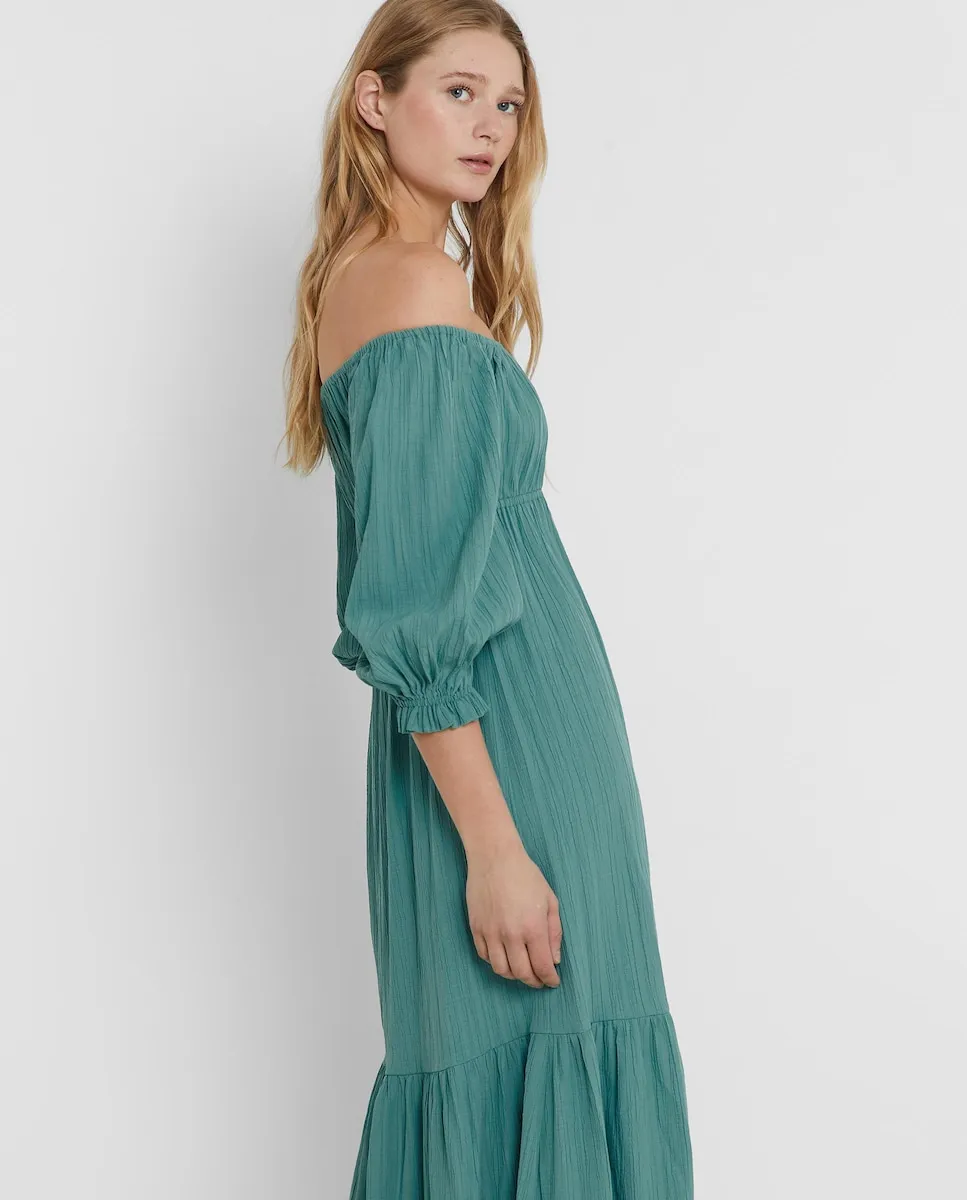 Зеленое миди-платье в богемном стиле. С вырезом в форме лодки и пышными рукавами, его легкая ткань и текстура делают его удобным и выгодным вариантом.