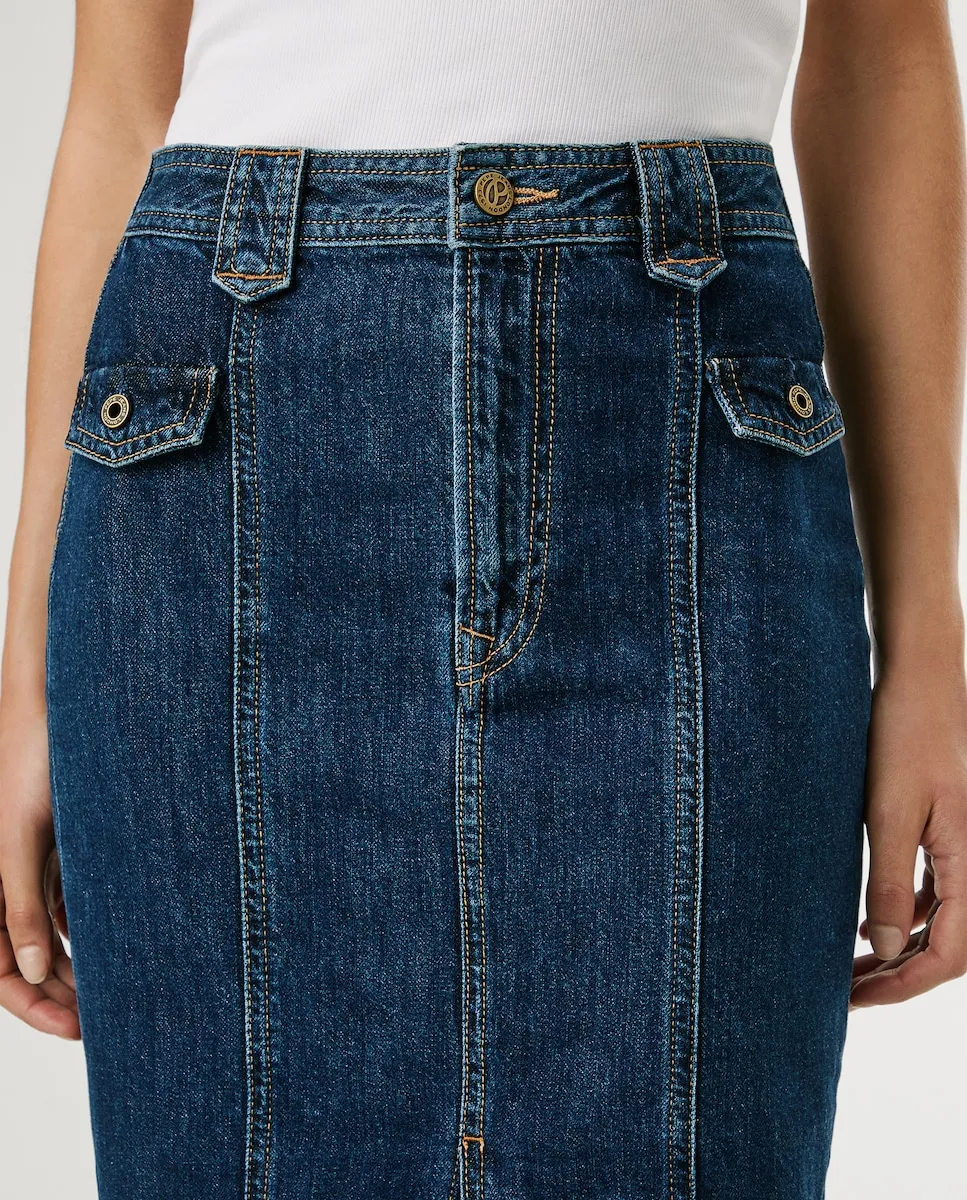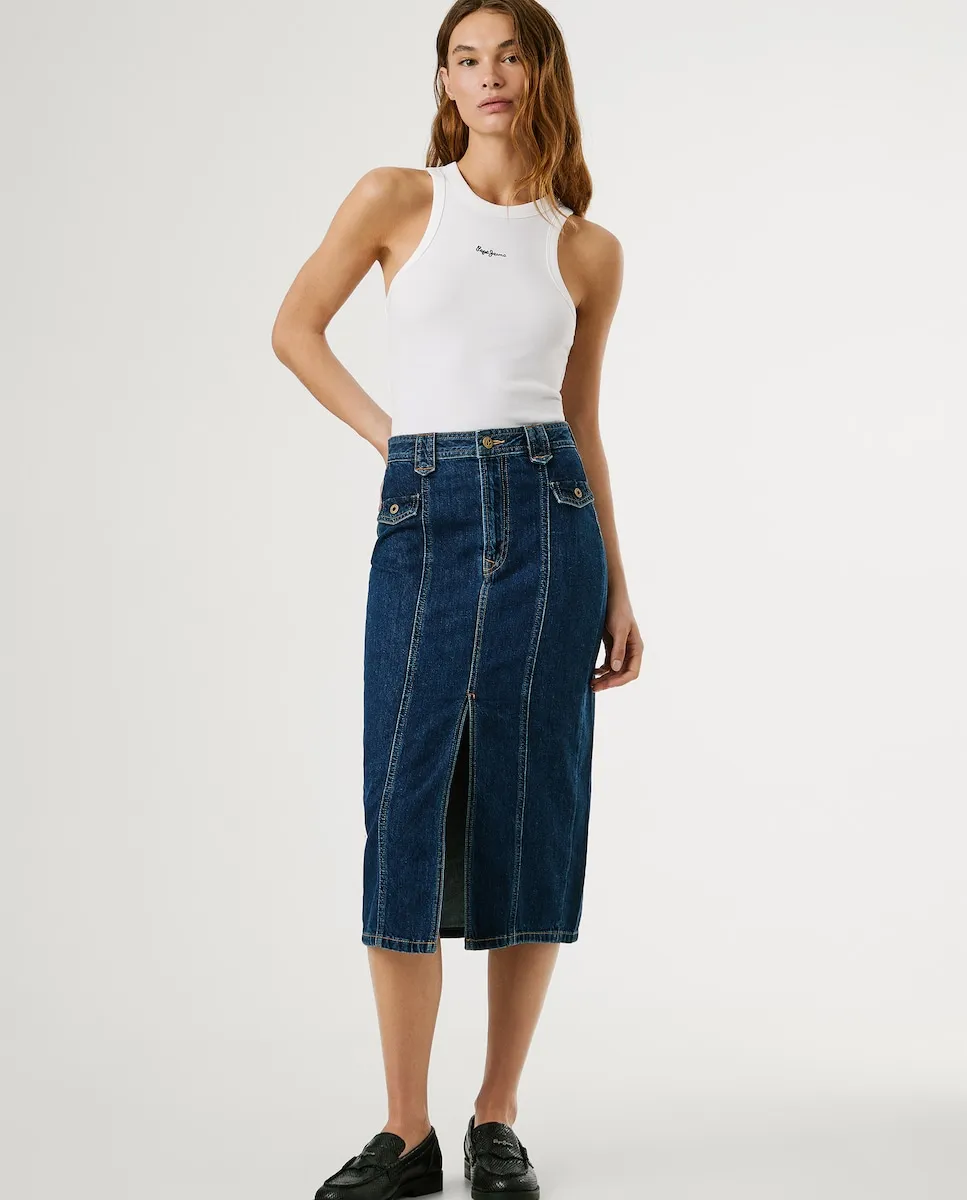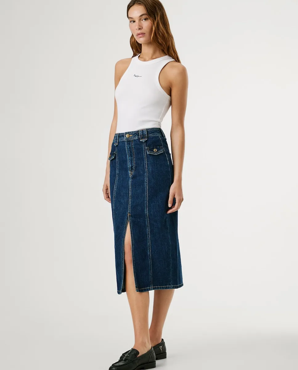 Миди юбка из жесткого денима и с узким кроем, высокой талией, боковыми клапанами с пуговицами, заметным разрезом спереди и широкими заметными петлями. Упакована в чистый темно-синий цвет, детальная строчка на задних карманах, металлические заклепки с гравировкой и металлическая табличка с логотипом PEPEJEANS на заднем кармане. Изготовлена как минимум из 20% переработанных материалов и других устойчивых тканей.