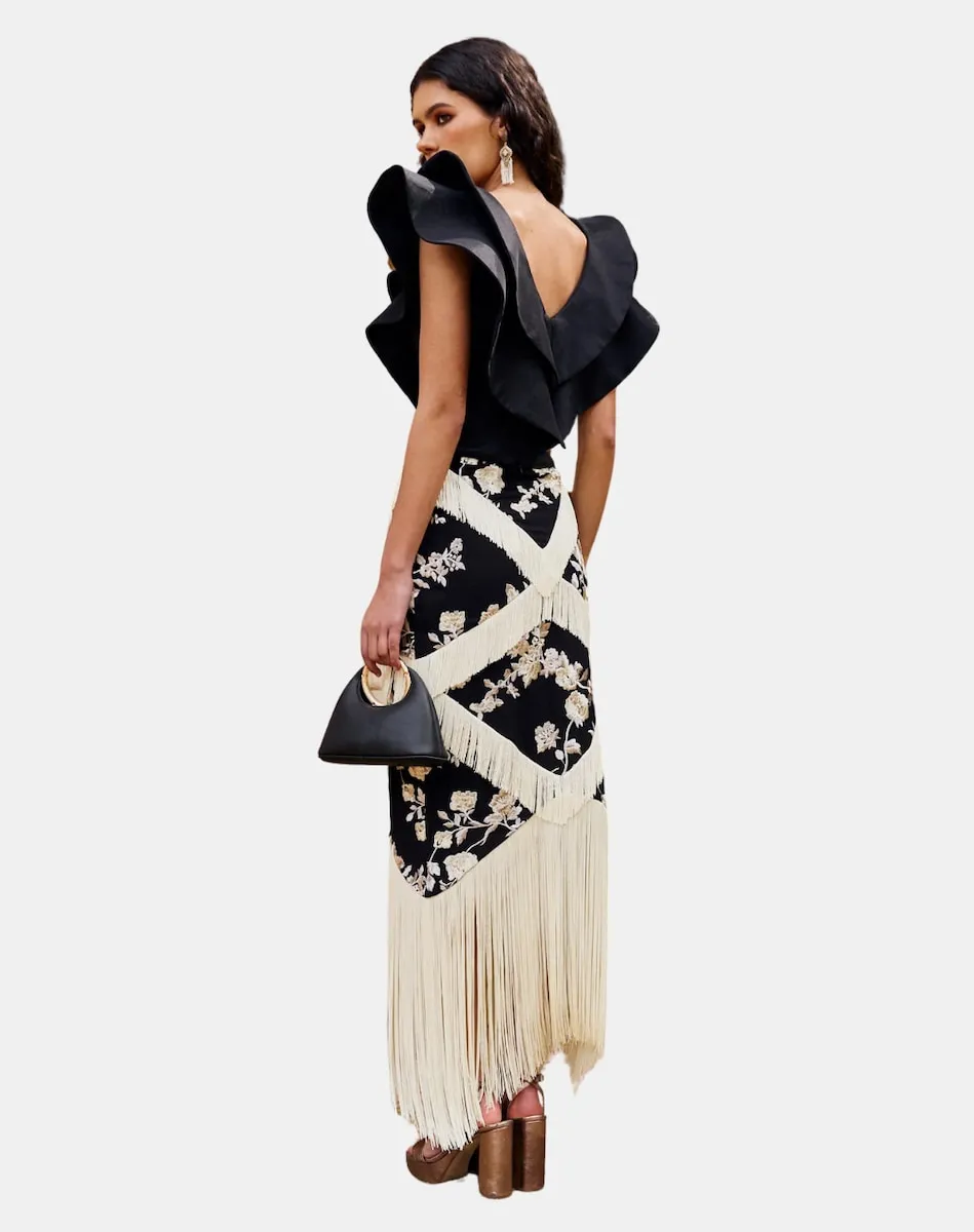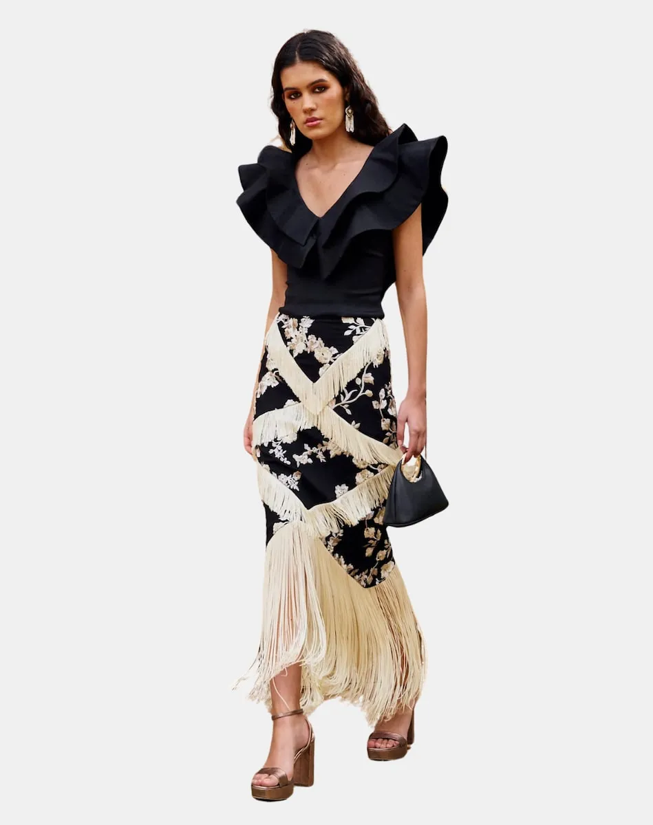 Откройте для себя нашу юбку Адела Чёрного цвета. Эта эффектная юбка миди сделана из вискозы высокого качества с вышивкой цвета икры, которая выделяется своим невероятным дизайном с бахромой двух разных размеров, проходящей зигзагом по всей юбке донизу, придавая ей подлинный и особенный вид. Кроме того, юбка имеет заднюю молнию и подкладку для лучшей посадки и комфорта. Вы можете сочетать её с нашим топом Азусена, оба товара продаются отдельно, но мы рекомендуем их совместную покупку для полноценного образа. Эта юбка была тщательно сшита портными в Испании. Мы рекомендуем её для свадеб днём и вечером, крестин, причастий, выпускных, праздников и особых мероприятий. Состав: 80% вискоза, 20% полиэстер.