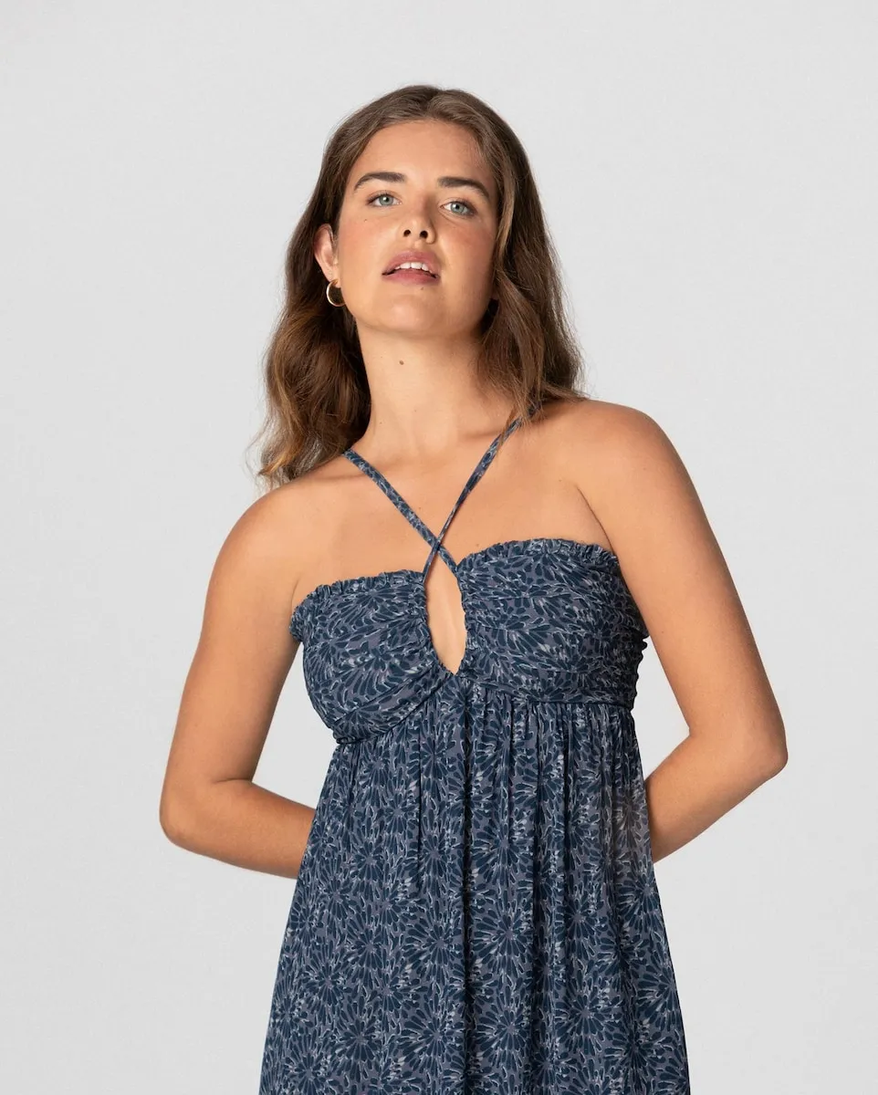 Это мини-платье выделяется своим принтом в синих тонах и завязкой на шее, которая обеспечивает идеальную и комфортную посадку. Сшито из свободной и легкой ткани, оно придает естественное движение изделию. Идеально для теплых дней и прекрасно сочетается с любыми из наших сандалий.