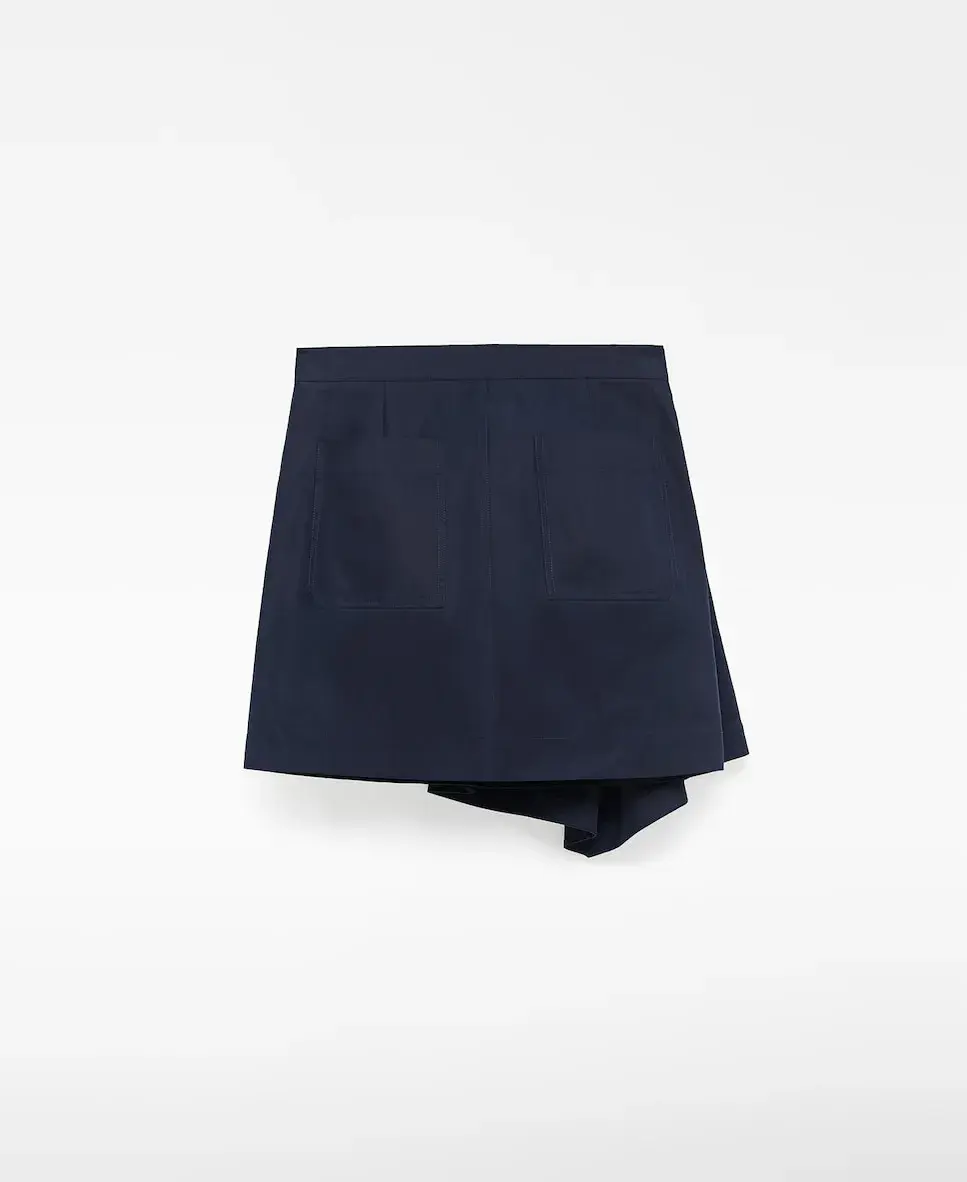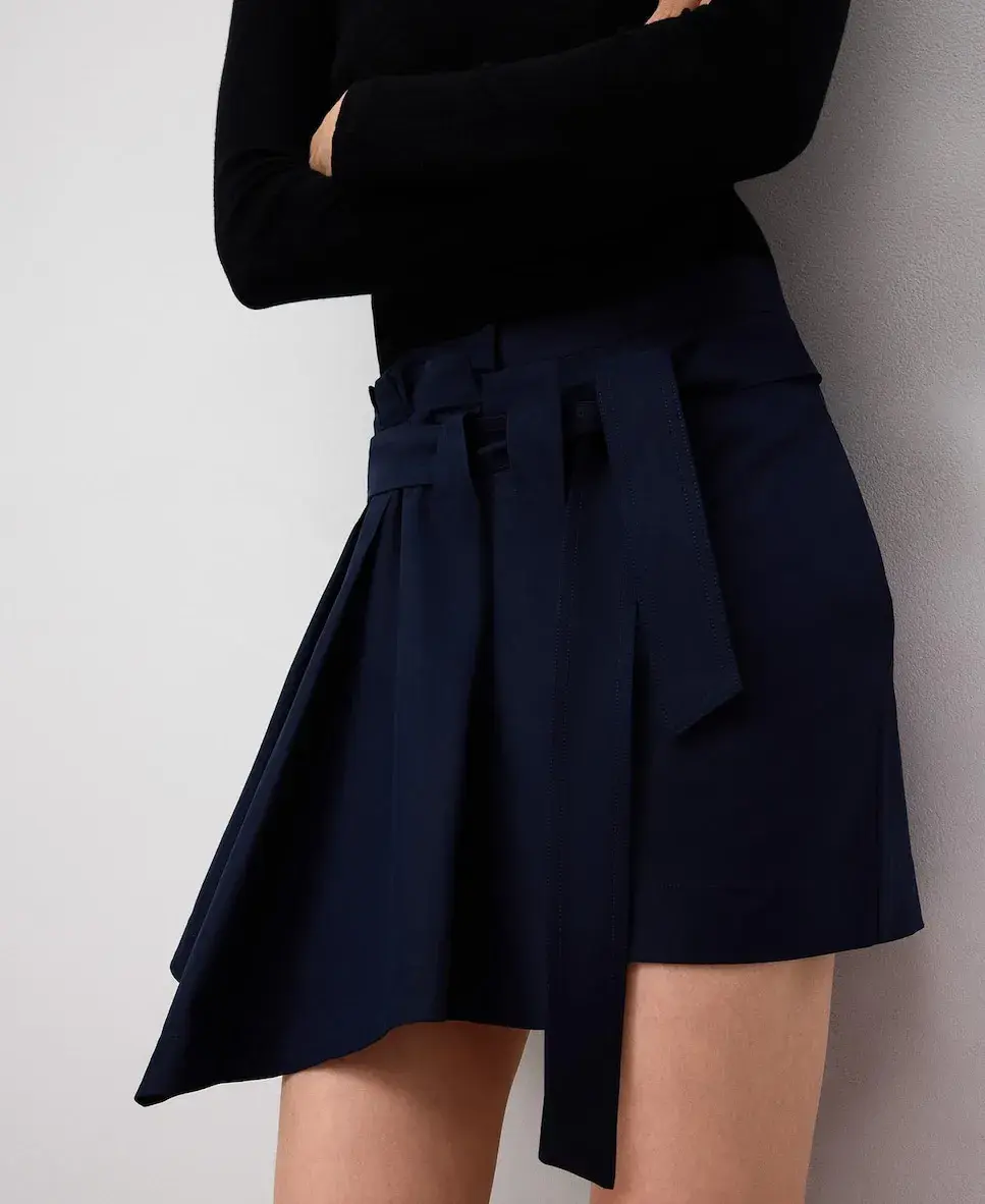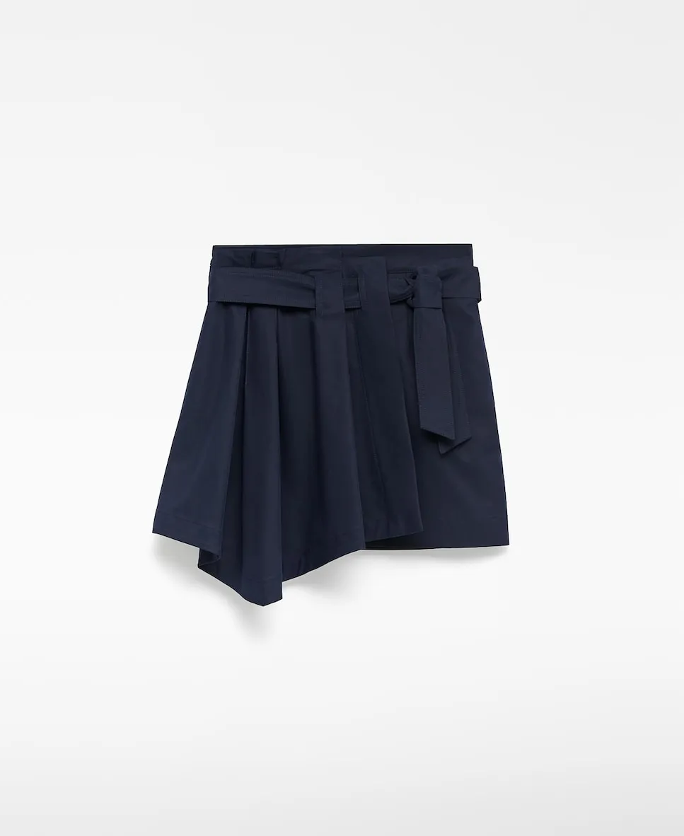 Мини-юбка с драпировкой спереди. Имеет пояс, завязывающийся сбоку, и накладные карманы на спине.