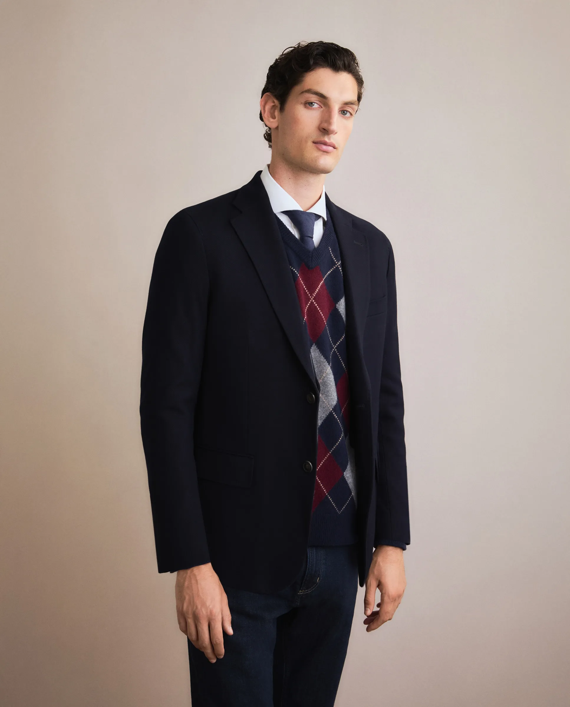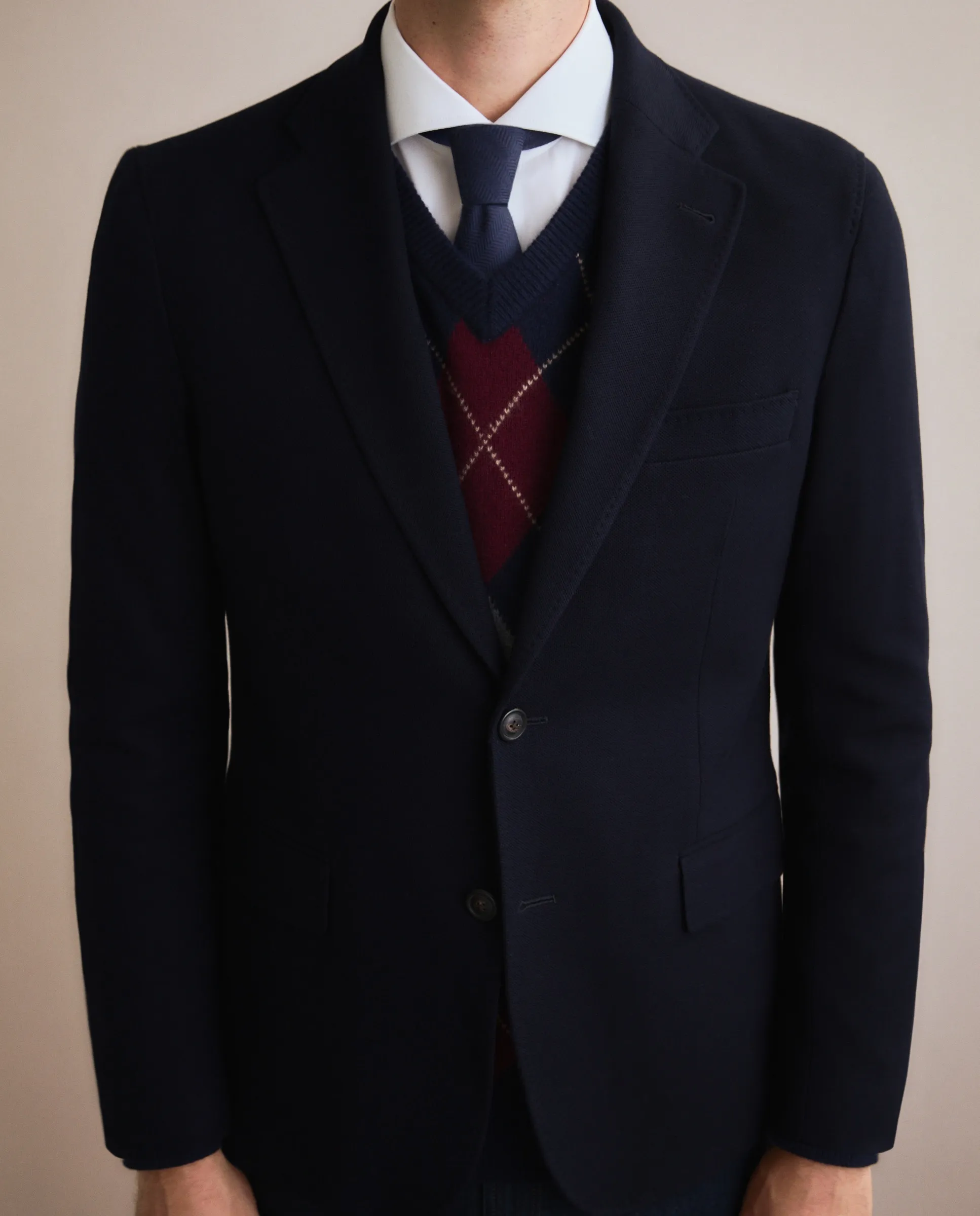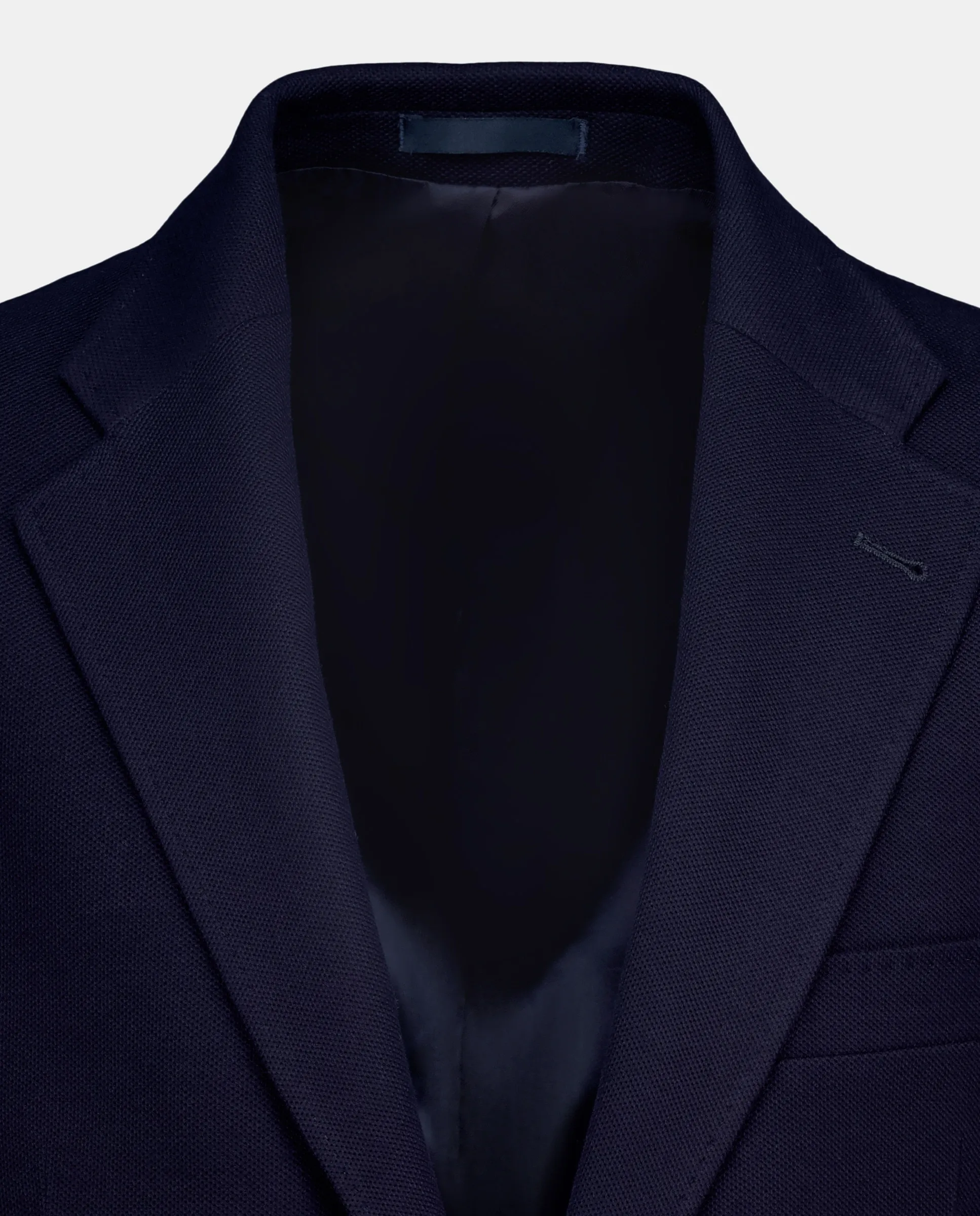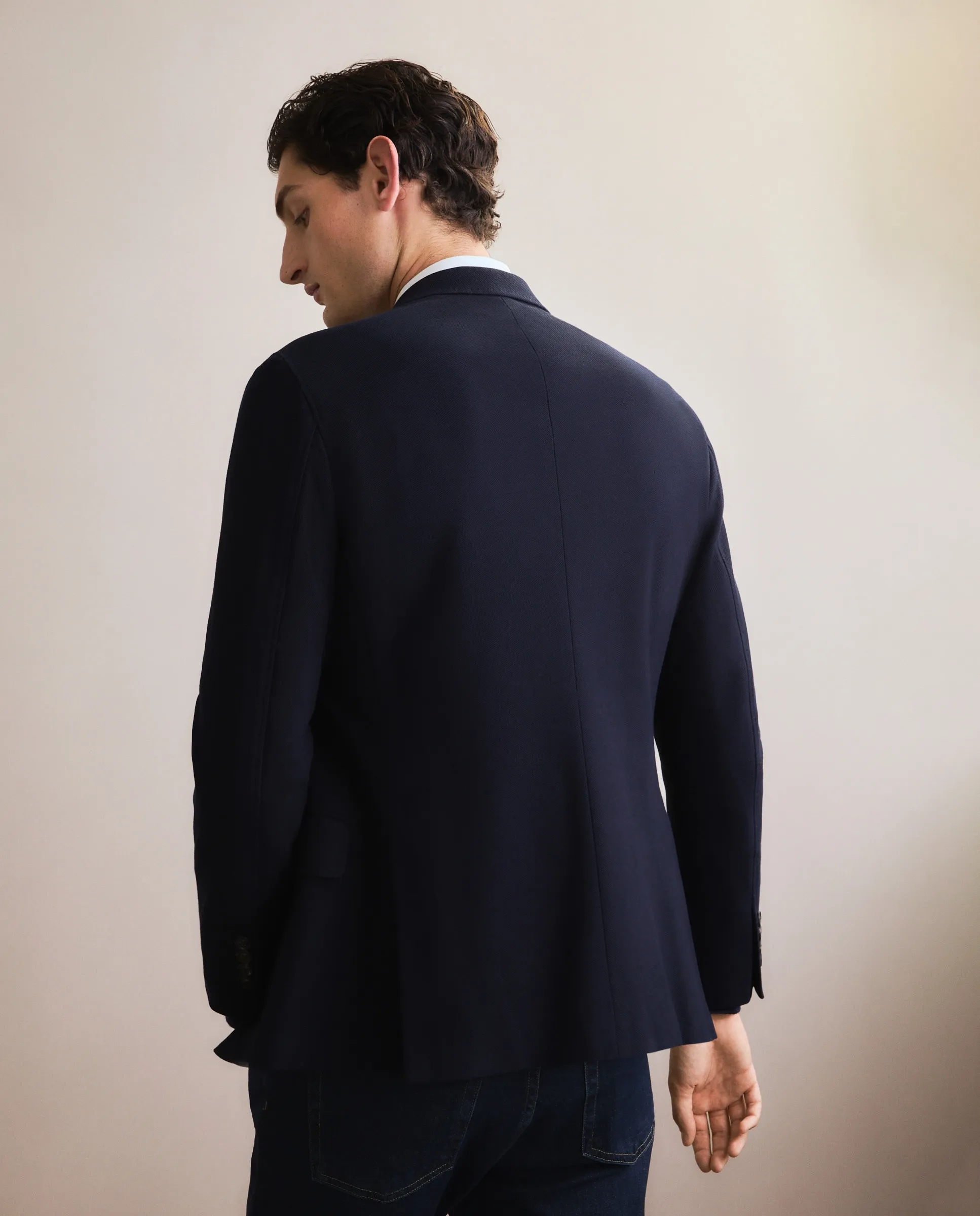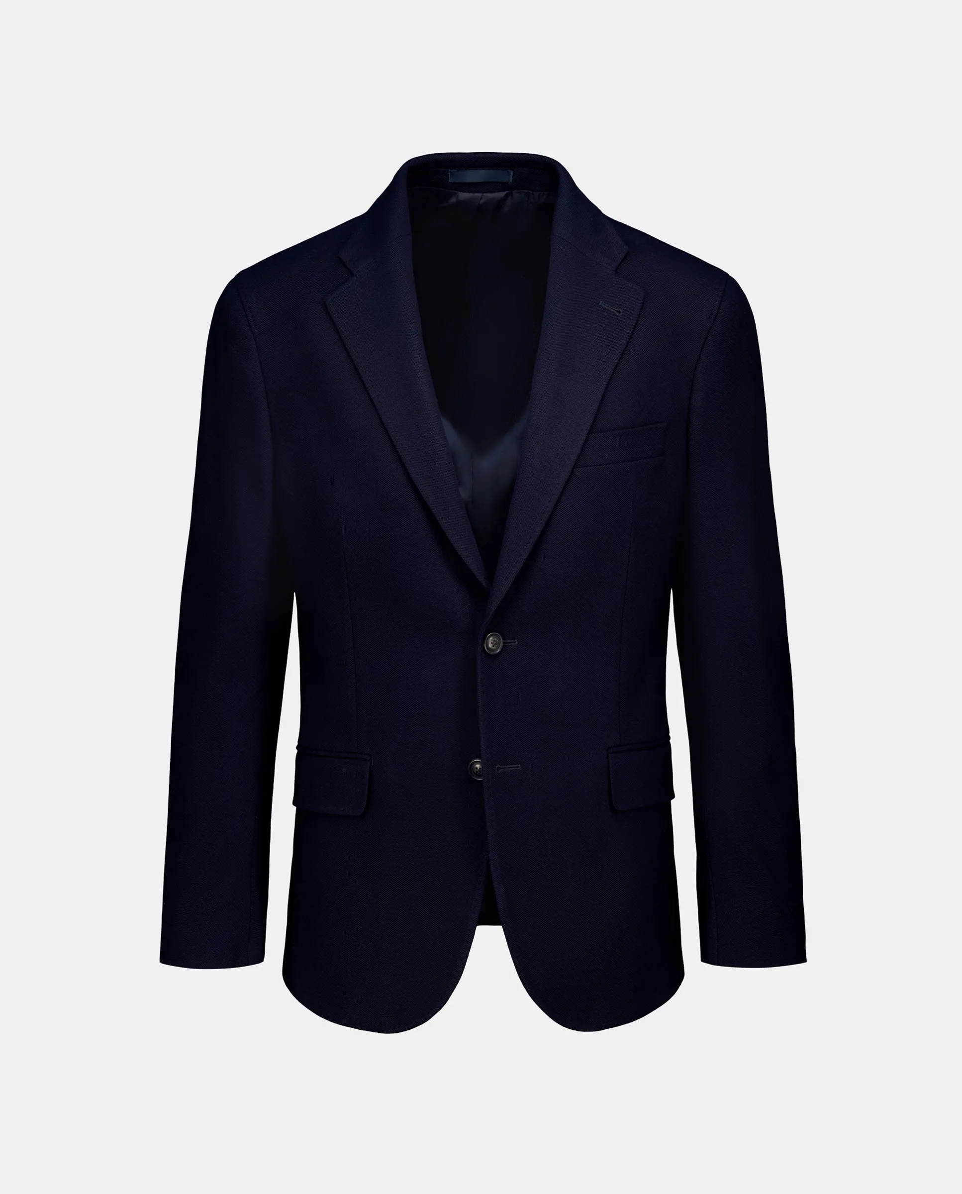 Тёмно-синяя трикотажная жакет, один ряд, две пуговицы, два разреза, прямые карманы, подкладка
