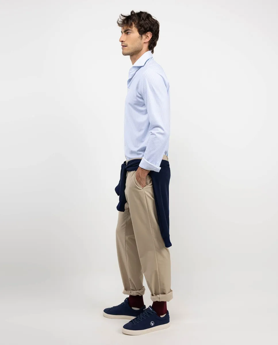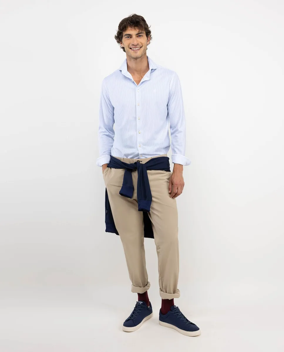 Мужская рубашка в полоску Yale с технологией Sepiia, выполненная на 100% из перерабатываемого антимикробного технического полиэстера. Приталенный силуэт, воротник на пуговицах и застежка на пуговицы. Длинные рукава с простым манжетом и вышитый логотип на груди контрастного цвета. Имеет вытачки на спине, что позволяет слегка адаптироваться к телу, сохраняя комфорт. Укрепленный шов плеча для предотвращения износа. Закругленный подол. Эти ткани были произведены в Испании, а изделия были изготовлены в Португалии устойчивым способом.