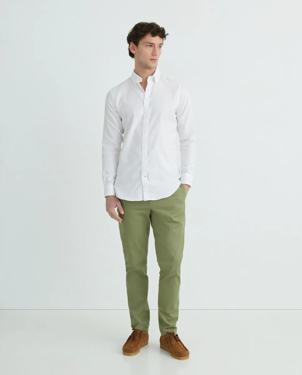 Спортивная рубашка slim fit из 100% хлопка без глажки, однотонная, синяя, с застежкой на пуговицу и с манжетами.