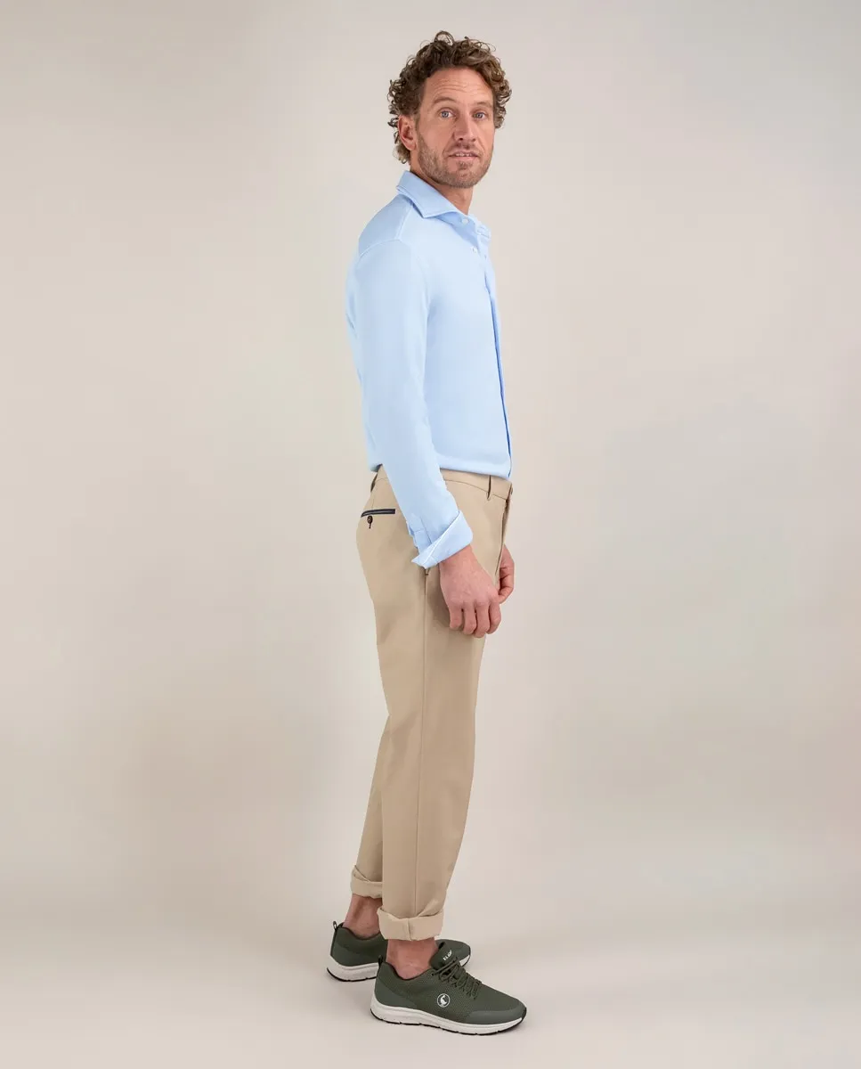 Рубашка для мужчин, выполненная из технологии Sepiia, изготовленная на 100% из перерабатывающегося антибактериального технического полиэстера. Стиль Slim Fit, воротник buttondown и застежка на пуговицах. Длинные рукава, заканчивающиеся простым манжетом, и вышитый логотип на груди контрастного цвета. Имеет разрезы на спине, что позволяет немного подстраиваться под тело, сохраняя комфорт. Укрепленный шов плеча для предотвращения износа при эксплуатации. Закругленный подол. Эти ткани были произведены в Испании, а изделия были сшиты в Португалии устойчивым образом.