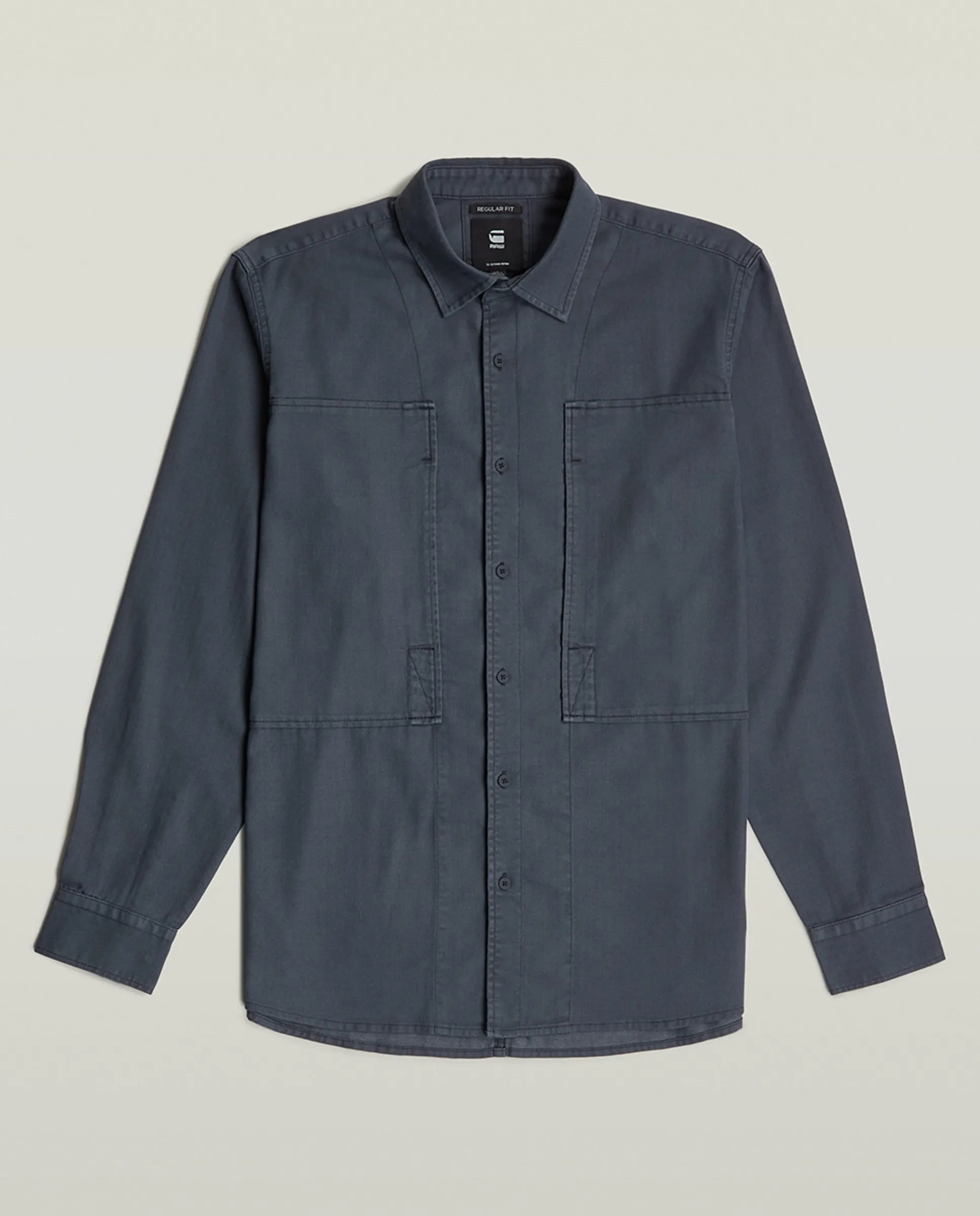 Карманы с панелями на рубашке имеют прямой срез и карманы с панелями спереди.