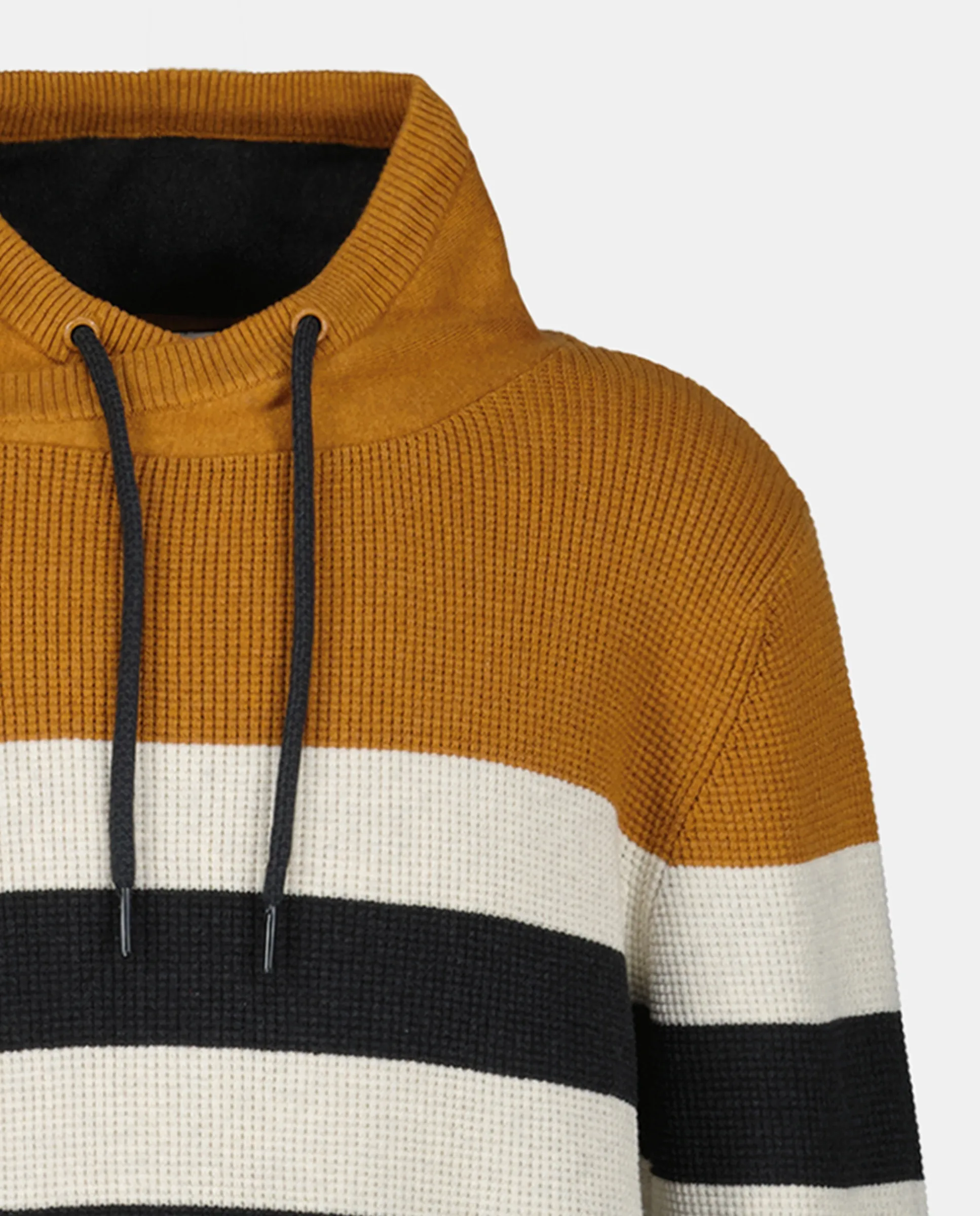 Мужской свитер с воротником-лодочкой. Он из рубчатого трикотажа на 100% хлопке. У него есть полосатый дизайн на уровне груди.