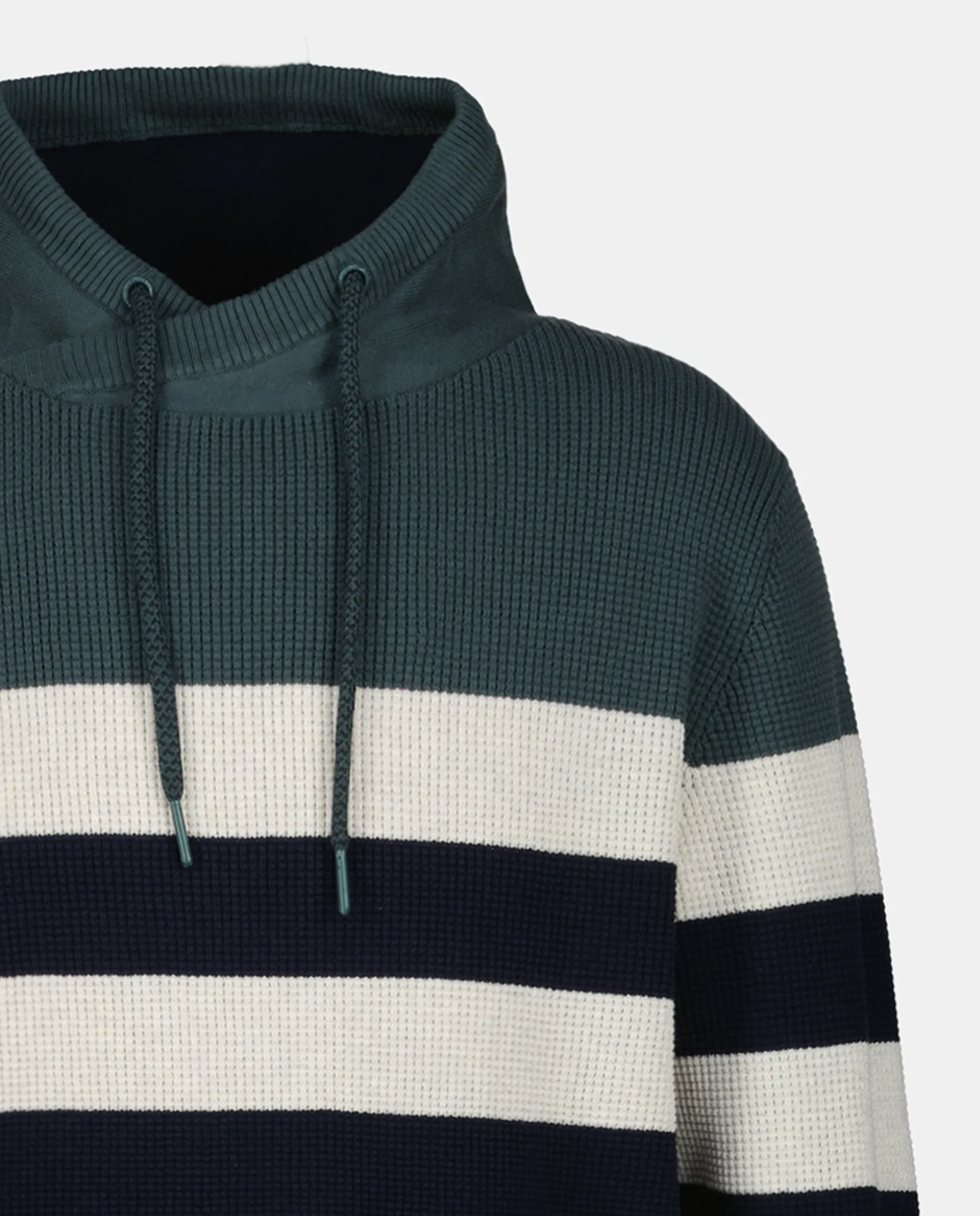 Мужской свитер с воротником-лодочкой. Он из рубчатого трикотажа на 100% хлопке. У него есть полосатый дизайн на уровне груди.