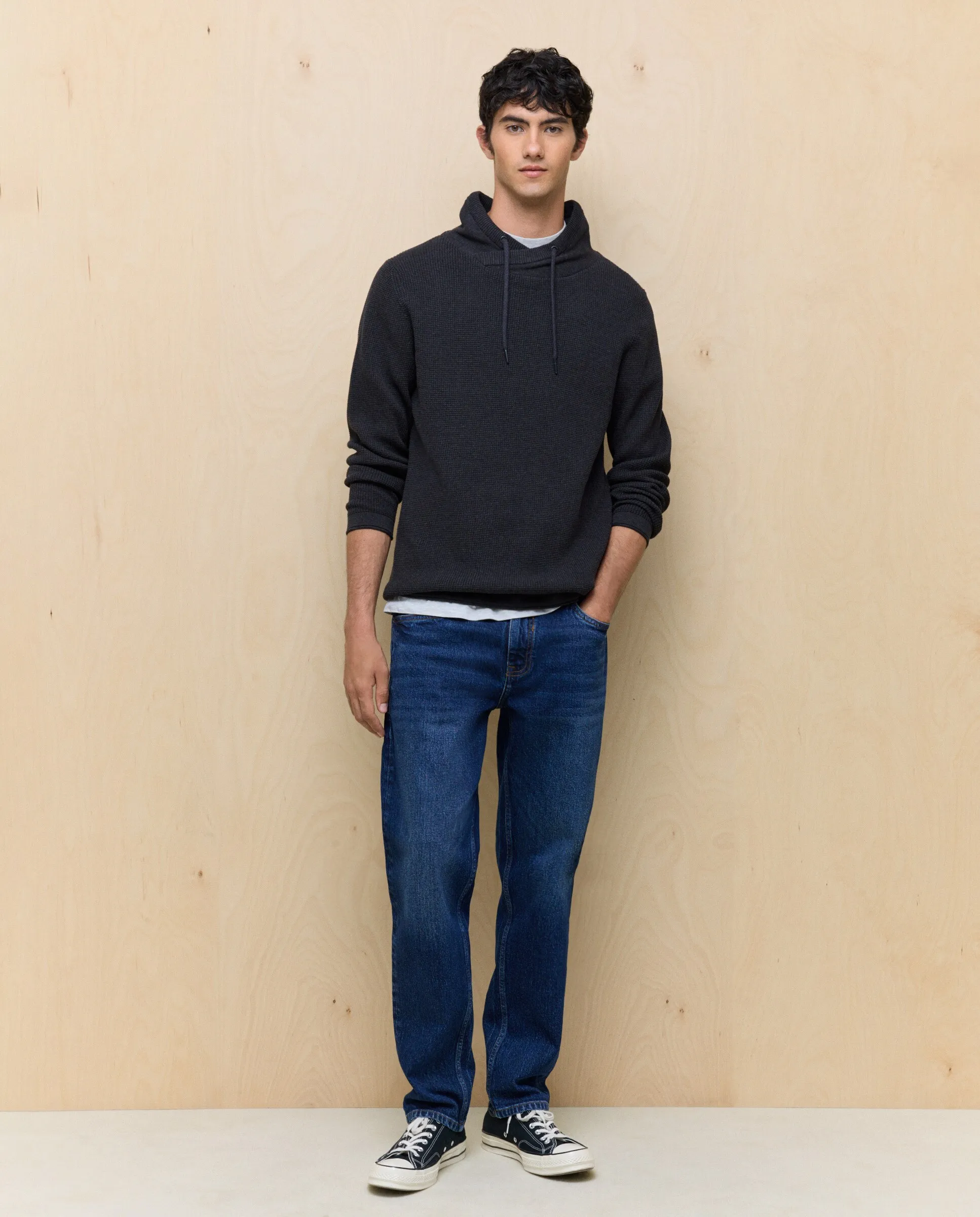 Мужской свитер с воротом-поло. Он выполнен из 100% хлопкового вязаного материала. Он однотонного цвета.
