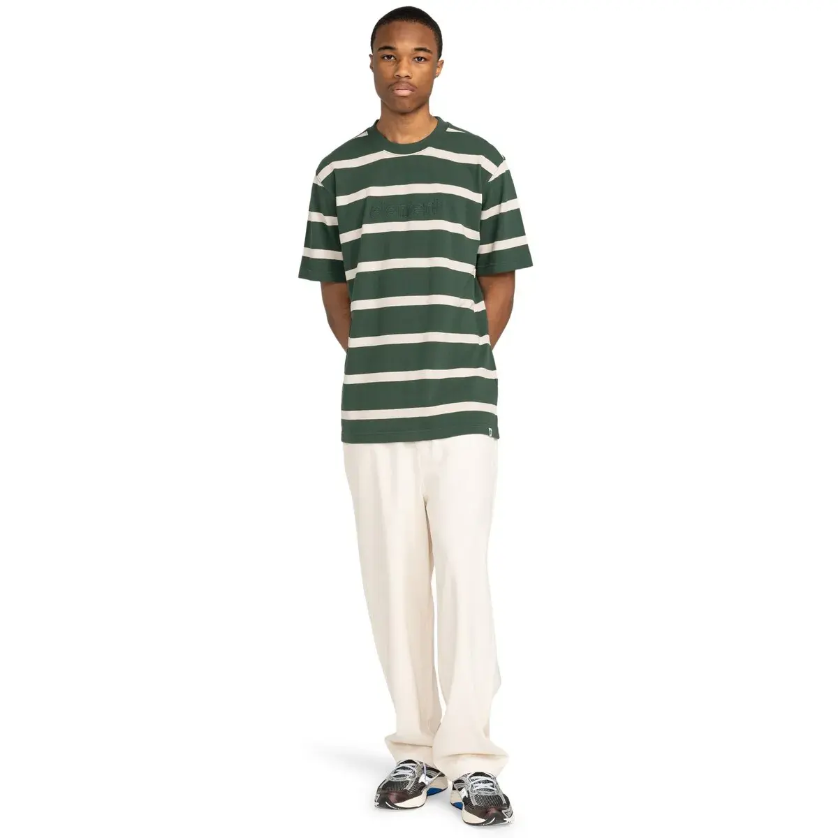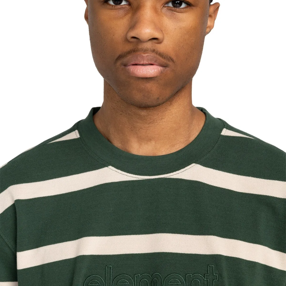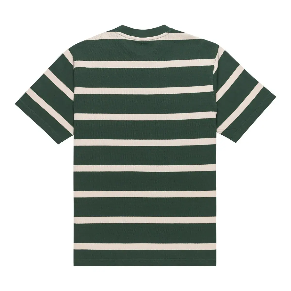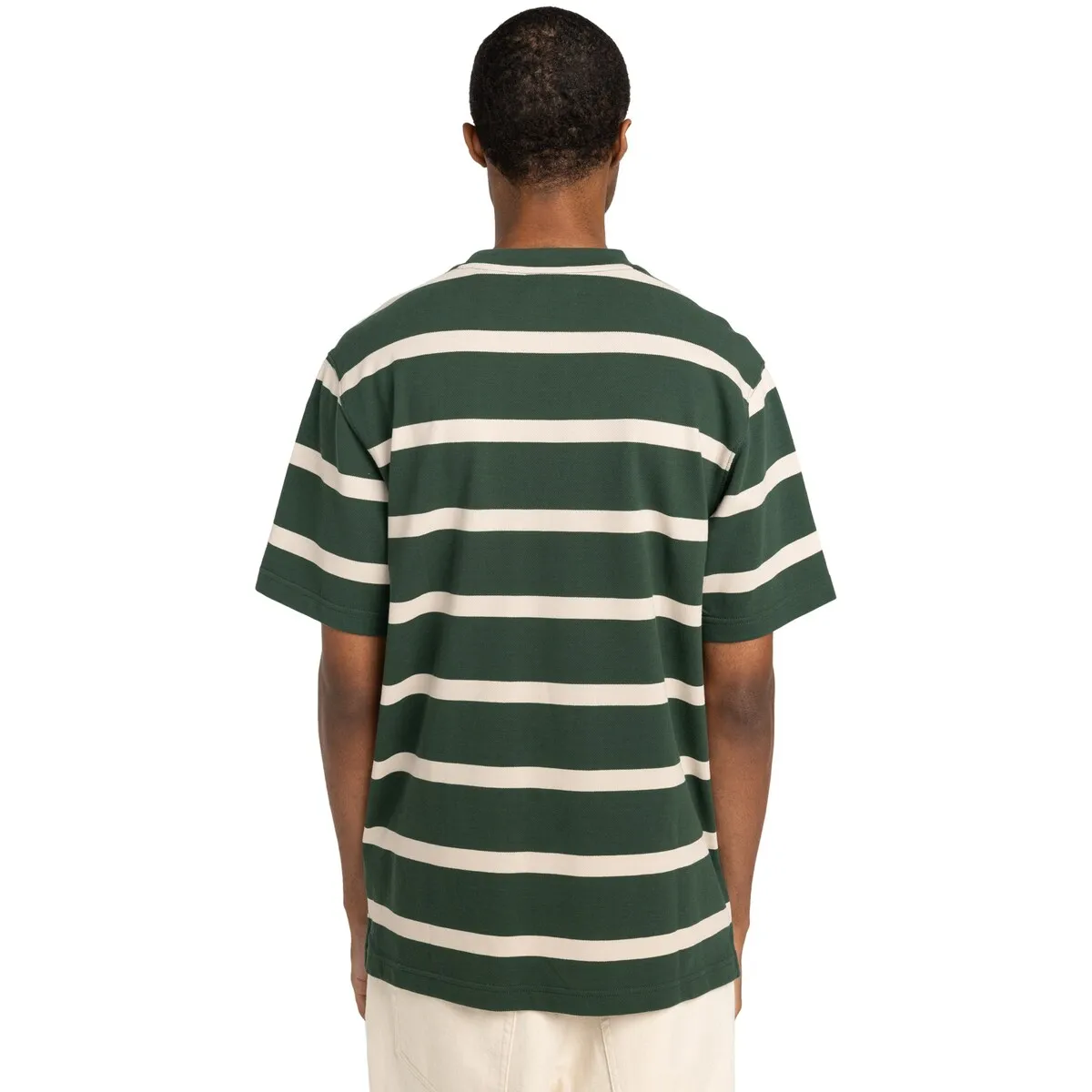 Футболка с коротким рукавом для мужчин. Характеристики включают: Коллекция: основная линия, Ткань: ткань пике из джерсейного трикотажа из 100% органического хлопка [240 г/м2], Осознанность по природе: Органический хлопок GOTS, Крой: свободный, Воротник: круглый, Рукава: короткий рукав, Застежка: без разрезов, Бренд: корпоративная вышивка на груди., Другие характеристики: боковые вентиляции в нижней части с отделкой из полосатой ленты и детали из блоков цвета на теле и рукавах.