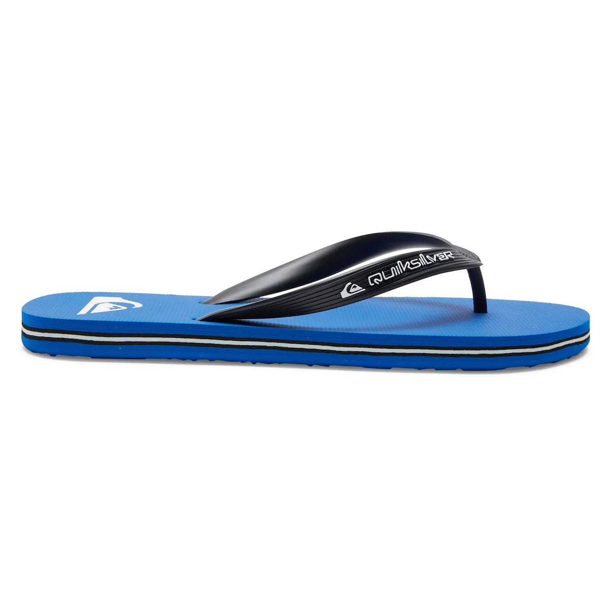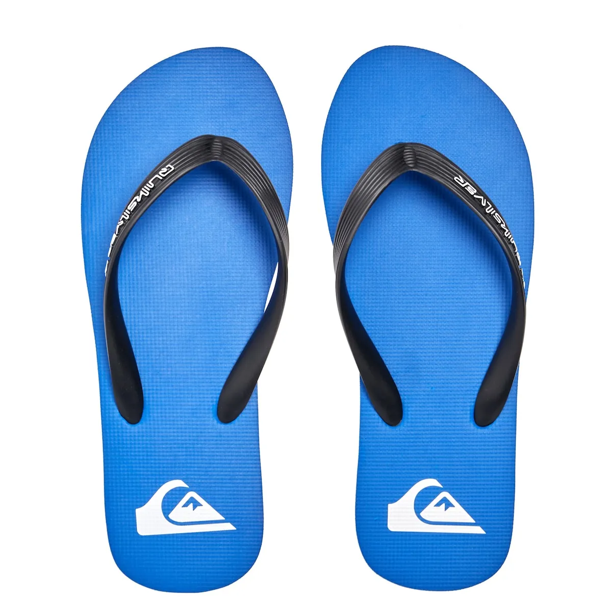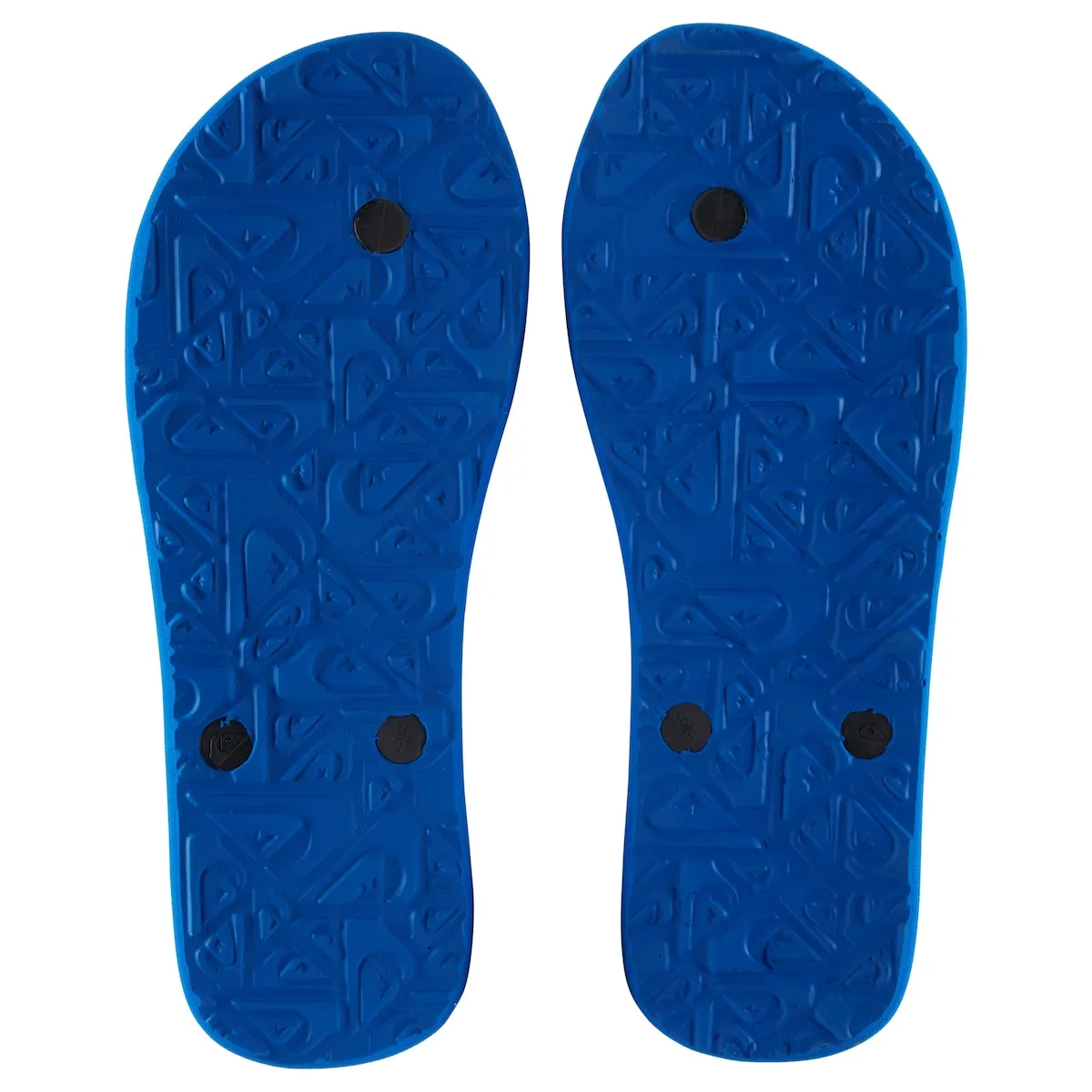 Сандалии для мужчин. Характеристики включают: Верх: синтетический материал, Стелька: нескользящая стелька с текстурой, Ремешки: гибкий ремешок из синтетической резины с тремя точками, Подошва: резиновая подошва с противоскользящей текстурой с многоугольными выемками и логотипом для лучшего сцепления, Подкладка: тонкие линии в координатных ярких цветах по бокам подошвы и Бренд: надпись Quiksilver и логотип Mountain Wave.