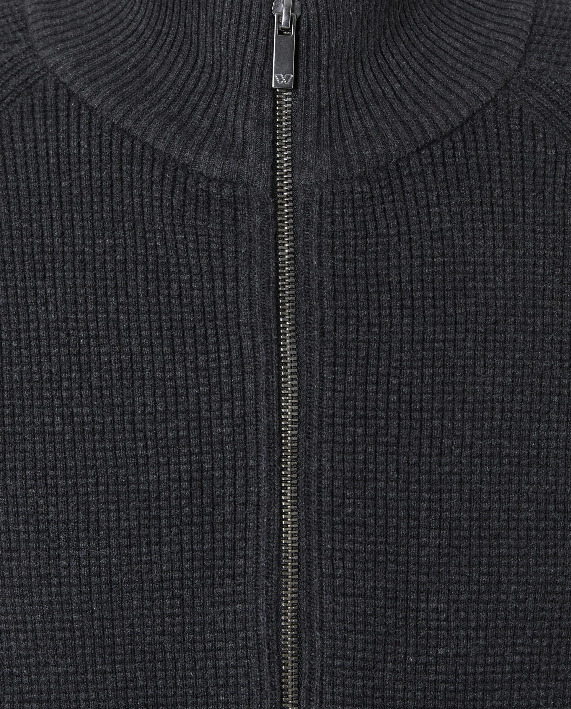 Мужской кардиган на молнии. Он выполнен из 100% хлопкового трикотажа с эффектом вафель. Он однотонного меланжевого цвета.