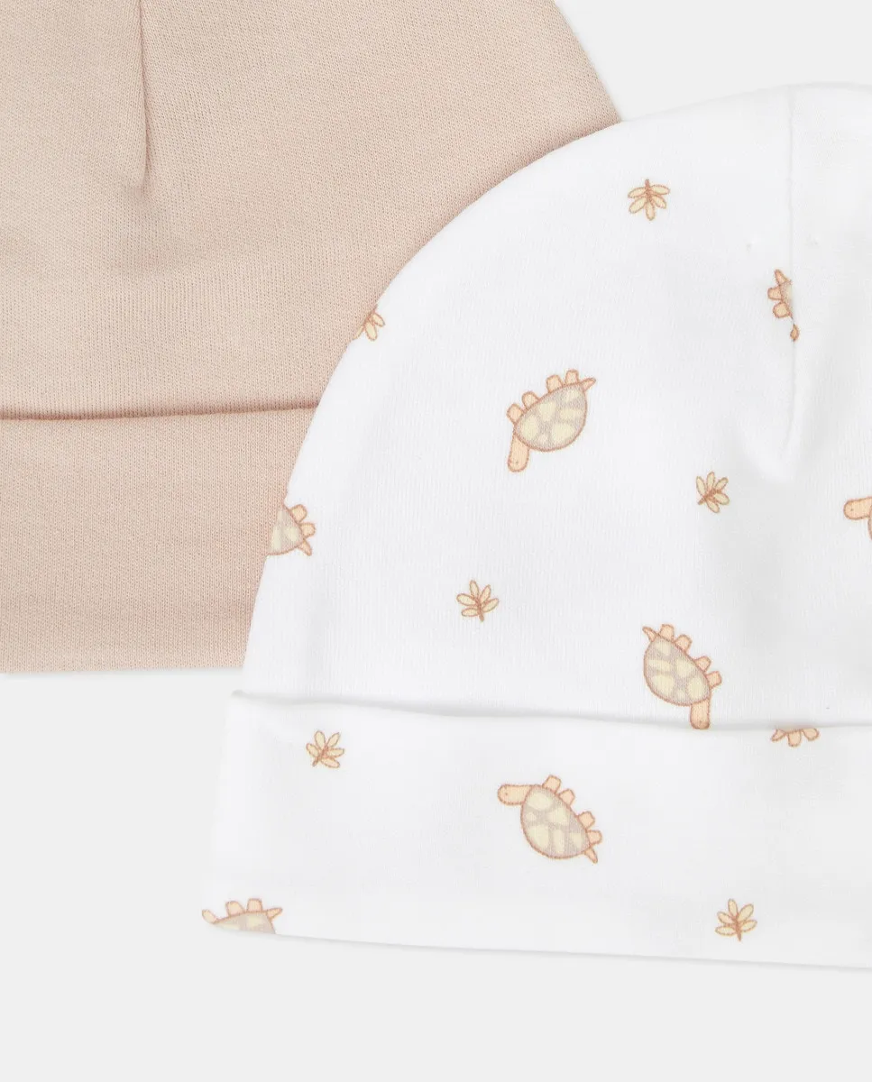 Набор, состоящий из двух шапок: одной однотонной и одной с принтом.