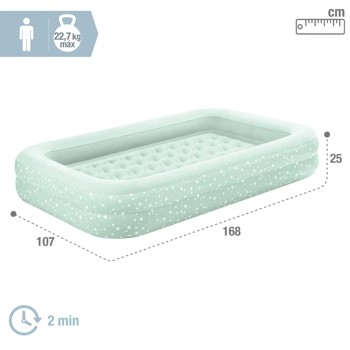 Этот надувной детский матрас Intex предназначен для детей от 3 лет. Размер 107x68x25 см, выдерживает до 22,70 кг. Детский матрас съемный и позволяет удобно разместить простынь. Кроме того, его поверхность с бархатным покрытием устойчива к воде и приятна на ощупь. В комплект входит ручной насос и сумка для транспортировки. - Надувной детский матрас Intex с бархатной поверхностью и защитным бортиком от падений - Размеры надувного матраса: 107x168x25 см, размеры спального места: 69x132x10 см - Матрас съемный из надувной конструкции, подходит для стандартных простыней - Включает ручной насос, дорожную сумку для транспортировки и комплект с заплаткой для латания проколов - Устойчив к воде, рекомендуется для детей от 3 до 8 лет.